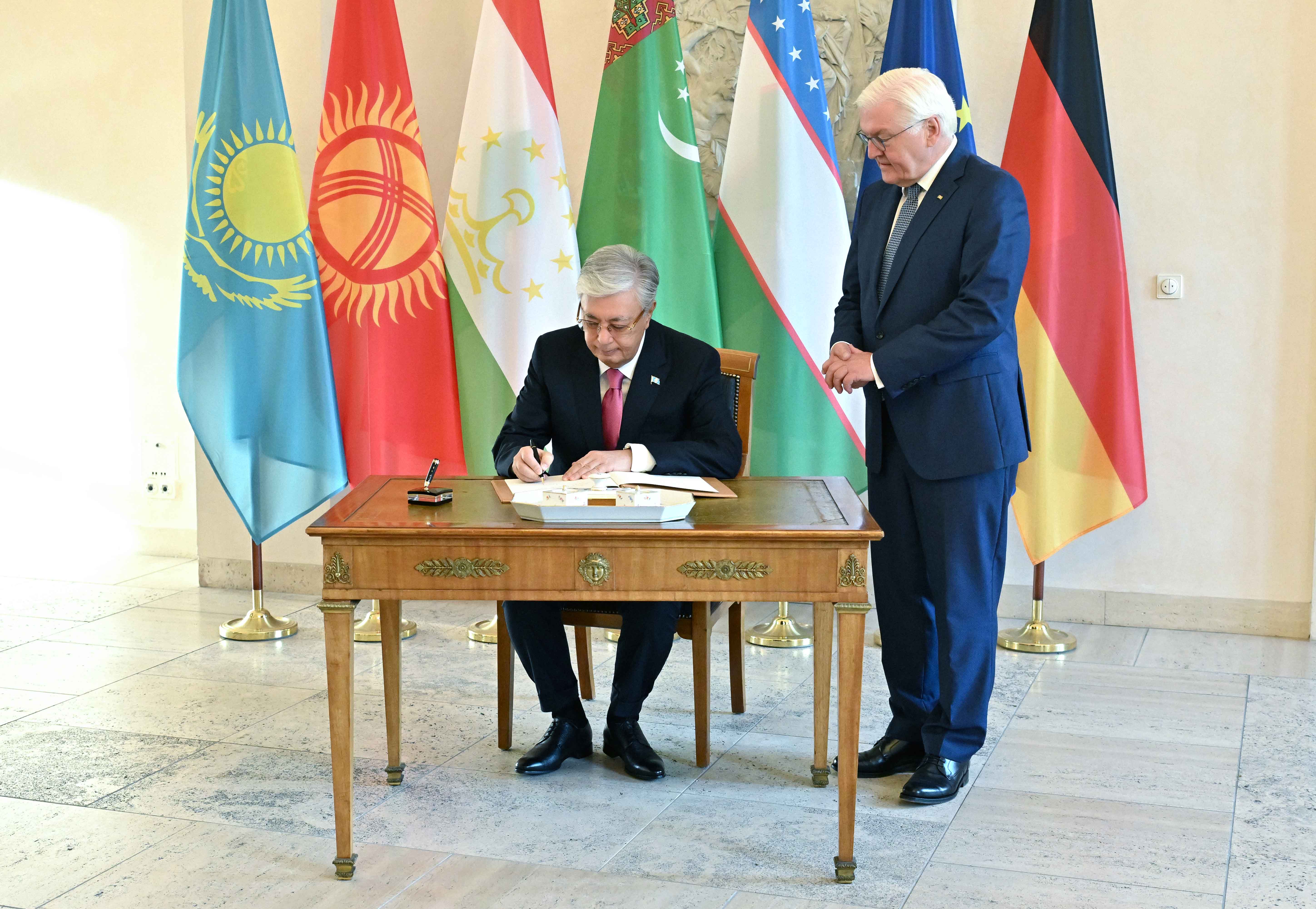 Мемлекет басшысы Германия Президентінің Bellevue резиденциясындағы Құрметті қонақтар кітабына естелік қолтаңба қалдырды.
