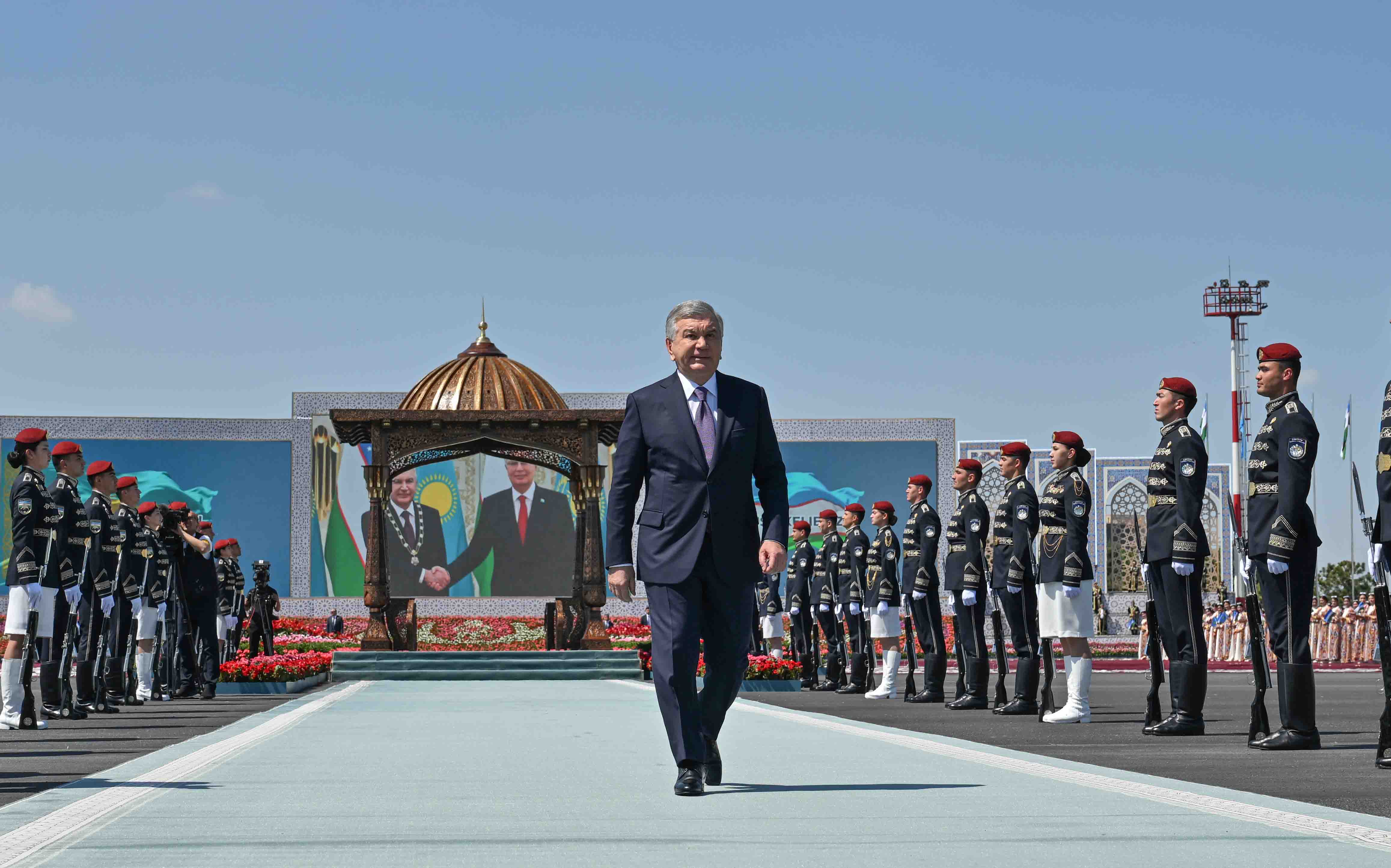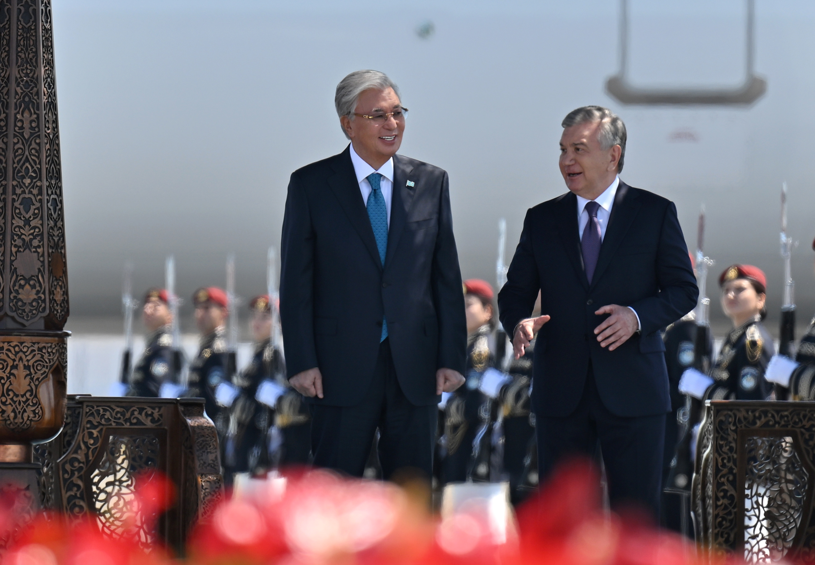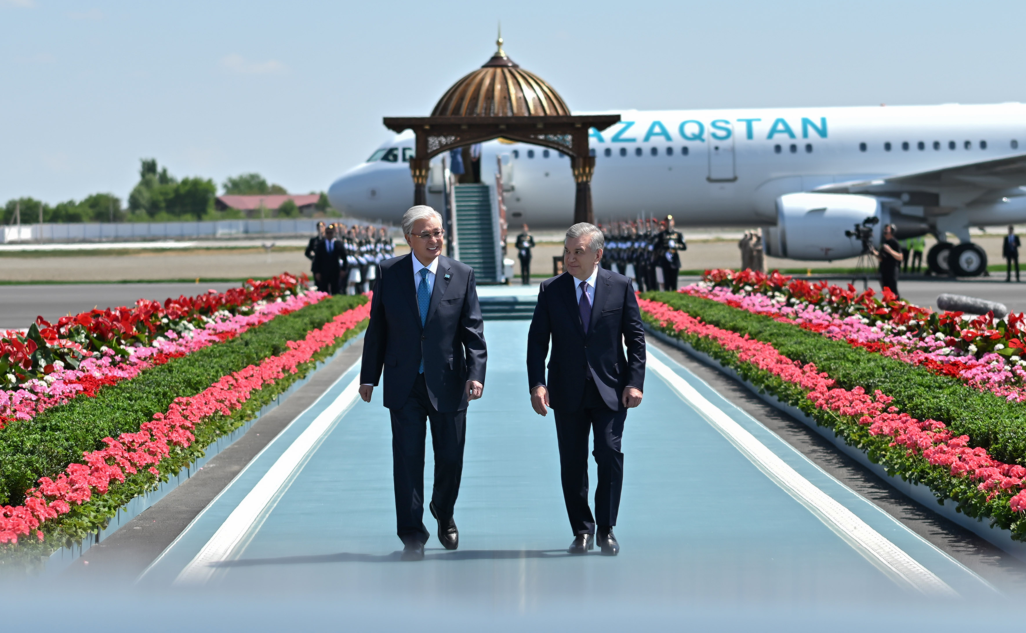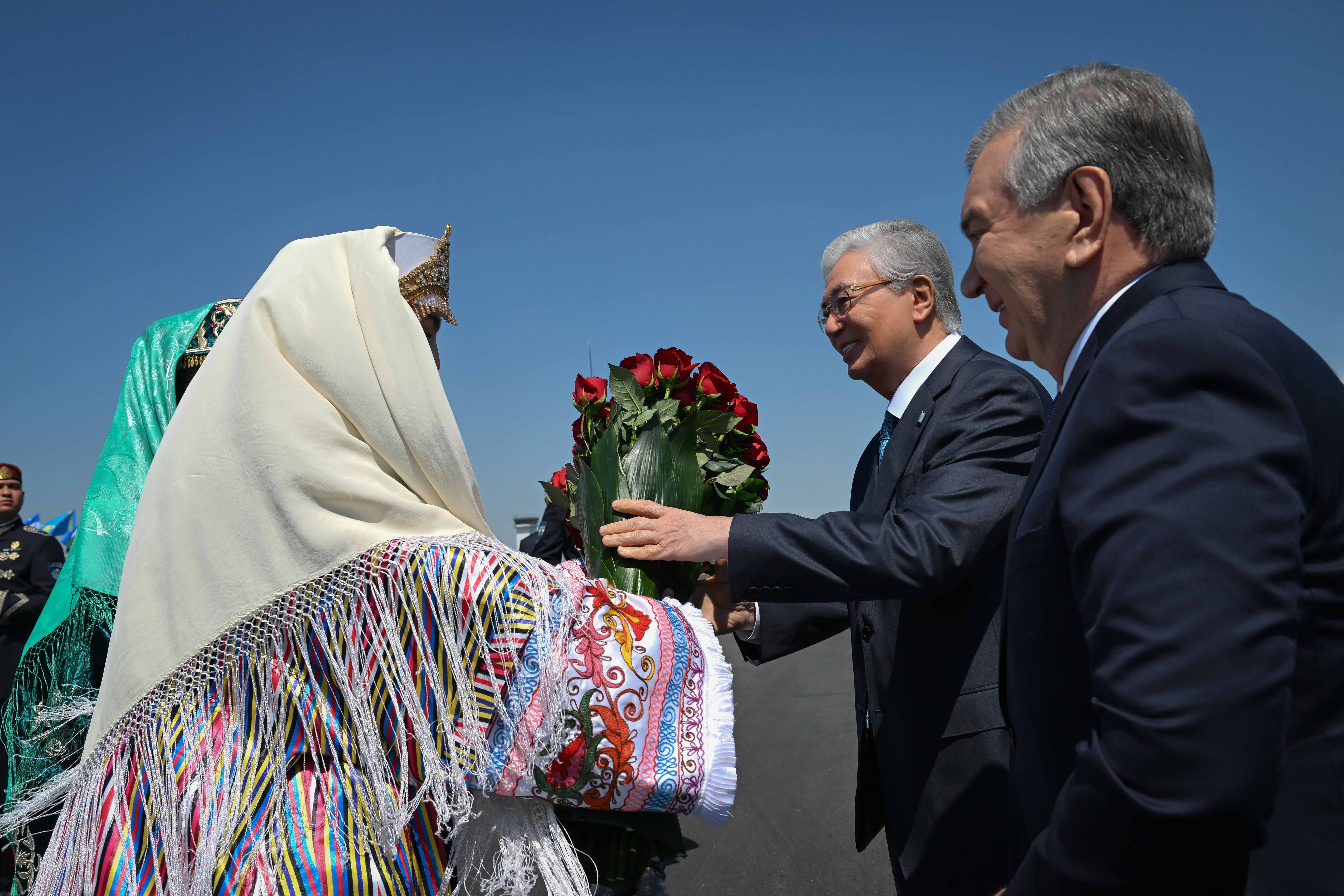 Бұхара қаласының әуежайында мәртебелі мейманды Өзбекстан Президенті Шавкат Мирзиёев қарсы алды.