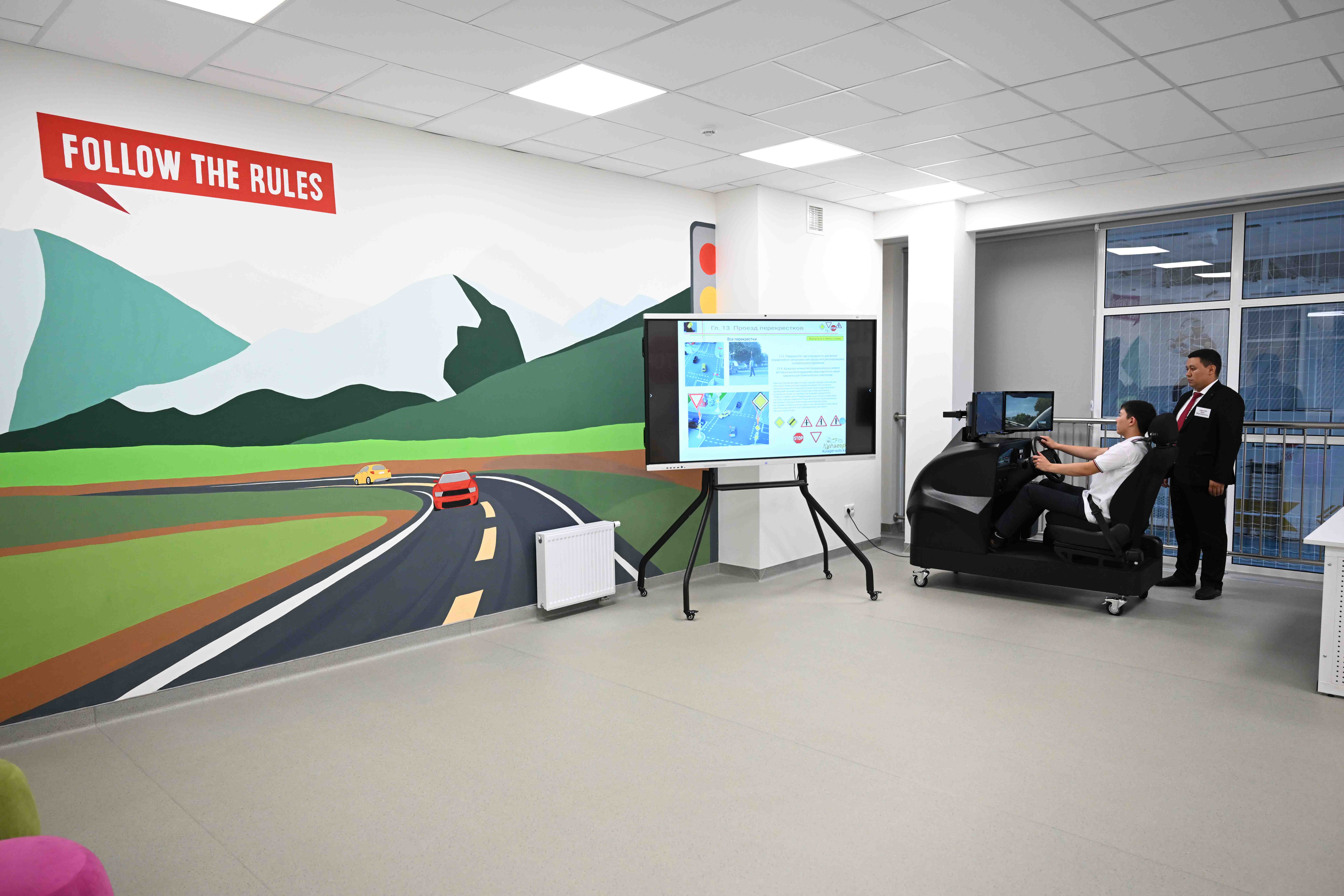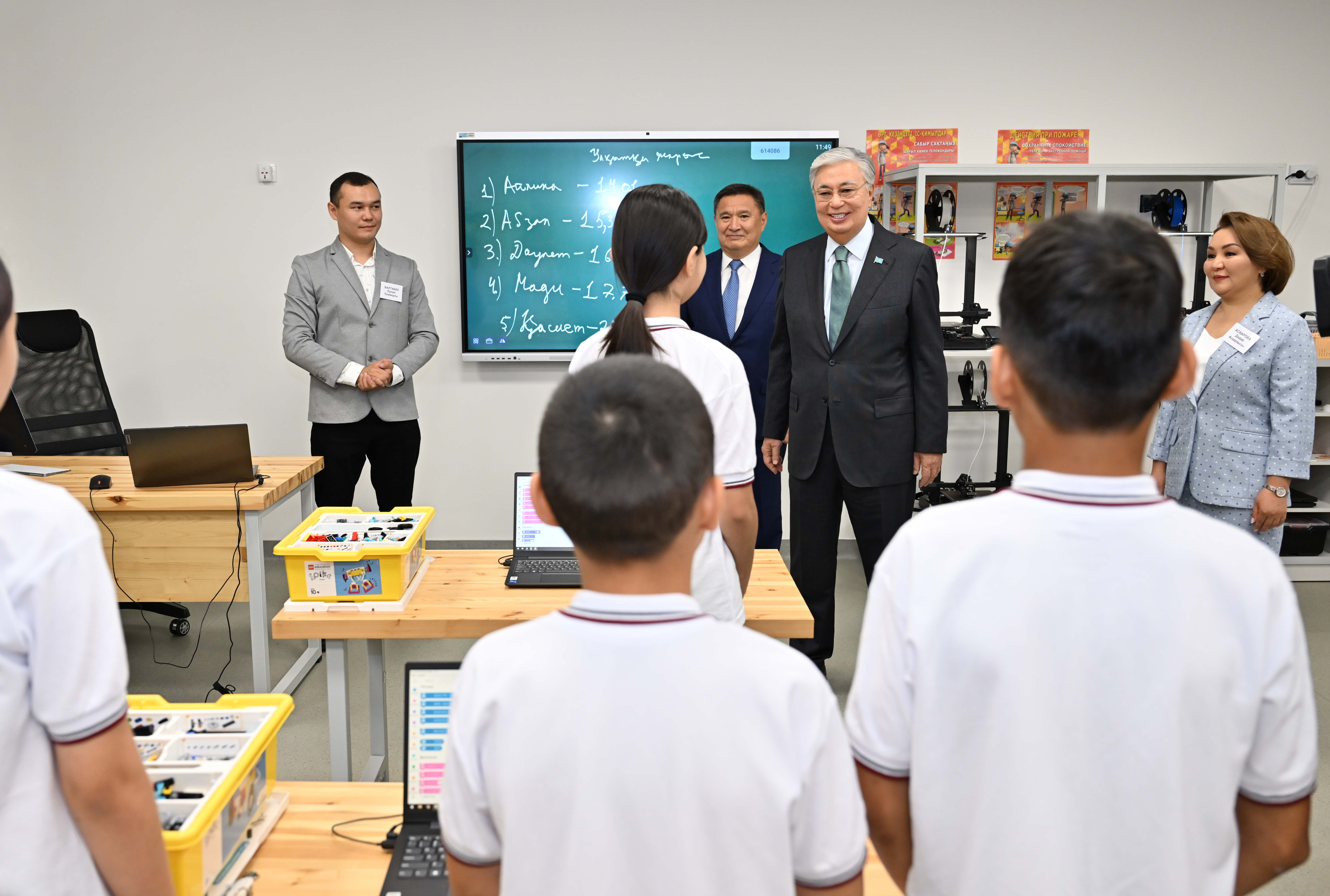 Мемлекет басшысы роботты техника, мобилография, автомобиль жүргізуді виртуалды үйрену, шет тілі кабинеттерін, мектеп кітапханасын аралап көріп, ұстаздармен және оқушылармен әңгімелесті
