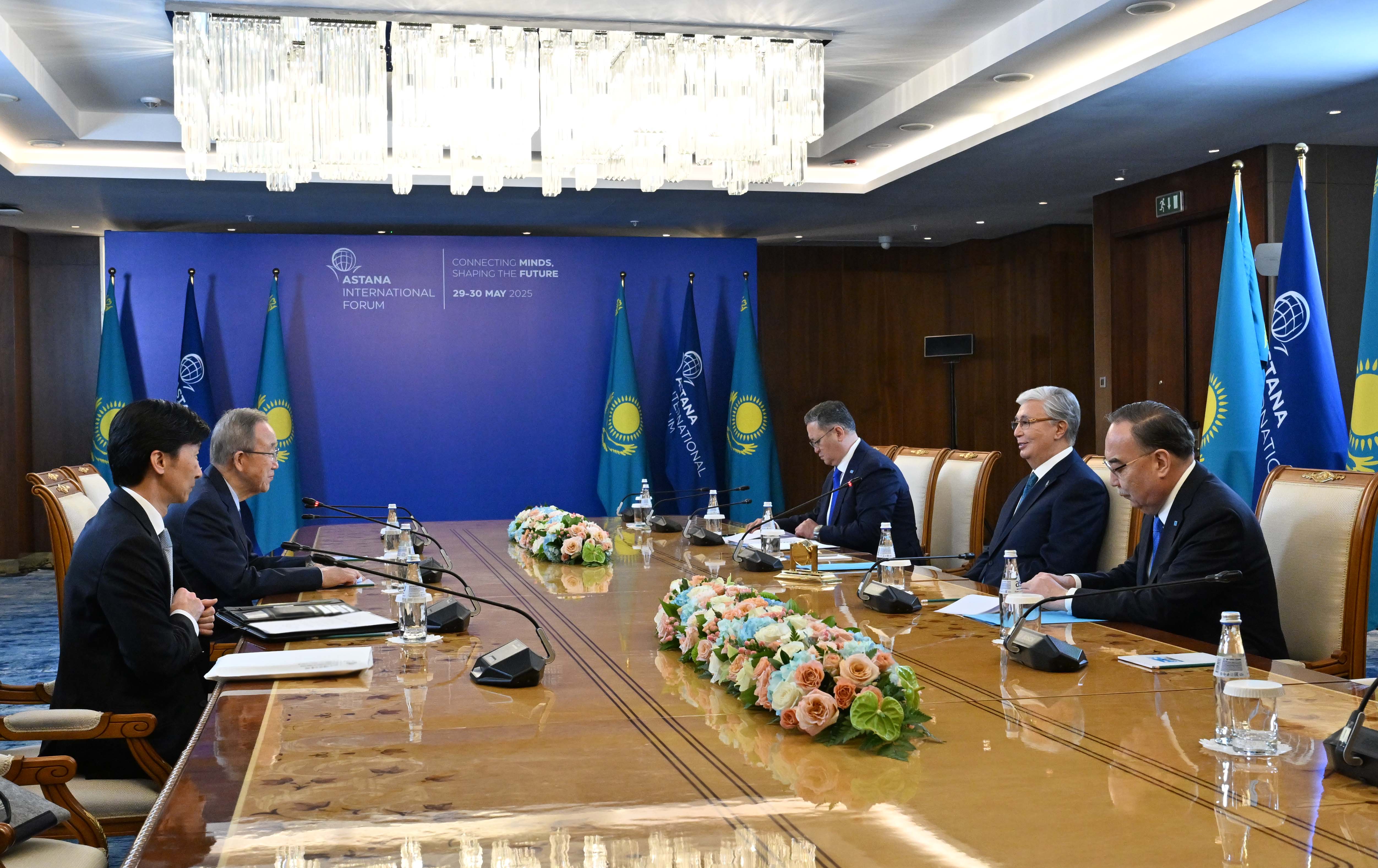 Астана халықаралық форумы алаңында Президент Қасым-Жомарт Тоқаев Жаһандық жасыл даму институтының төрағасы, БҰҰ-ның сегізінші Бас хатшысы Пан Ги Мунмен кездесу өткізді.