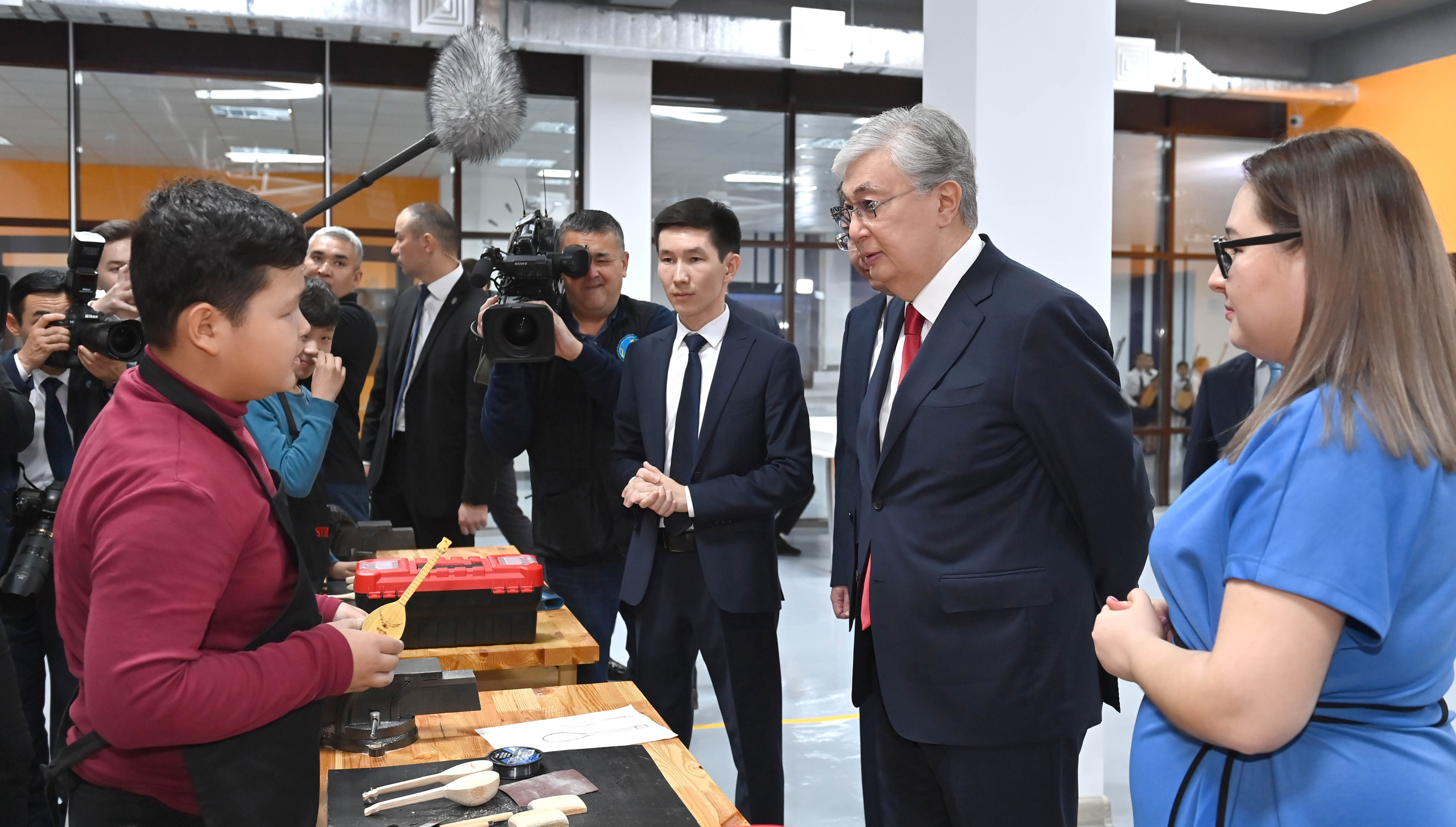 Президент «JasSpace» STEM зертханасында жасалған жобалармен, бұйымдармен танысты. Сондай-ақ бір топ жас домбырашы Құрманғазының «Балбырауын» күйін орындады.