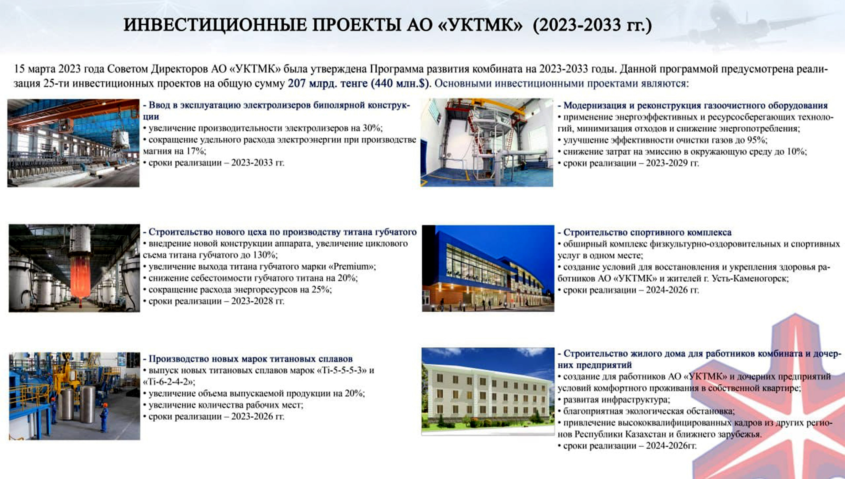 Алдағы он жылда комбинат жалпы сомасы 207 миллиард теңге болатын 25 инвестициялық жобаны жүзеге асыруды жоспарлап отыр.