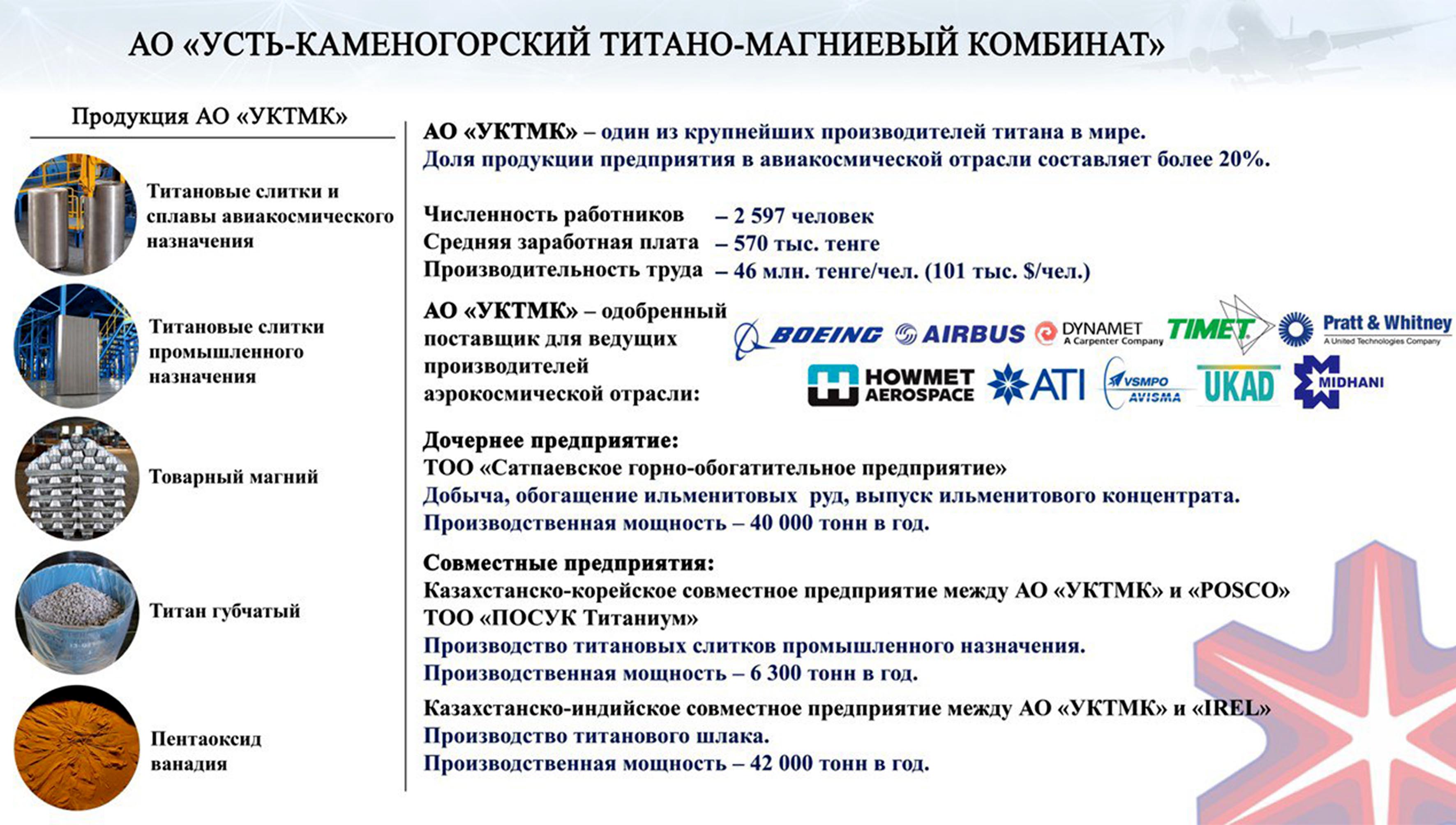 Мемлекет басшысына комбинат өнімін Airbus, Boeing, TIMET, ATI, Safran, UKAD, Pratt&Whitney, General Electric, Dynamet, Howmet, POSCO, Baoti, MIDHANI секілді әлемдік ірі компаниялар сертификаттағаны туралы баяндалды. Қазақстан титаны кеме жасау ісінде, энергетика, аэроғарыш салаларында, мұнай-газ кәсіпорнында және медицинада кеңінен пайдаланылады. Өнім АҚШ-қа, Ұлыбританияға, Францияға, Оңтүстік Кореяға, Үндістанға және Қытайға экспортталады.