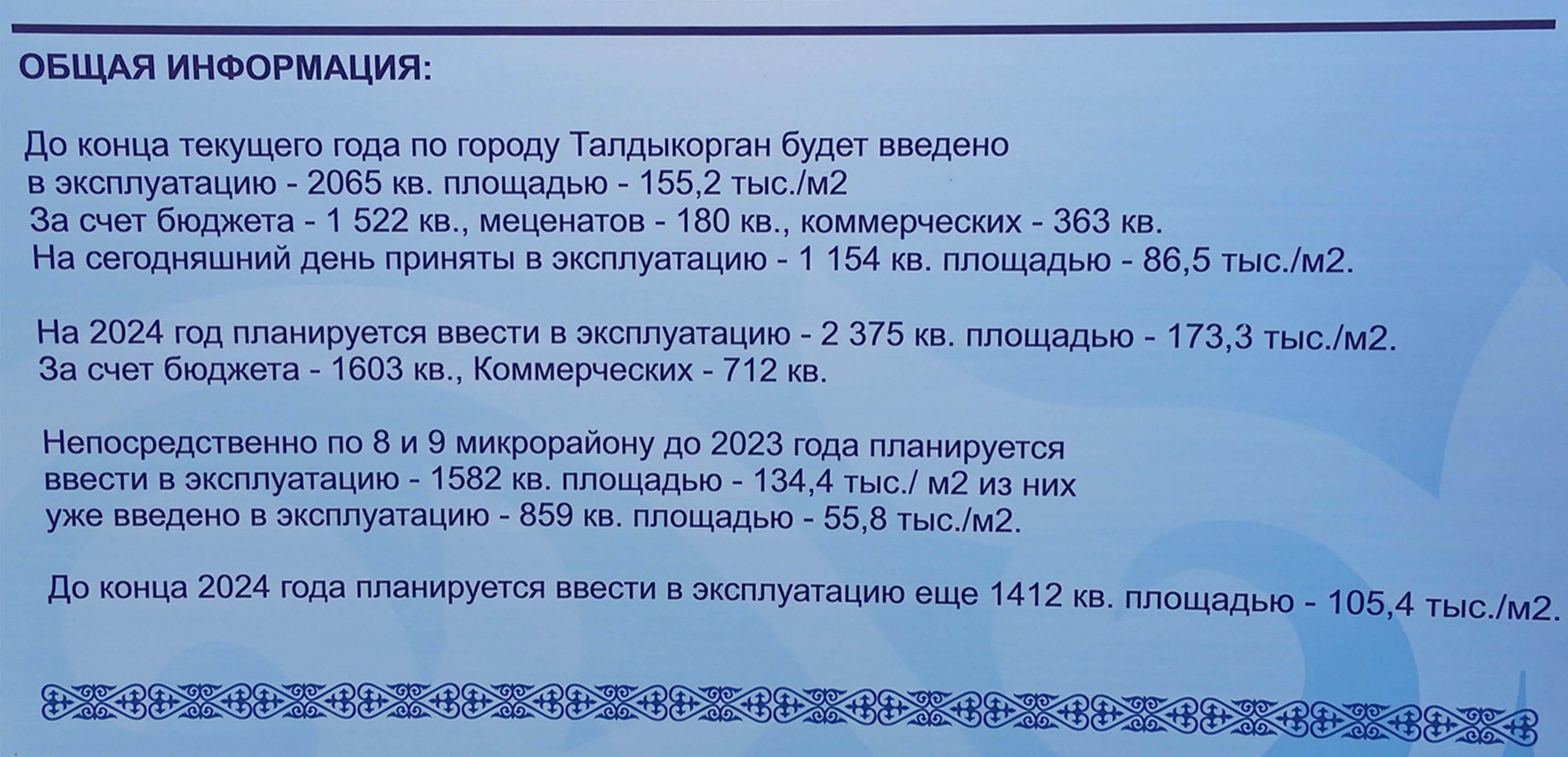 Талдықорған қаласының әкімі Ернат Бәзілдің айтуынша, осы шағын ауданда былтыр аумағы 44,1 мың шаршы метр болатын 509 пәтерлі 14 үйдің құрылысы аяқталған. Ал биыл жыл соңына дейін 783 пәтерлі тағы 21 үйді аяқтау жоспарланып отыр. Қала басшылығы қалған 218 пәтерлі 6 үйдің құрылысын келесі жылы аяқтайтынын жеткізді. Жыл соңына дейін Талдықорған қаласы бойынша жалпы көлемі 155,2 мың шаршы метрді құрайтын 2 065 пәтер пайдалануға беріледі. Сондай-ақ 2024 жылы 2 375 пәтер салу жоспарланған. Бұдан бөлек, Қаратал өзенінің оң жағалауын дамыту қарастырылған.