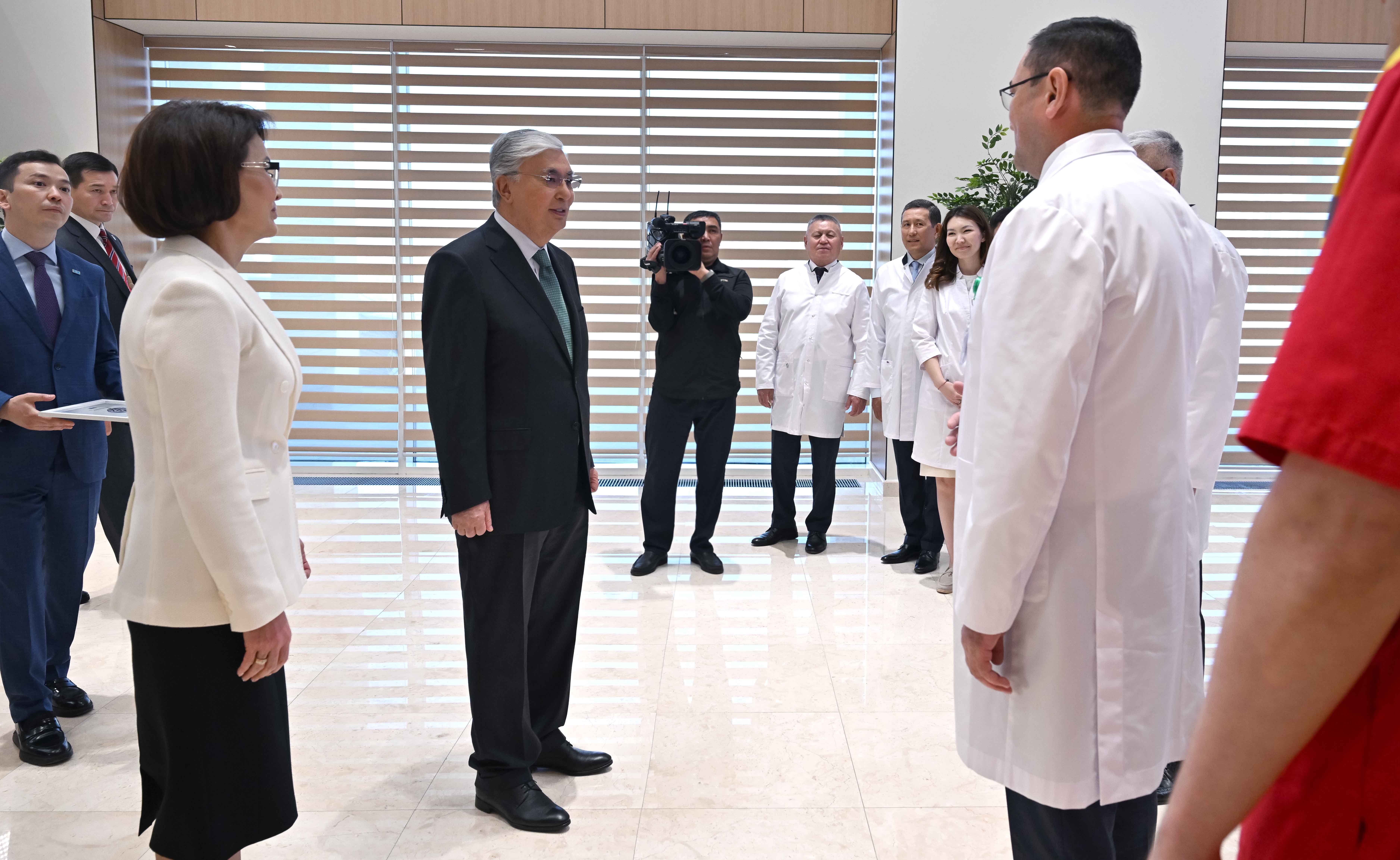 Мемлекет басшысы медициналық авиация және жедел жәрдем қызметтерінің, науқастарды қабылдау бөлмелерінің жұмысын үйлестіретін орталықтың қызметімен танысты. Кешенде 250 орындық стационар бар. Ұлттық шұғыл медицинаны үйлестіру орталығының басқарма төрағасы Тимур Мұратовтың айтуынша, мекемеде 29 бағыт бойынша емдеу ісін жүргізетін 9 клиникалық департамент құрылады. Мұнда жылына 18 мыңнан астам науқас емделе алады. Президент заманауи құралдармен, соның ішінде мобильді компьютерлік томограф және OR-1 жүйесімен жабдықталған операция залдарын аралап көрді. Мемлекет басшысы орталықтың қызметкерлерімен әңгімелесу барысында мұндай бірегей нысанның іске қосылуын отандық медицинаның зор жетістігі деп бағалады. Сонымен қатар мекемеге білікті мамандарды көптеп тарту қажет екеніне назар аударды. Қасым-Жомарт Тоқаев ұжымның жұмысына табыс тілеп, орталыққа реанимобиль сыйлады.