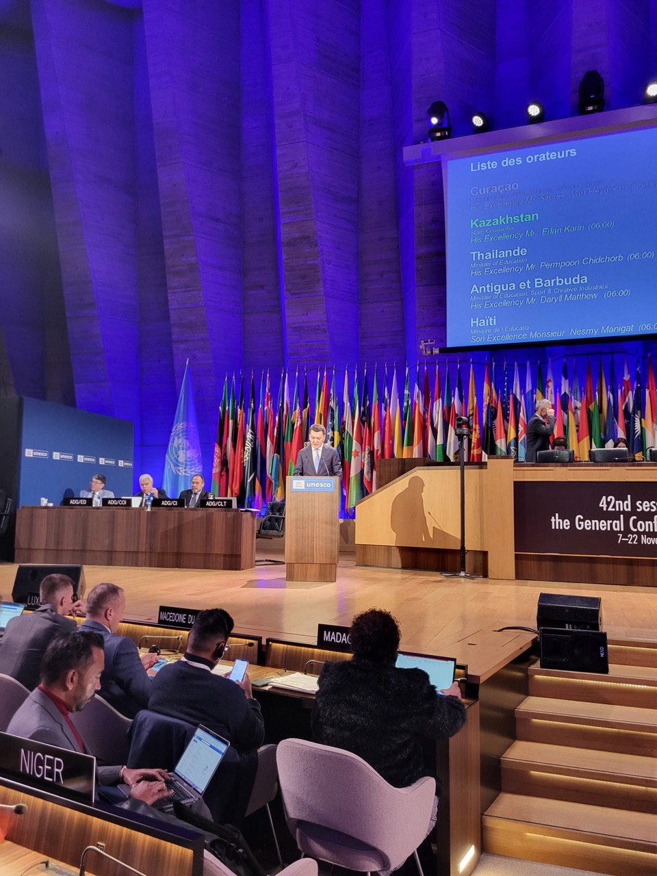 Государственный советник, Председатель Национальной комиссии Республики Казахстан по делам ЮНЕСКО и ИСЕСКО Ерлан Карин выступил на общеполитических дебатах 42-й Генеральной конференции ЮНЕСКО, проходящей в Париже.
