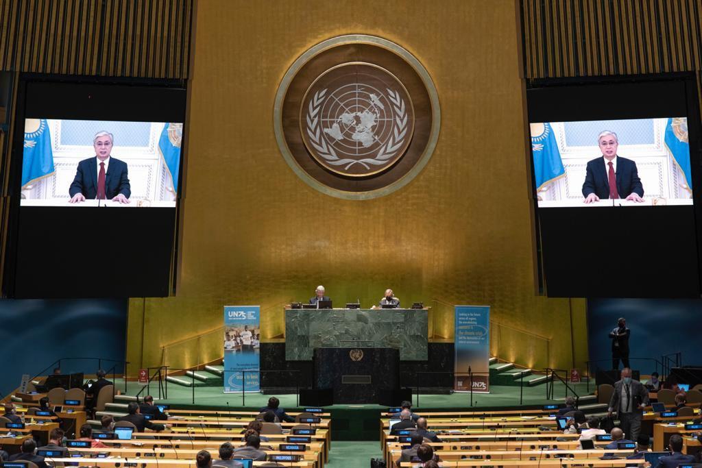 Касым-Жомарт Токаев выступил с видеообращением на Мероприятии высокого уровня в ознаменование 75-летия Организации Объединенных Наций в рамках юбилейной сессии Генеральной Ассамблеи ООН, проходящем в онлайн-формате в связи с пандемией коронавируса.