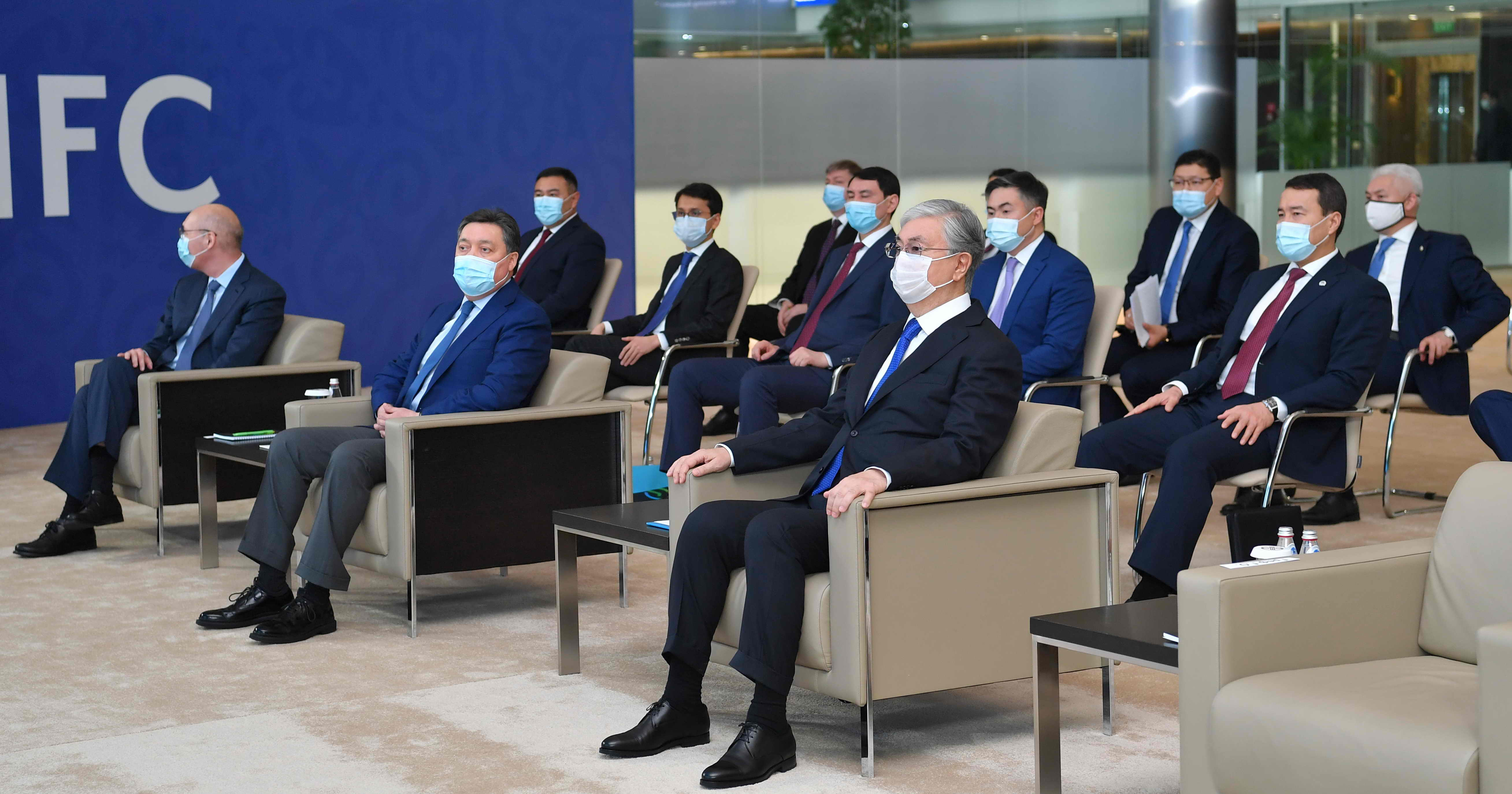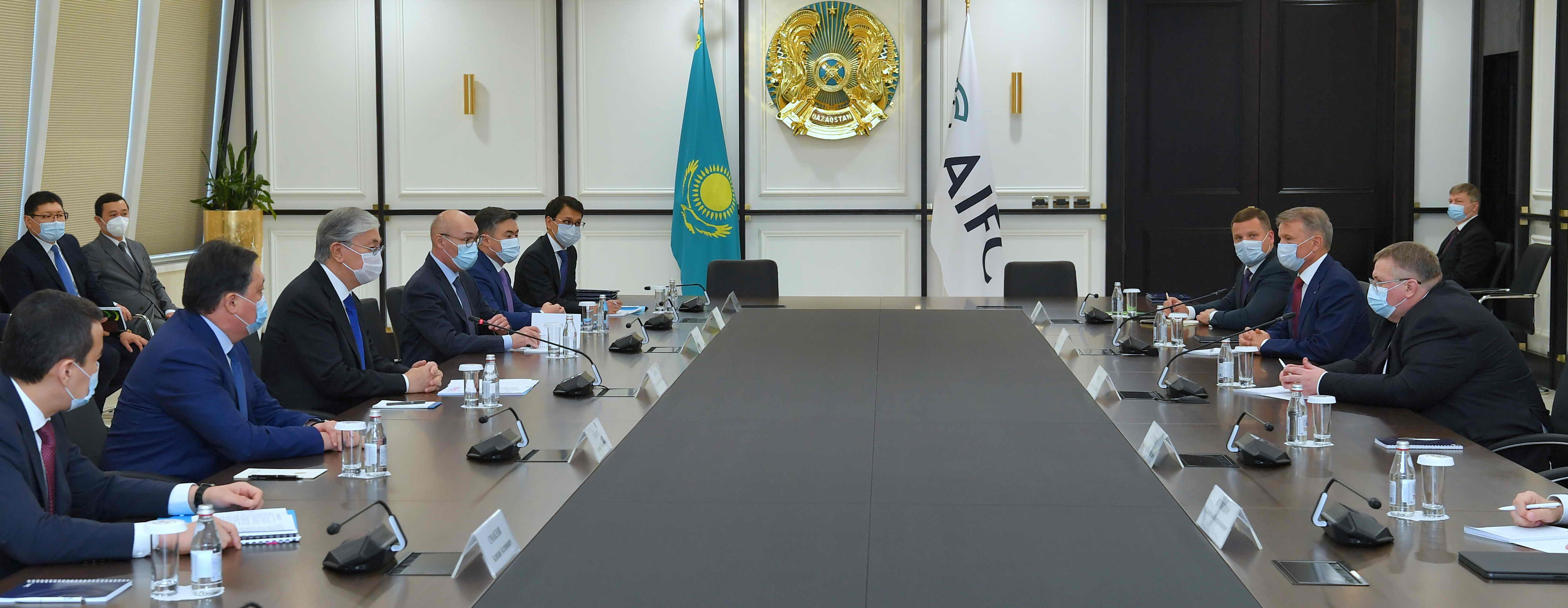 На площадке Международного финансового центра «Астана» состоялась встреча Главы государства с российской делегацией, в состав которой вошли заместитель председателя Правительства Российской Федерации Алексей Оверчук и президент, председатель правления ПАО «Сбербанк» Герман Греф.