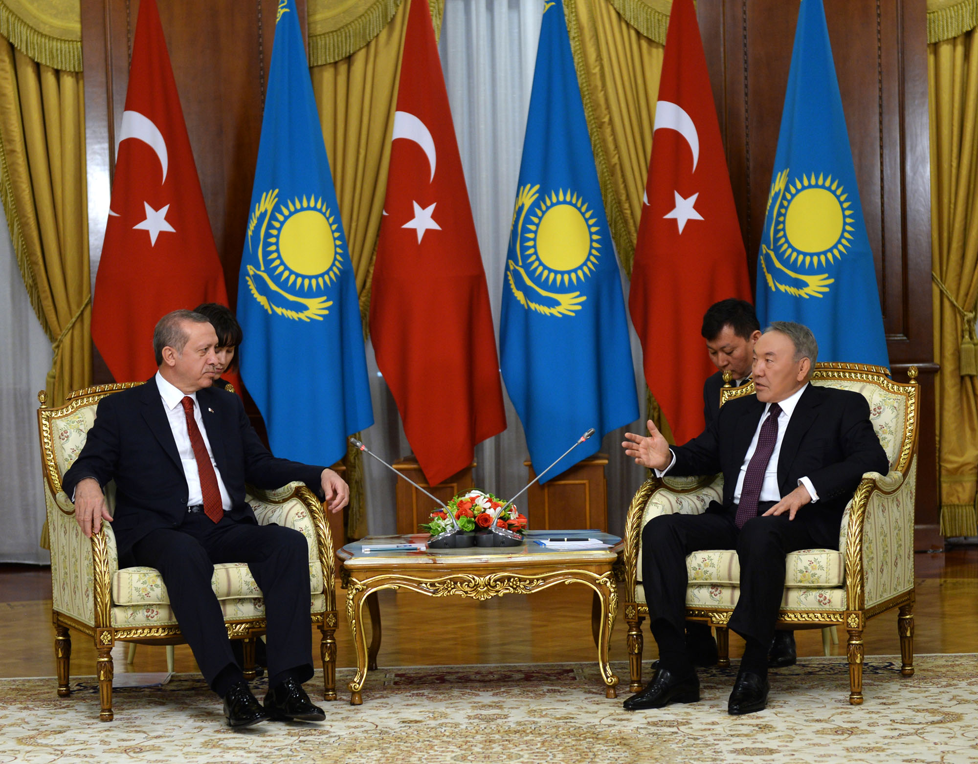- Под Вашим руководством за последние 12 лет Турция достигла больших успехов. Она занимает 16 место в мире по экономическим показателям, что является результатом труда всего народа и Ваших усилий. С Вами прибыла крупная делегация, члены которой сегодня примут участие в двустороннем бизнес-форуме. Уверен, что Ваш визит будет способствовать переходу наших отношений на новый уровень, - сказал Президент Казахстана.