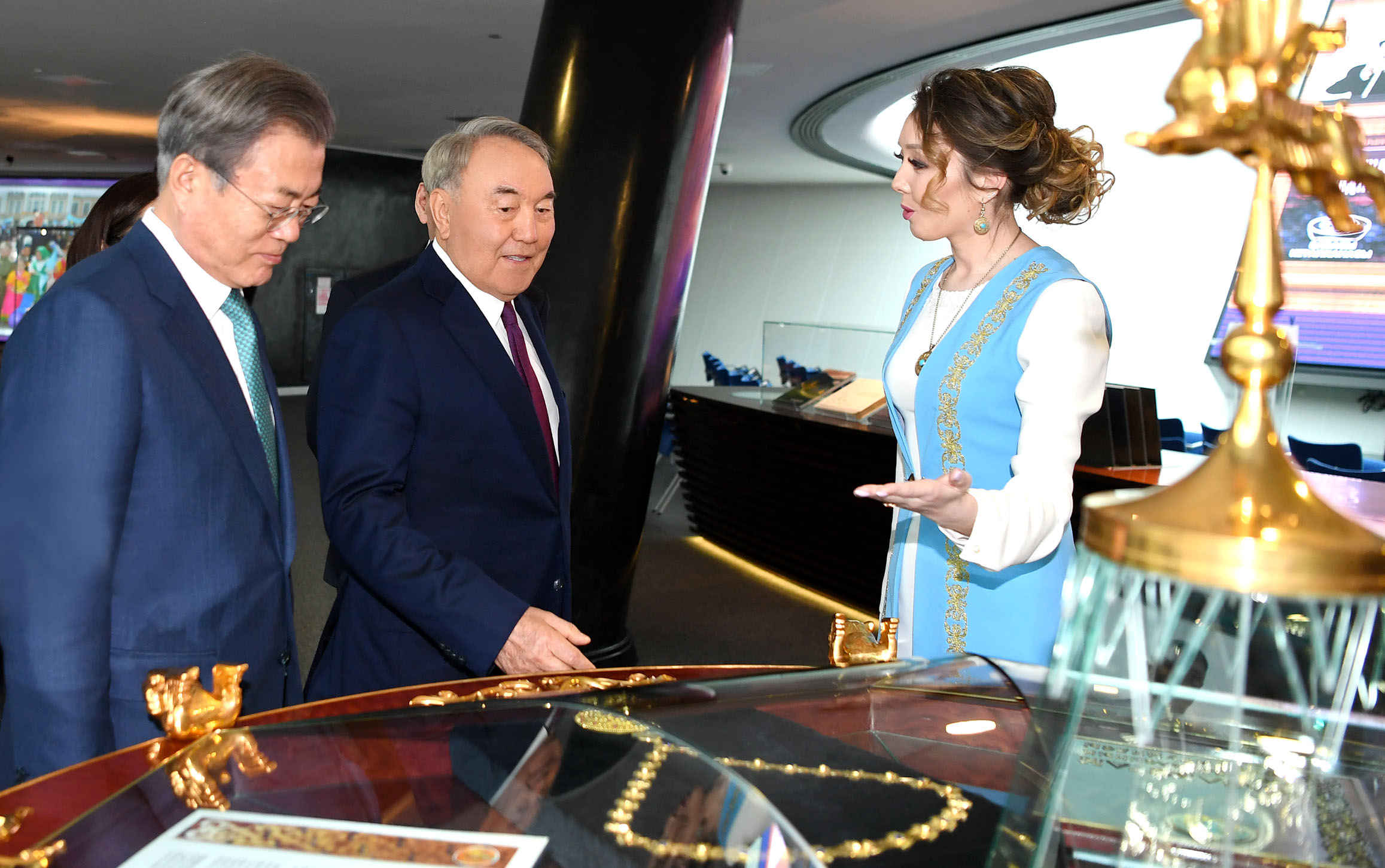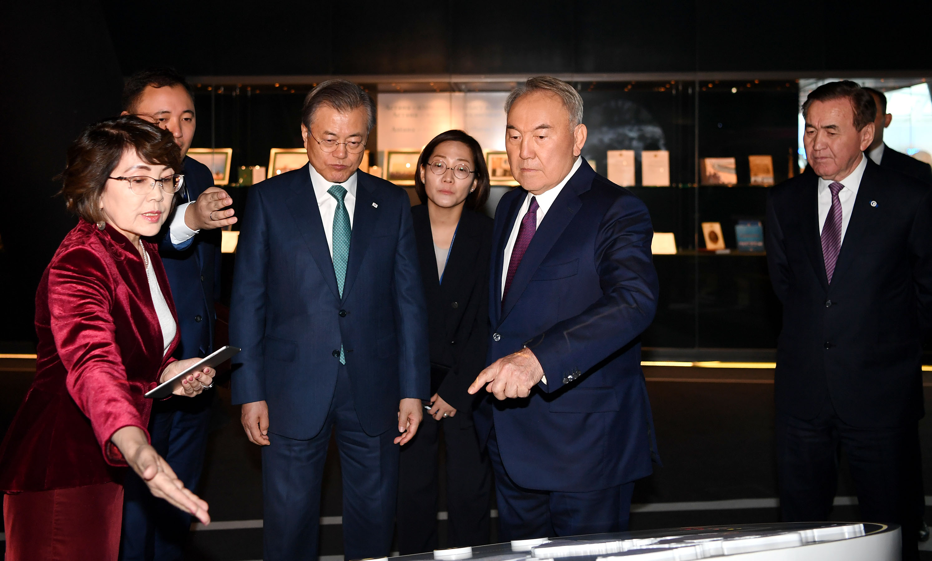 По завершении встречи Елбасы Нурсултан Назарбаев и Президент Южной Кореи ознакомились с экспозициями выставки Библиотеки Первого Президента РК.
