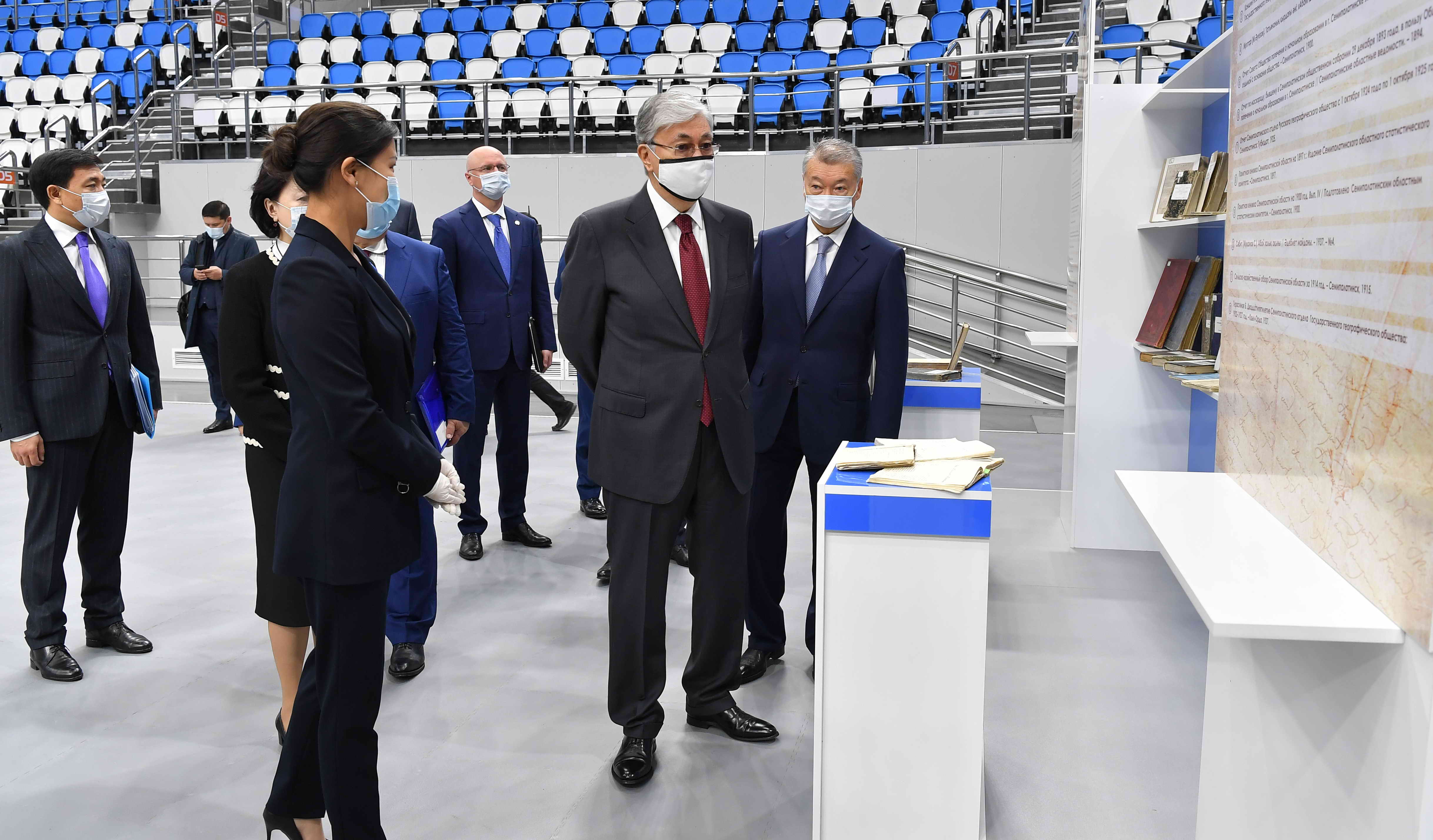 Президент Казахстана в культурно-спортивном комплексе осмотрел выставку, на которой были представлены редкие издания Абая, книги,  опубликованные в рамках серии «Мир Абая», а также многотомный труд доктора филологических наук, профессора Мекемтаса Мырзахметулы, посвященный творчеству поэта.