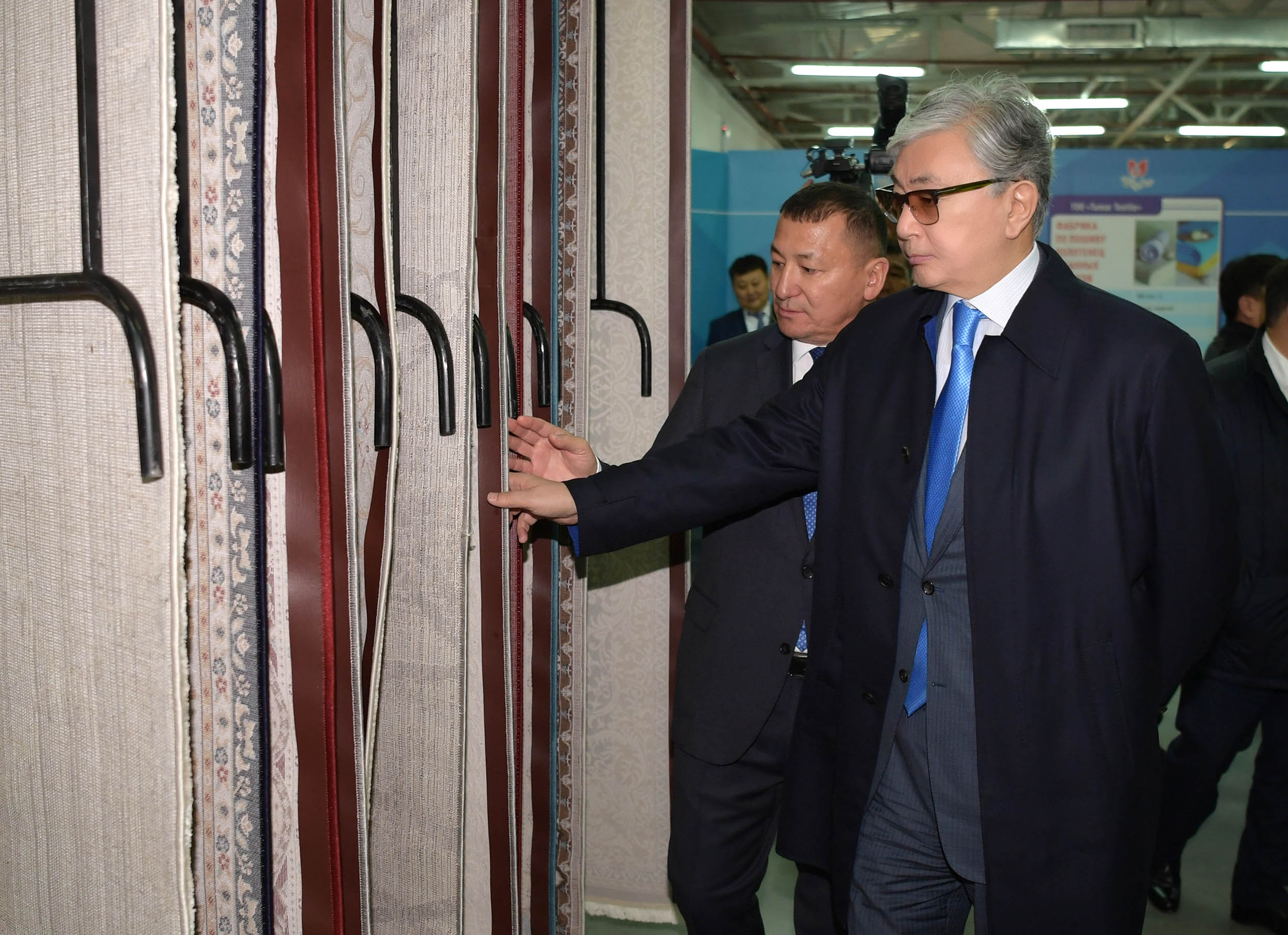 Касым-Жомарт Токаев ознакомился с технологическим процессом прядения, отделки и пошива производственного текстиля, а также осмотрел образцы готовой продукции ТОО «AZALA Textile».
