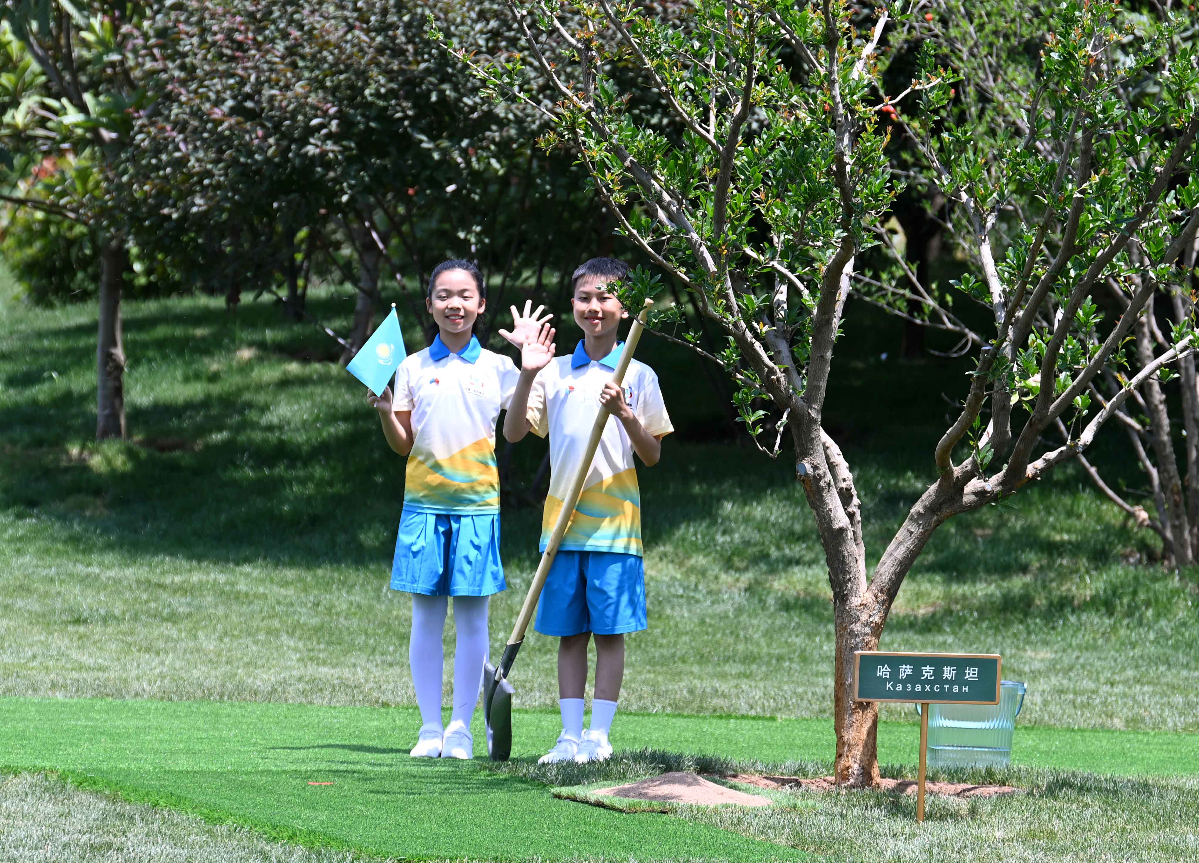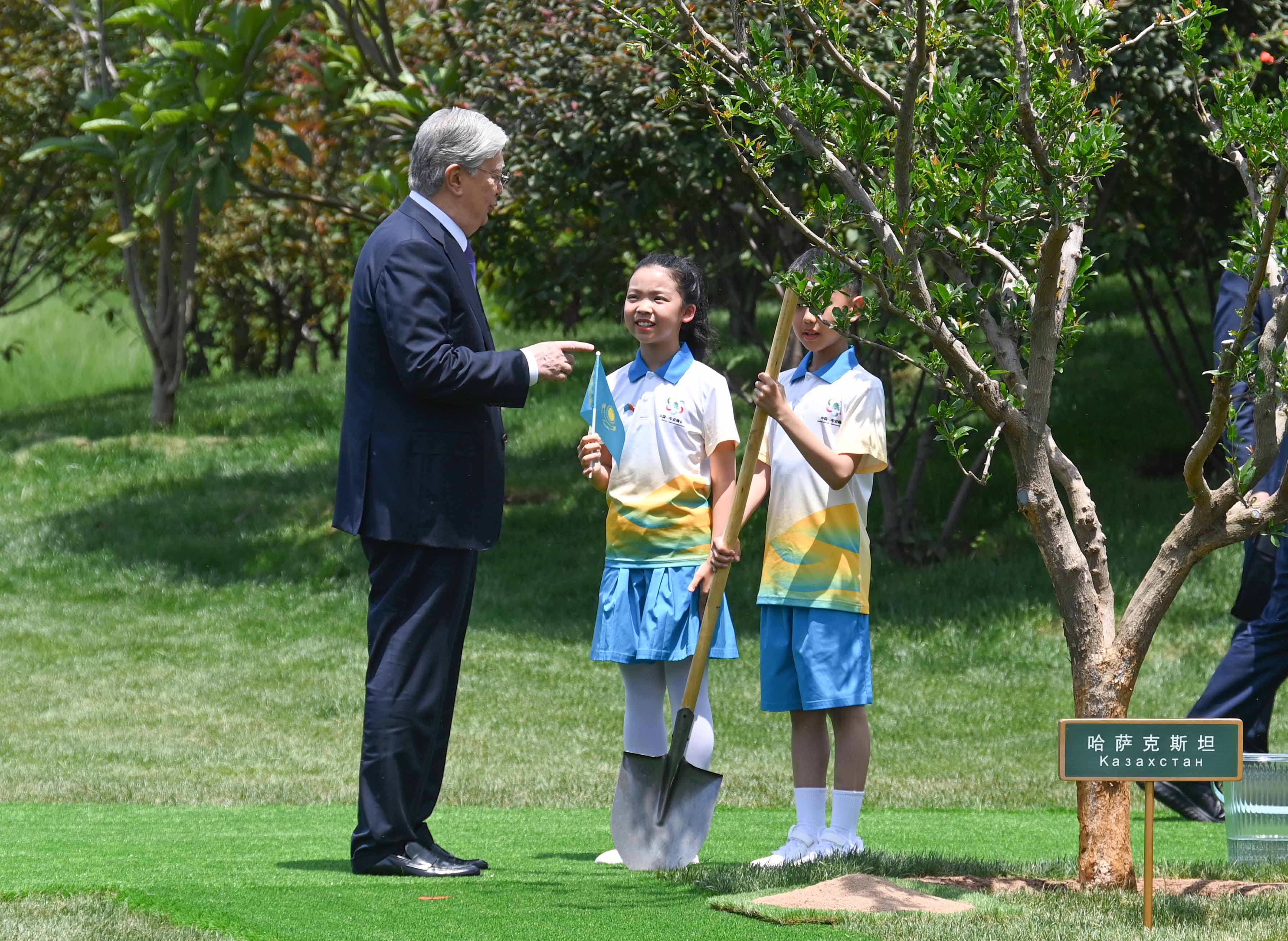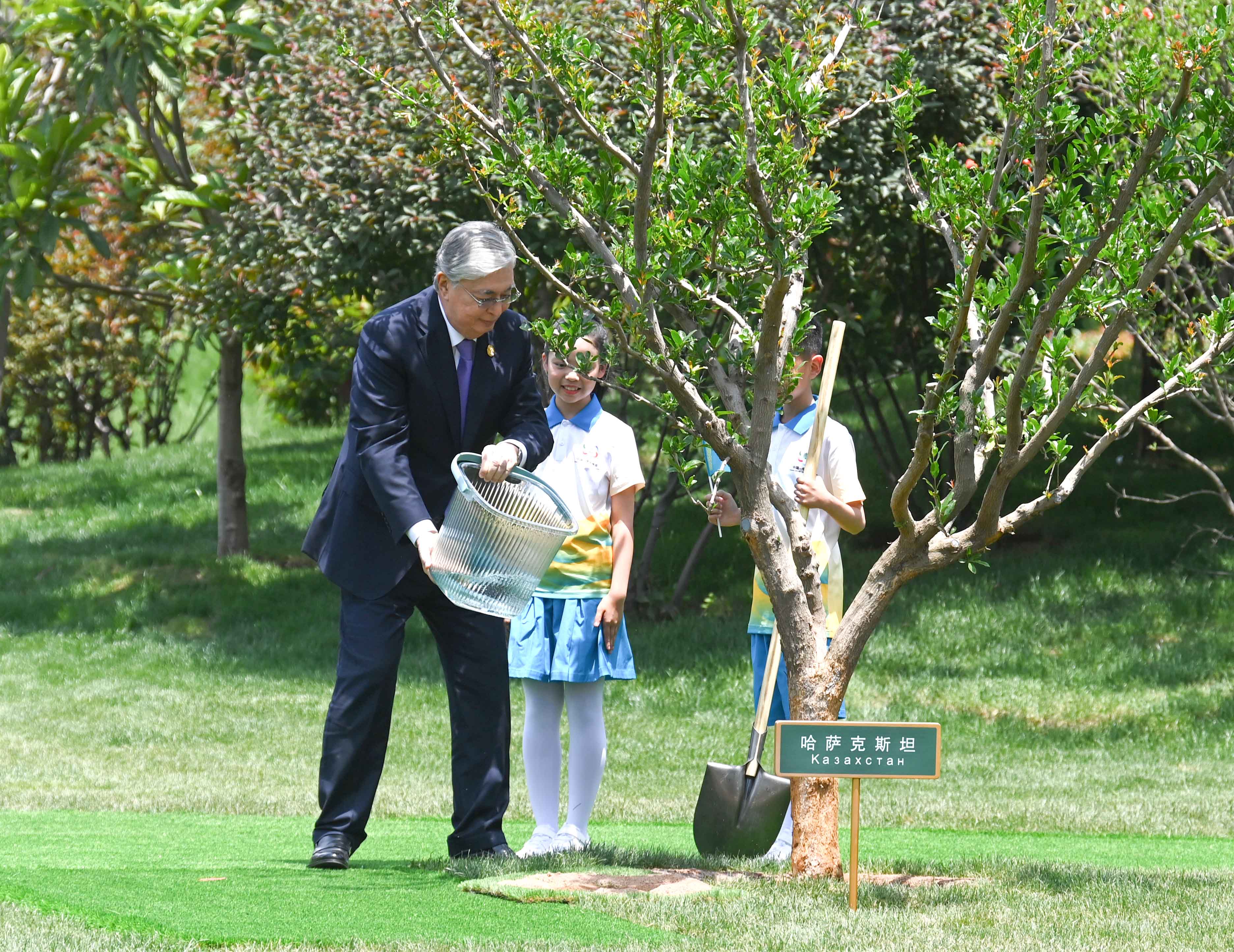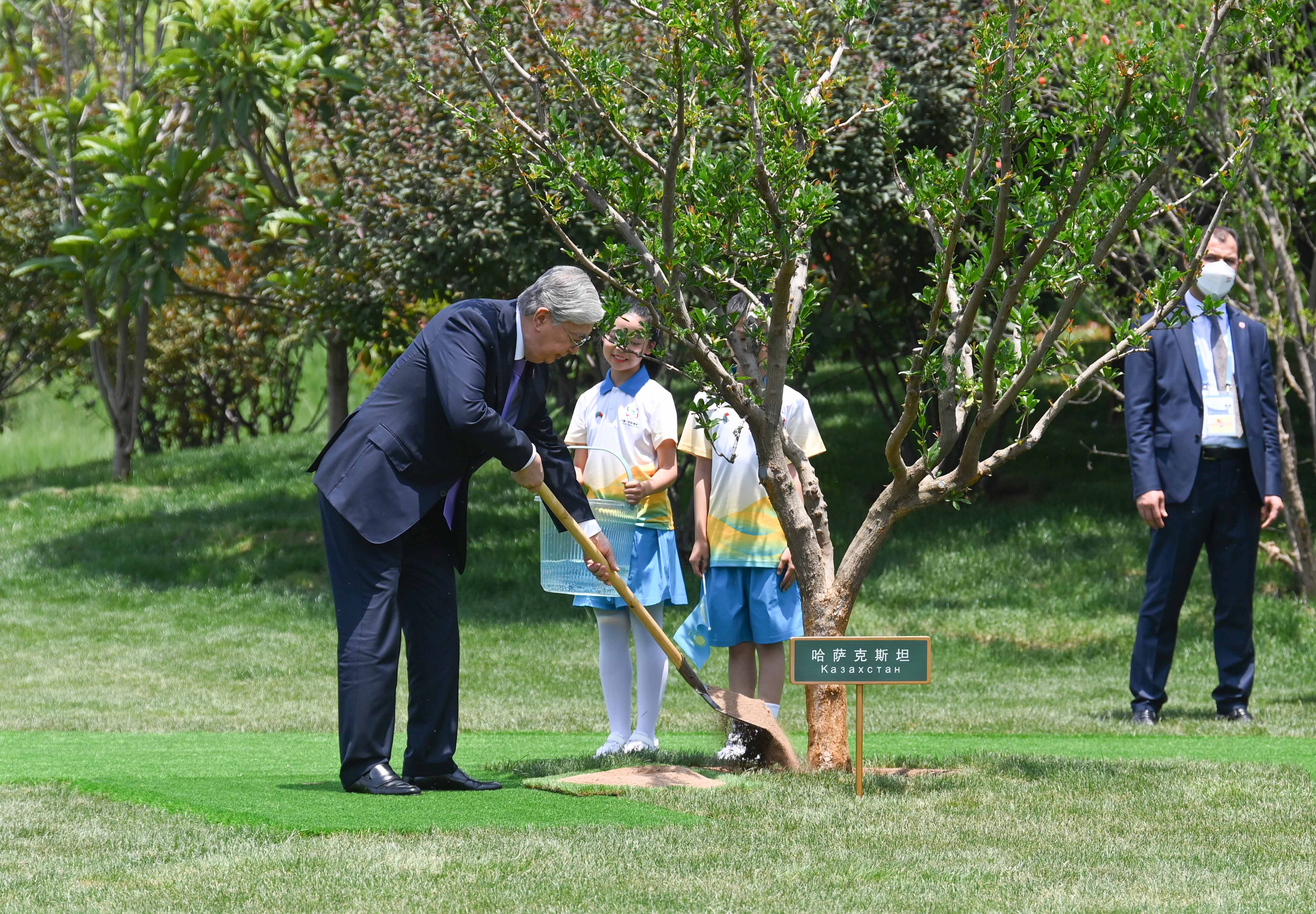 После завершения официального мероприятия лидеры стран Центральной Азии и Китая совместно посадили деревья перед Центром международных конференций.