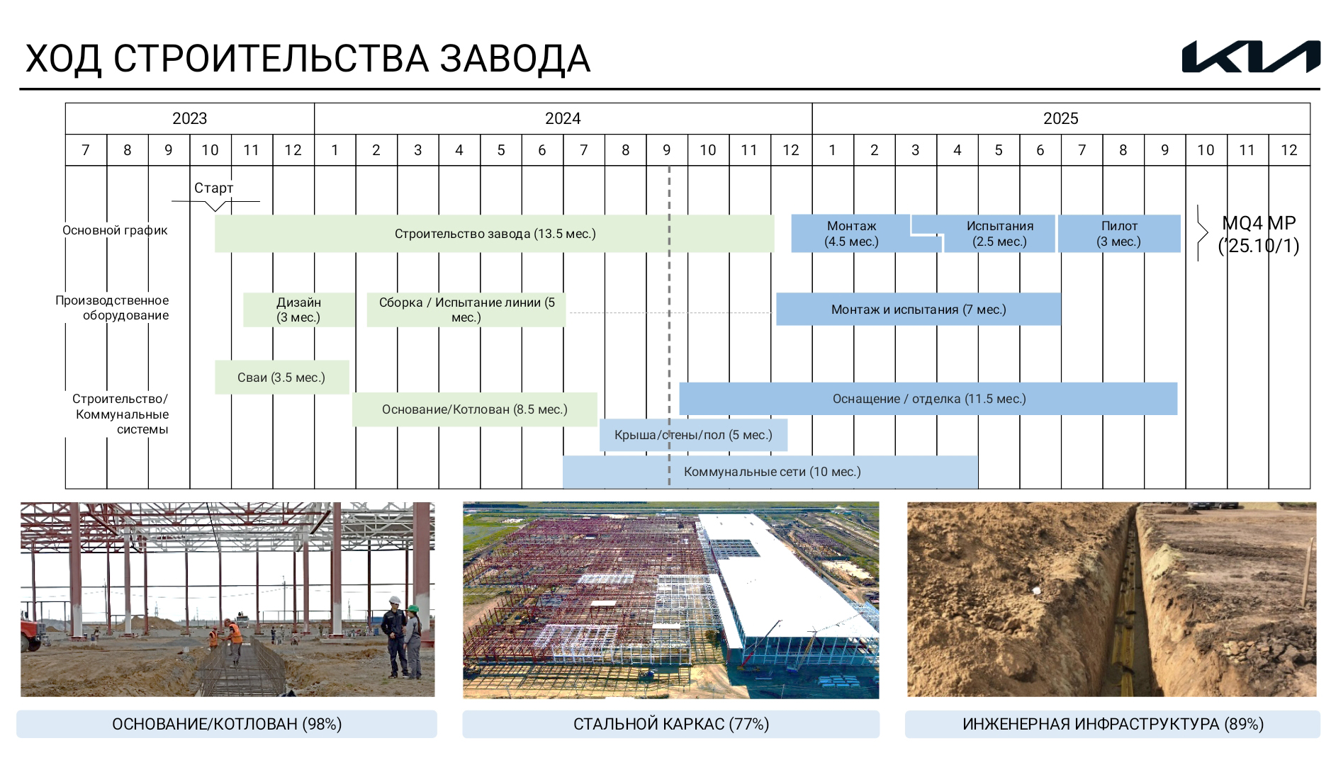 Как рассказал генеральный директор Kia Qazaqstan Ким Дэ Ки, в октябре 2025 года будет произведен пуск завода, на начальном этапе автопредприятие планирует производить модель Sorento. С января 2026 года начнется выпуск обновленной модели Sportage.