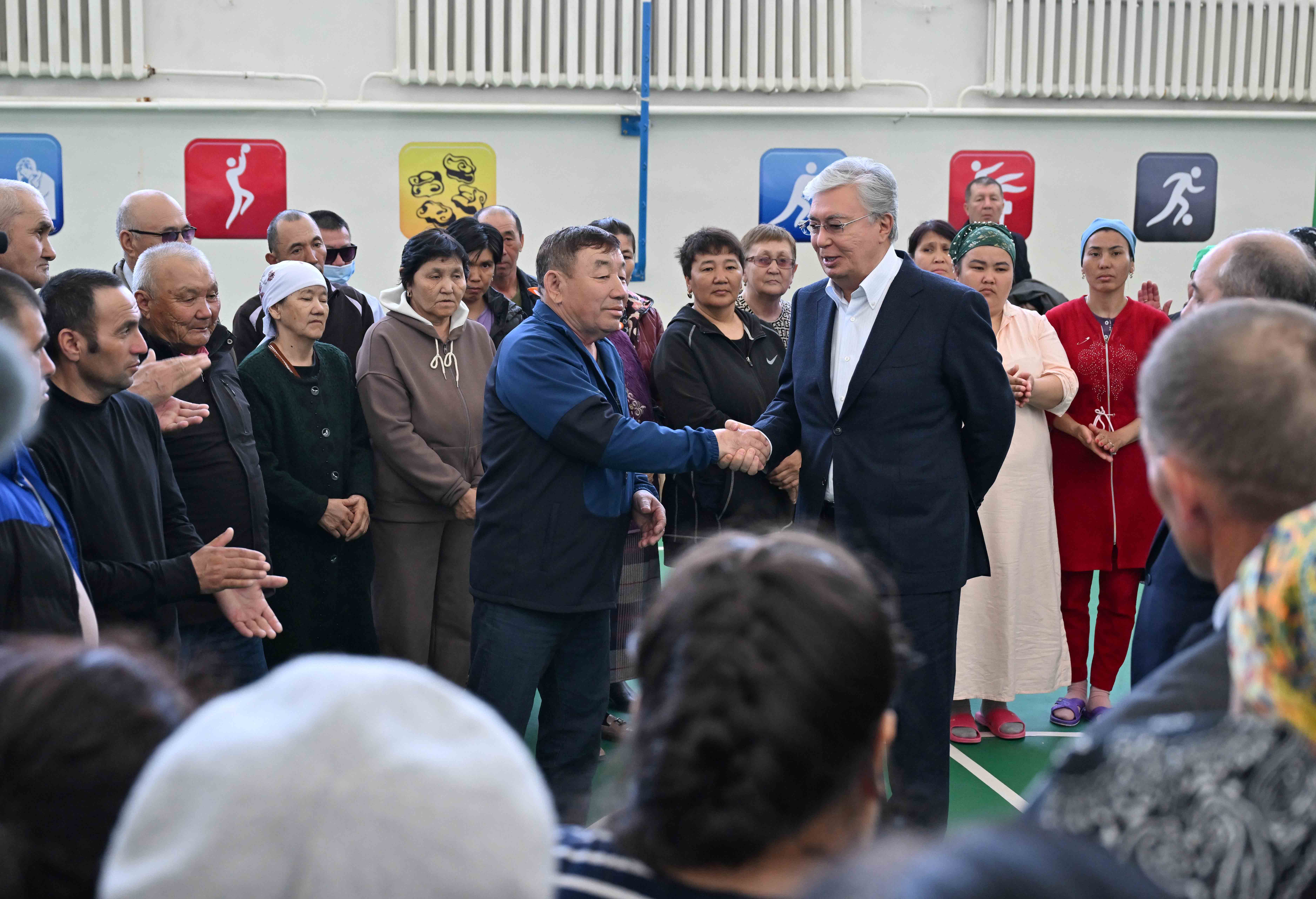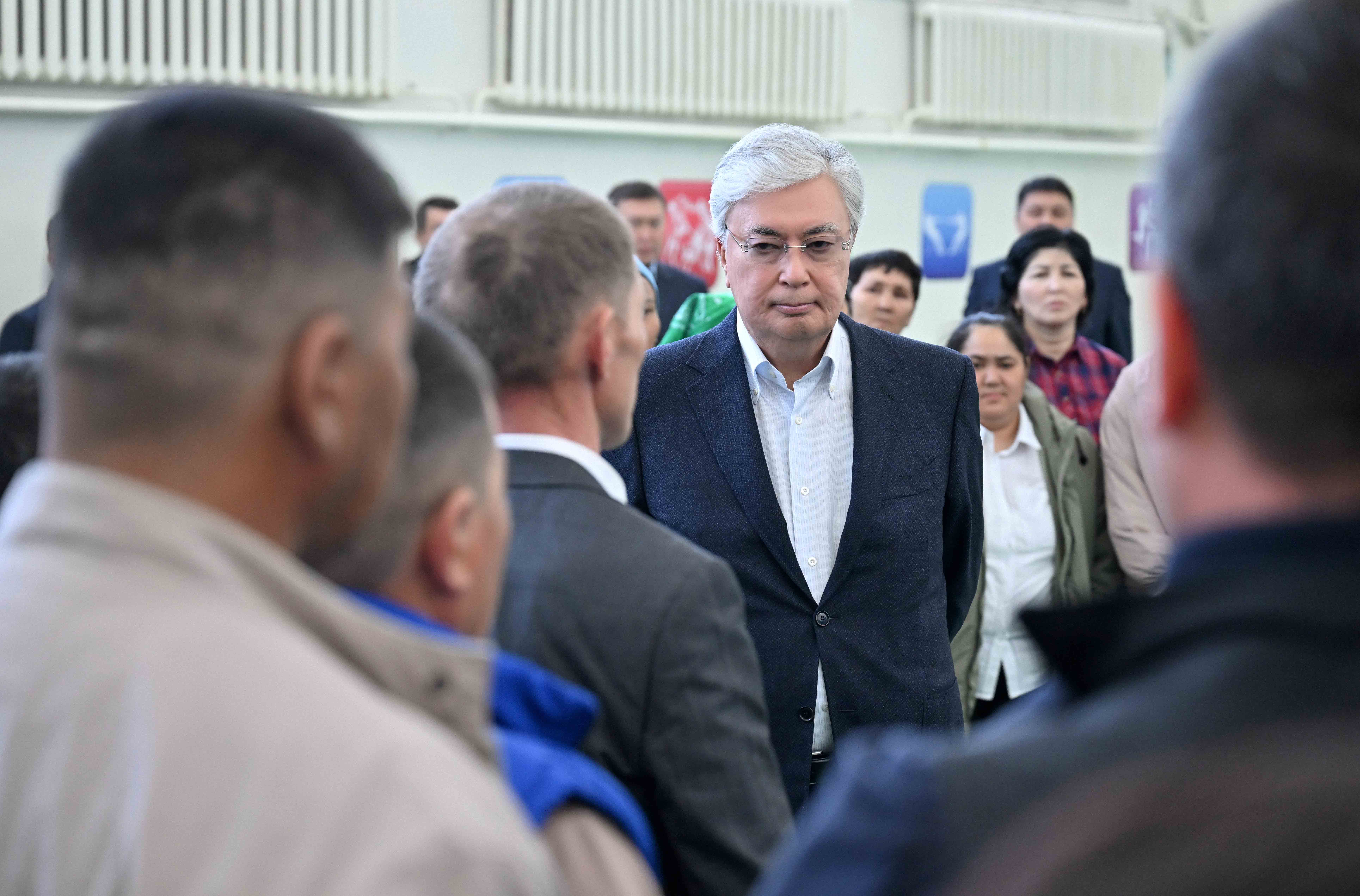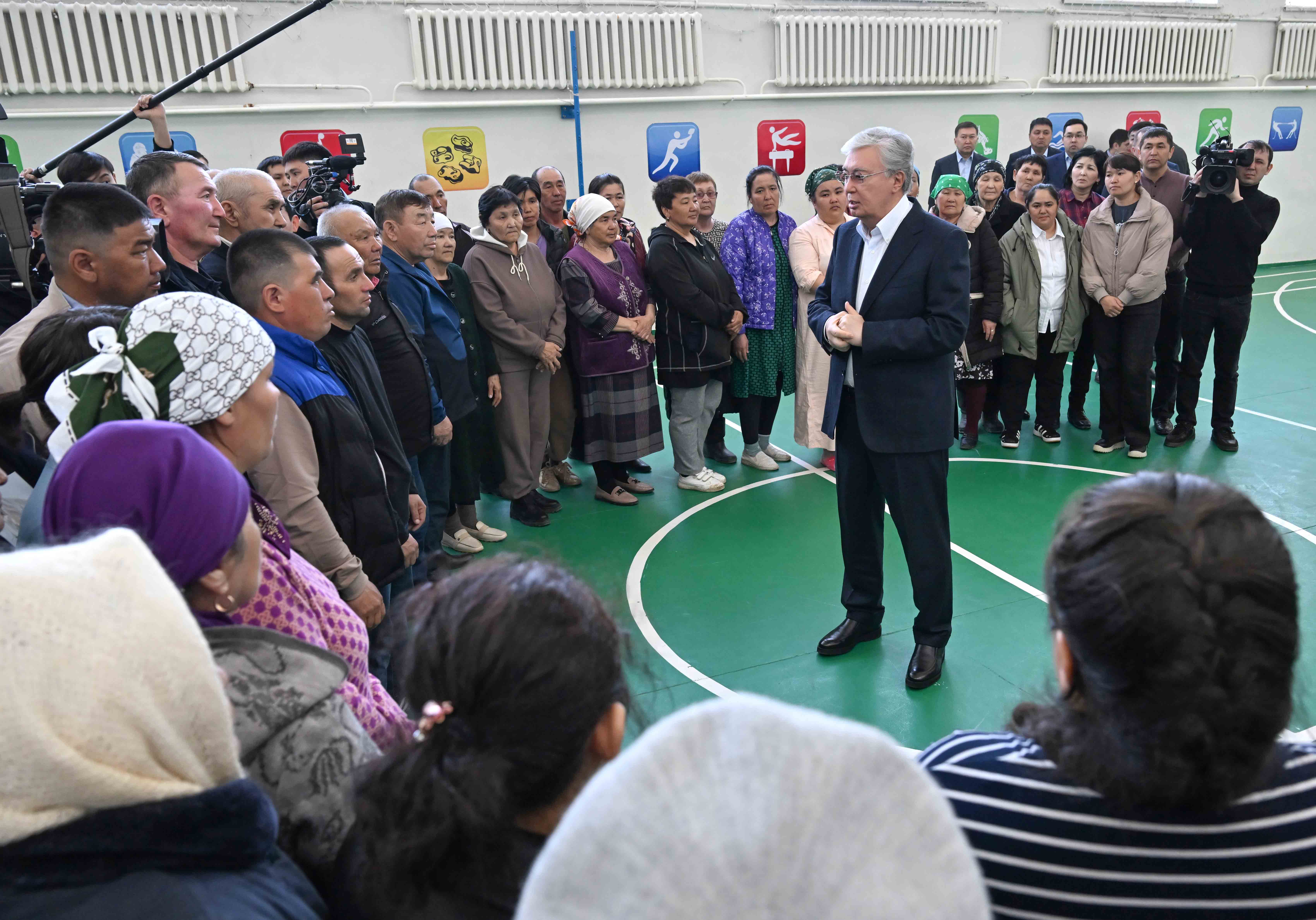 Президент после облета подтопленных территорий посетил эвакуационный пункт, развернутый на базе школы-гимназии имени Кажыма Жумалиева в районном центре Каратобе. Он ознакомился с работой пункта распределения гуманитарной помощи и встретился с жителями близлежащих сел, эвакуированных после наводнения.