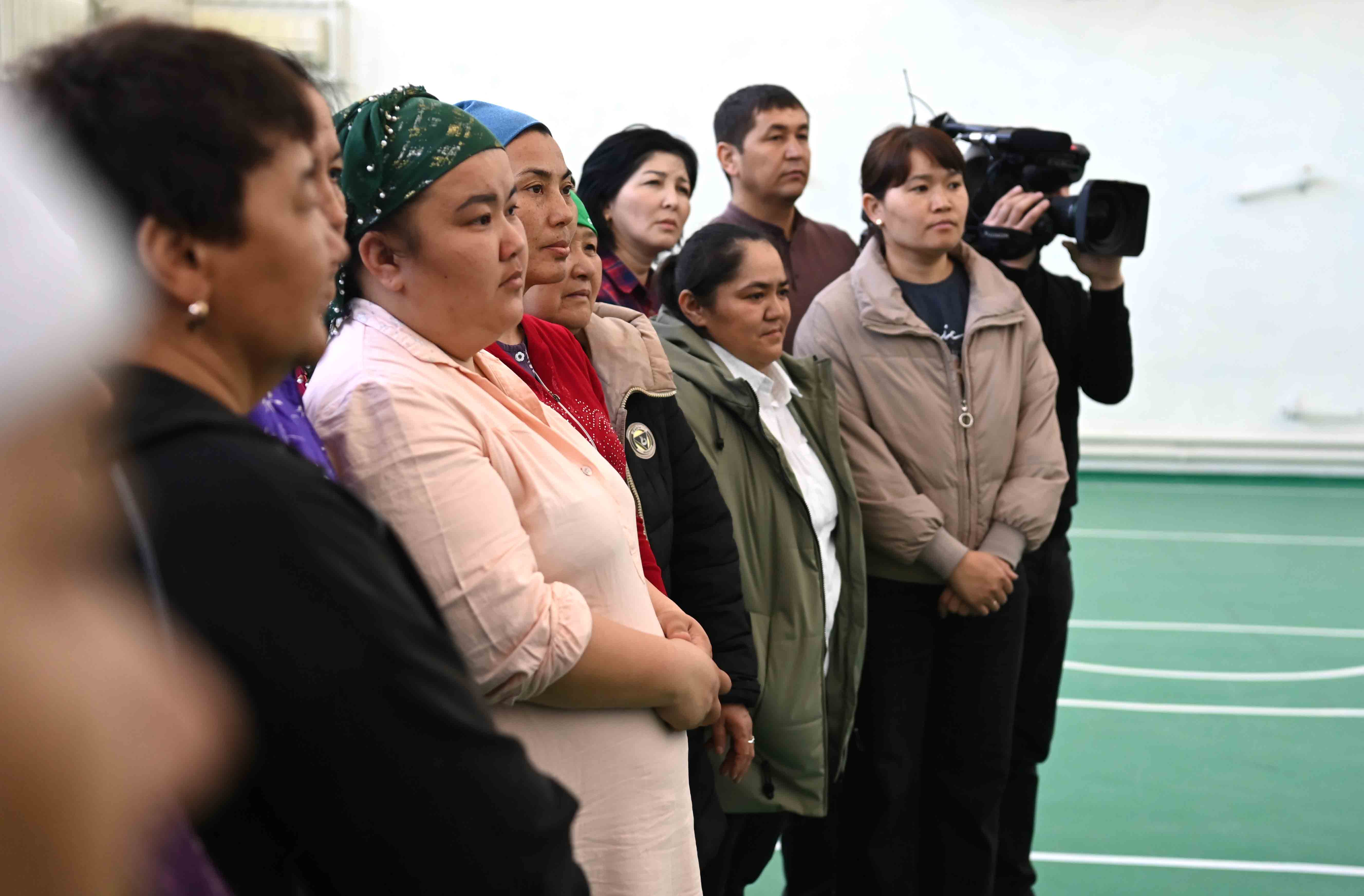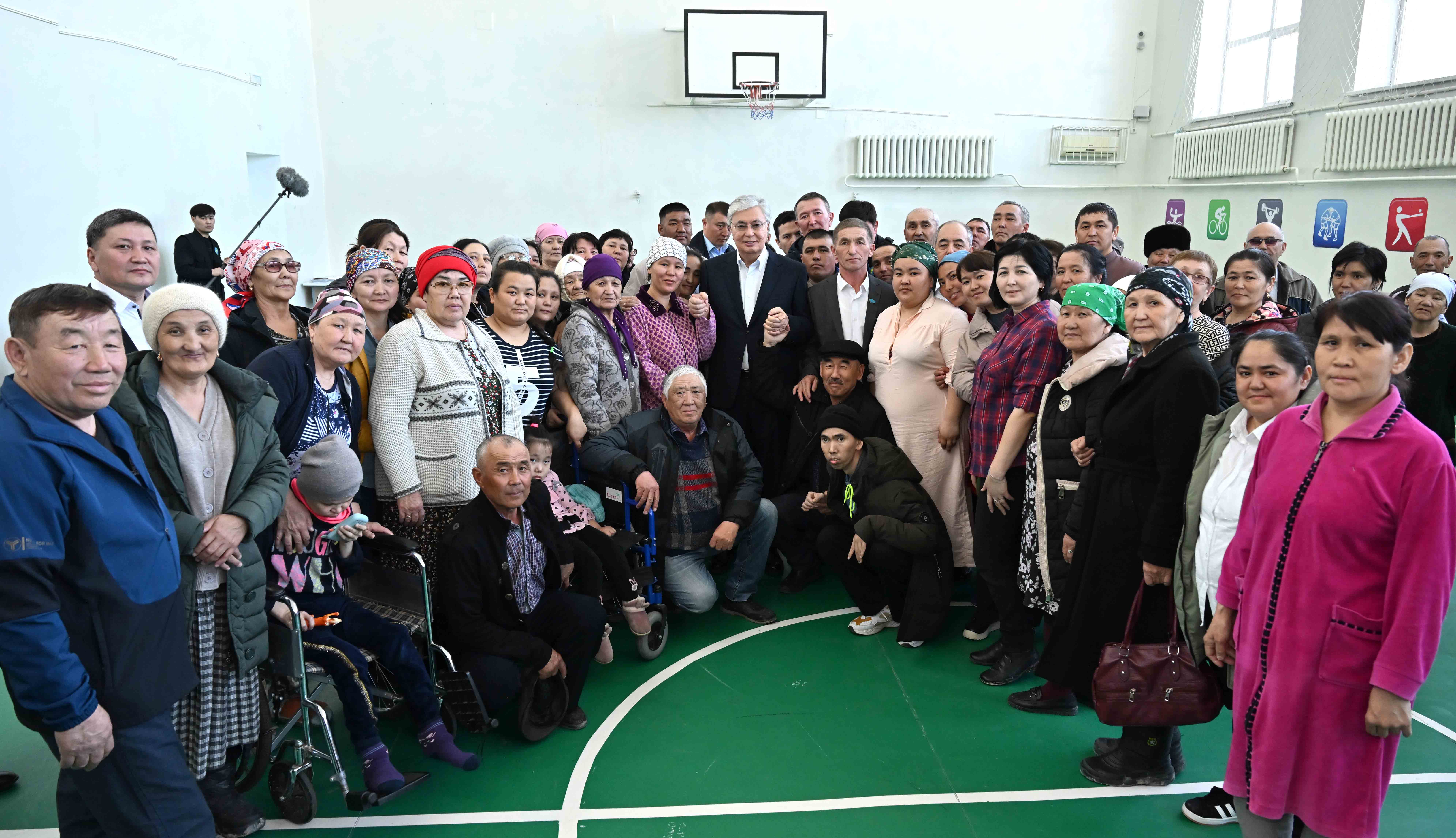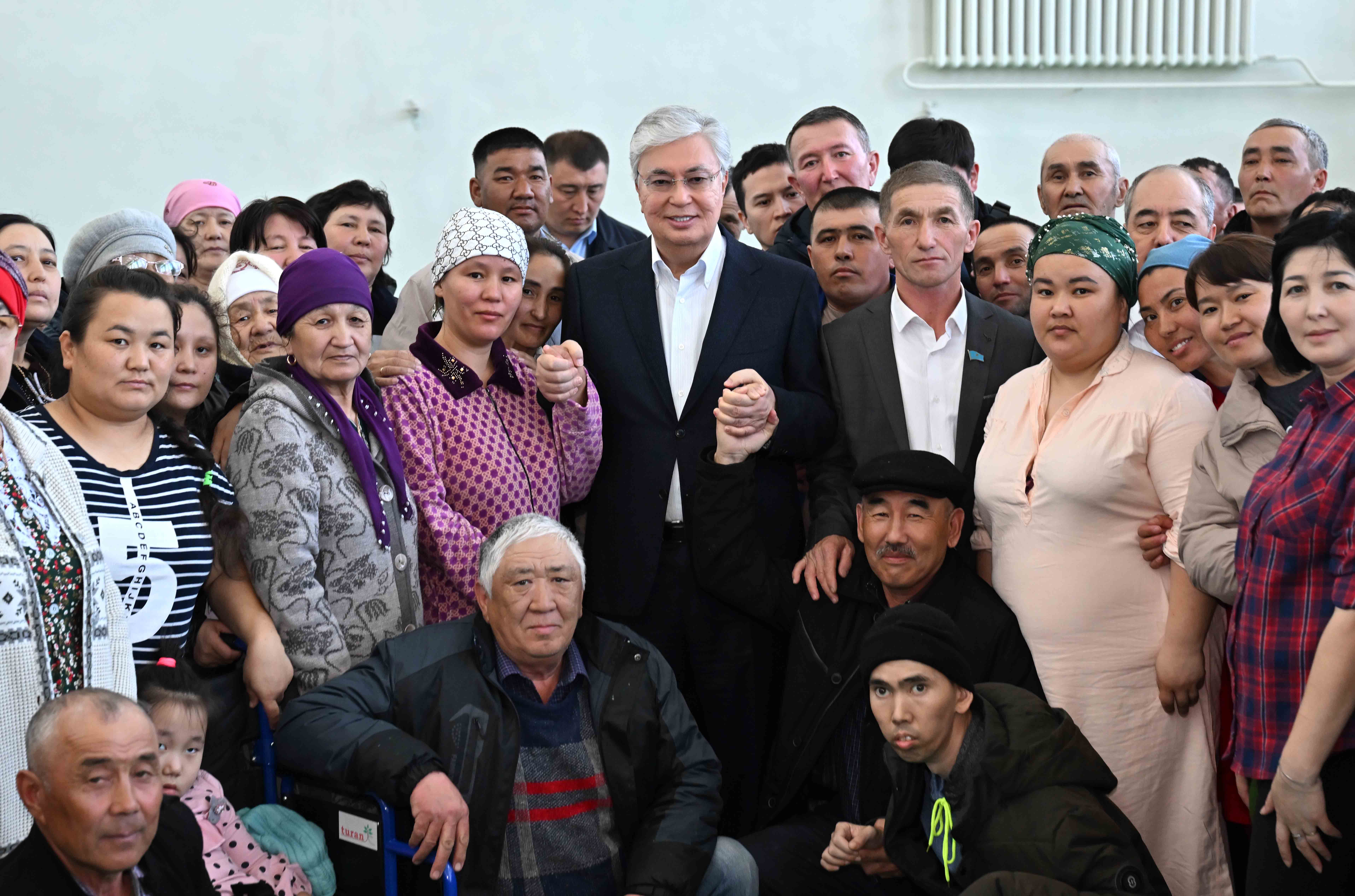 Президент после облета подтопленных территорий посетил эвакуационный пункт, развернутый на базе школы-гимназии имени Кажыма Жумалиева в районном центре Каратобе. Он ознакомился с работой пункта распределения гуманитарной помощи и встретился с жителями близлежащих сел, эвакуированных после наводнения.