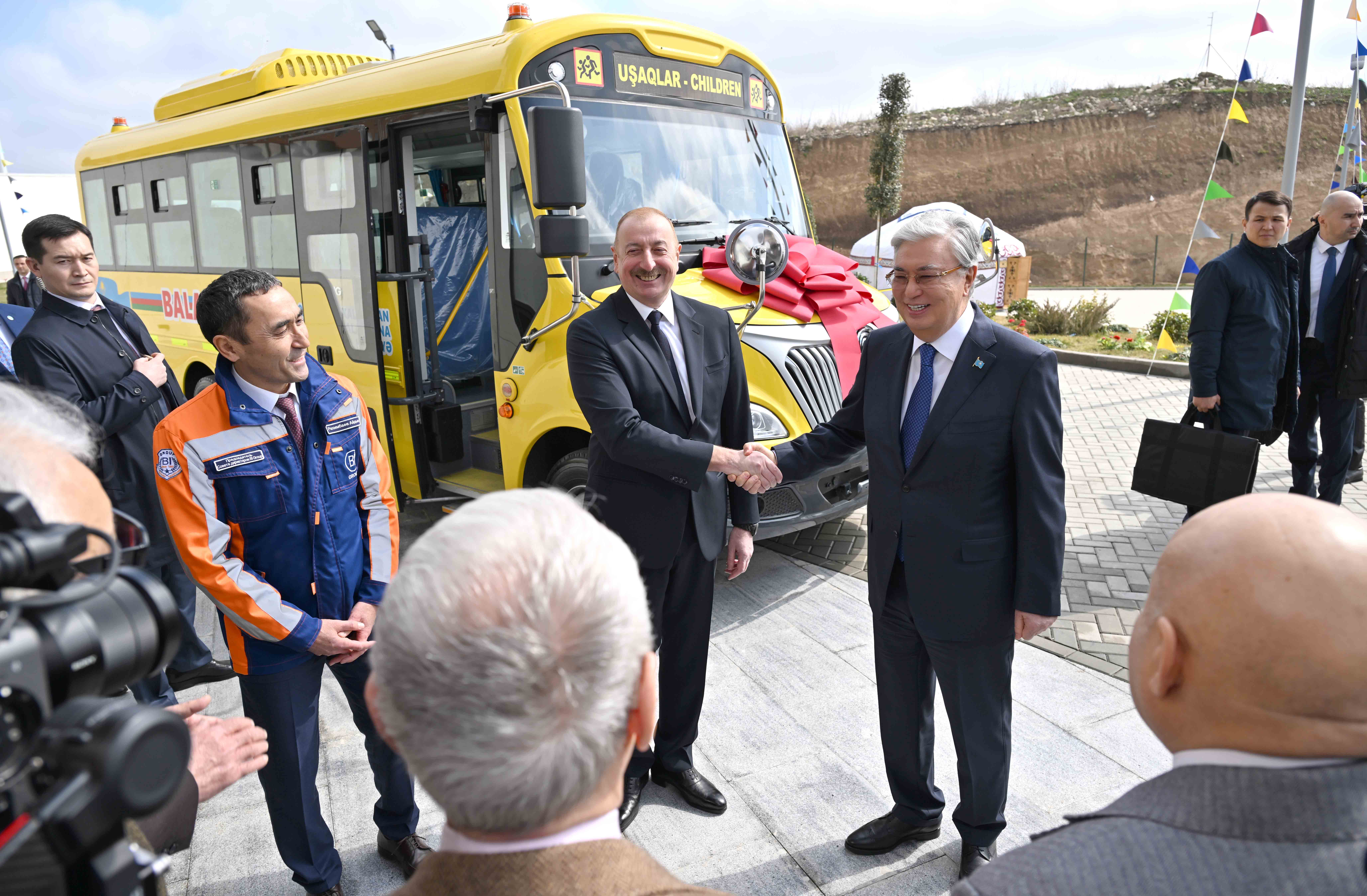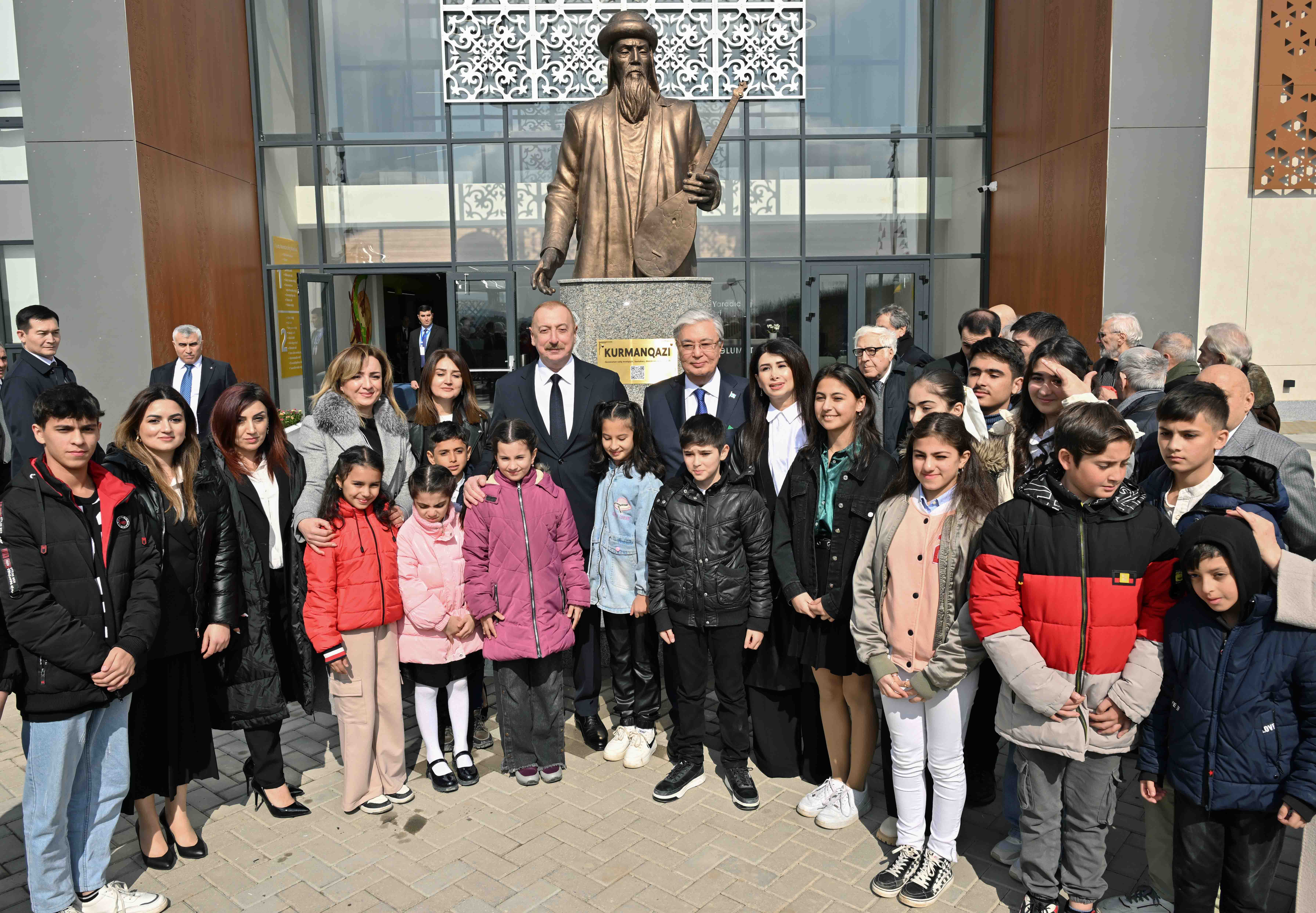 Президент Казахстана Касым-Жомарт Токаев и Президент Азербайджана Ильхам Алиев приняли участие в торжественной церемонии открытия Центра детского творчества имени казахского композитора Курмангазы.