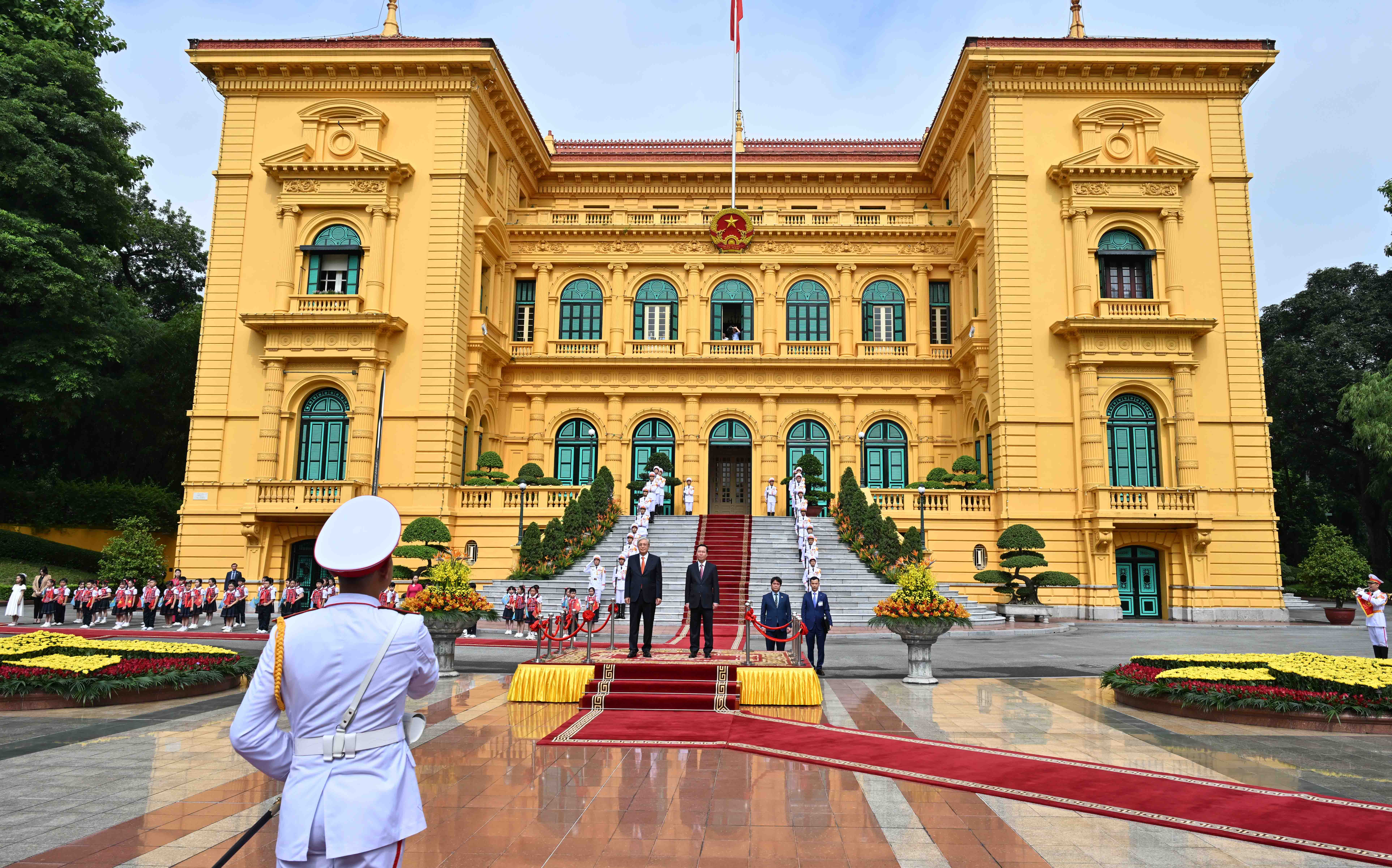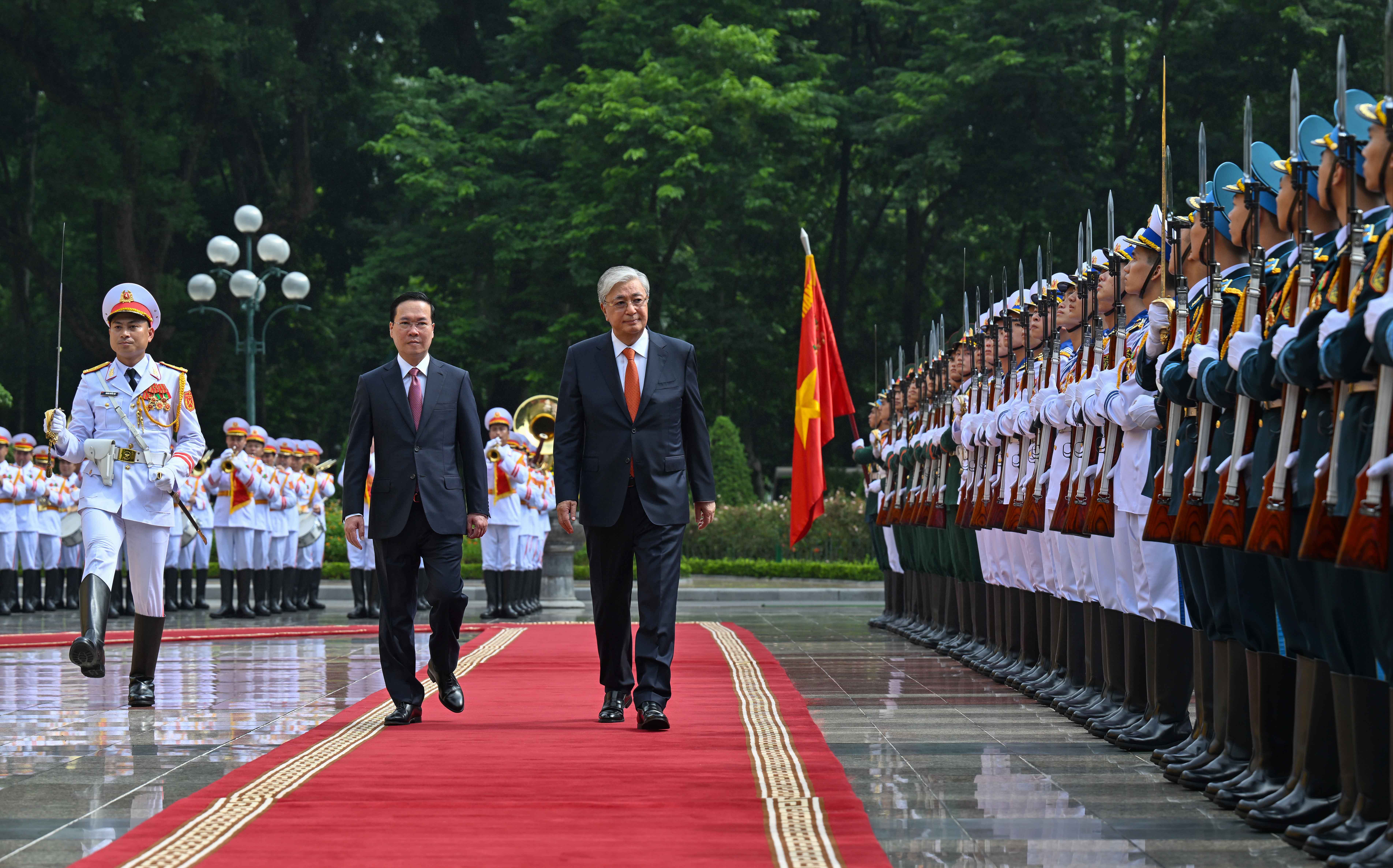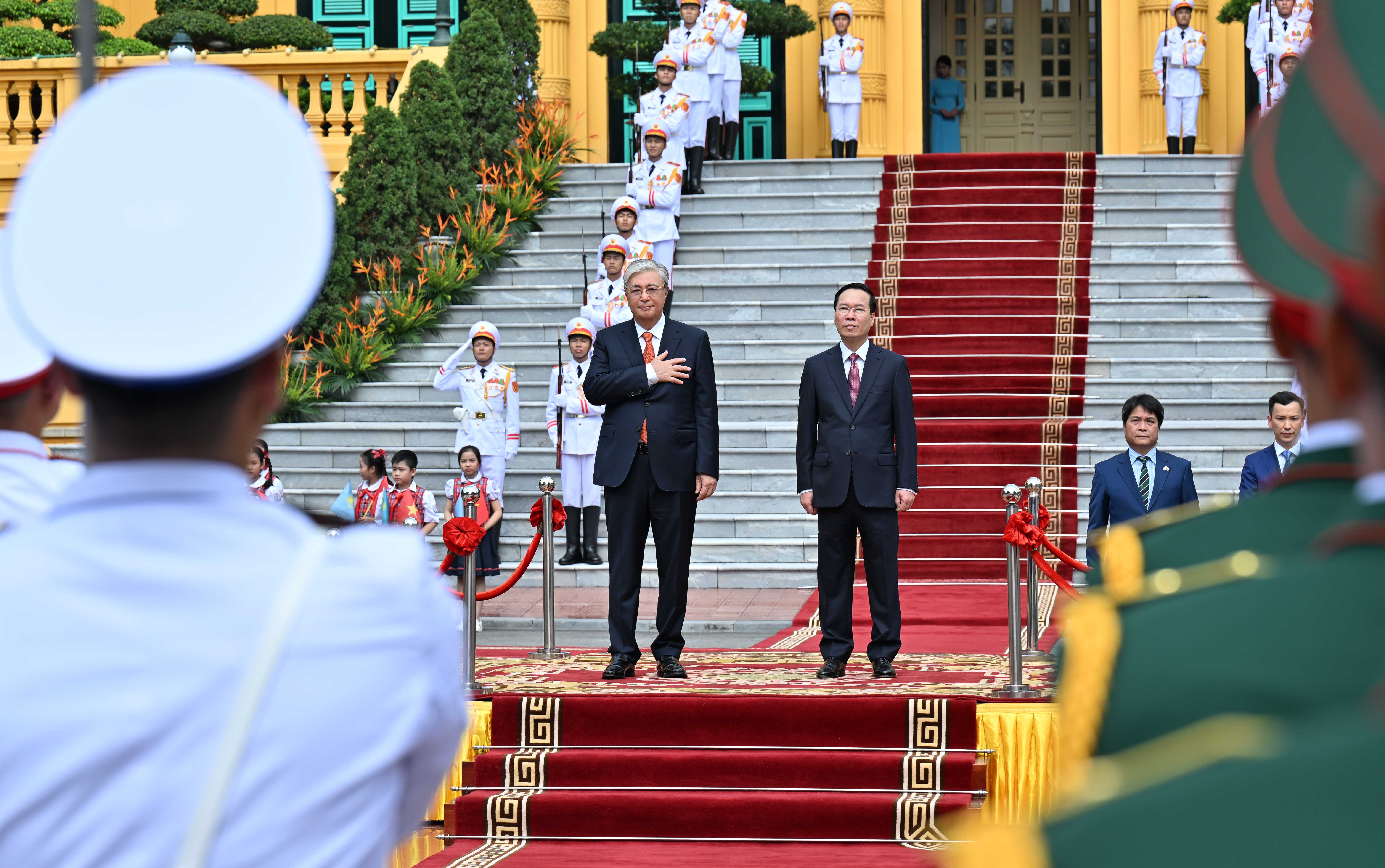 Лидеры двух стран приняли приветственный рапорт начальника роты почетного караула, прозвучали государственные гимны Казахстана и Вьетнама. Касым-Жомарт Токаев и Во Ван Тхыонг представили друг другу членов официальных делегаций.