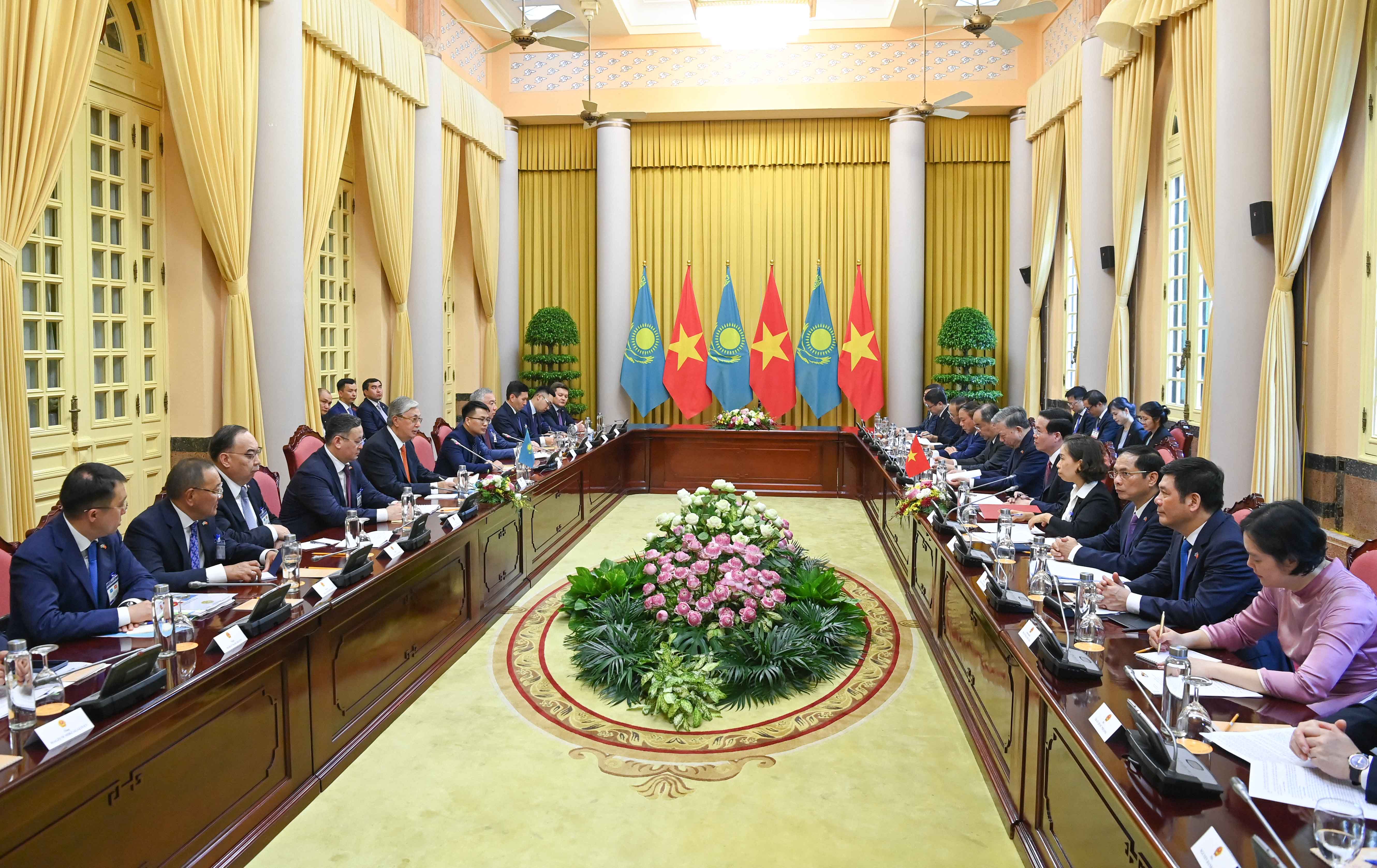 Затем президенты Казахстана и Вьетнама провели переговоры, в ходе которых были обсуждены перспективы развития сотрудничества в торгово-экономической, инвестиционной, энергетической, транспортно-логистической, агропромышленной и культурно-гуманитарной сферах.
