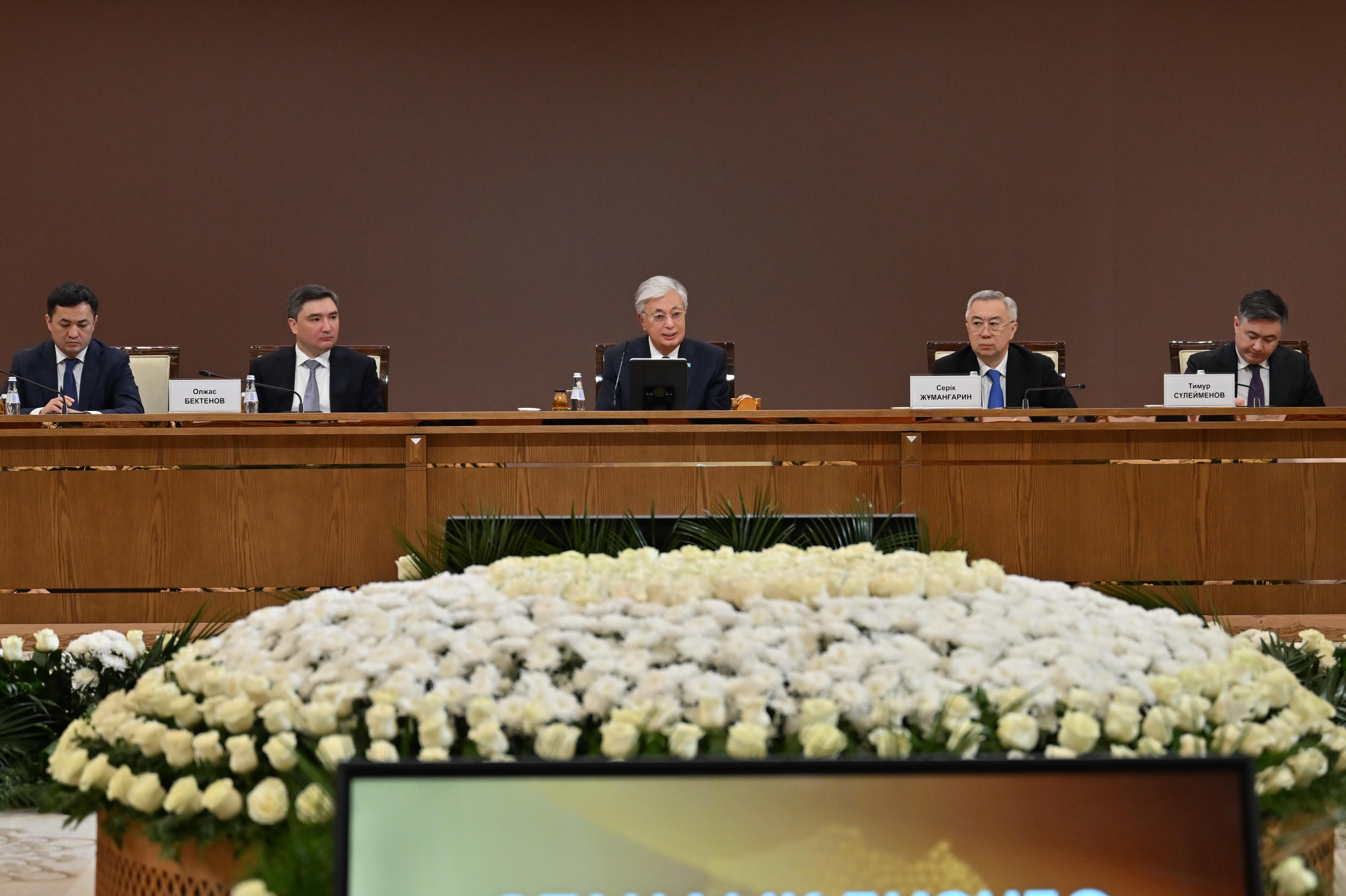 Касым-Жомарт Токаев отметил, что Казахстан вступил в эпоху новых смыслов, новых точек зрения и новых подходов к решению ключевых задач современности, а также в эпоху ухода в прошлое устоявшихся стереотипов. Поэтому стране предстоит тотально перестроиться и адаптироваться к новым реалиям. Президент полагает, что от решения этого вопроса зависит благополучие государства и, прежде всего, подрастающего поколения. По его словам, приоритетами развития экономики должны стать крупные инфраструктурные и промышленные проекты, цифровизация и искусственный интеллект, развитие транспорта и логистики. При этом помощь малому и среднему бизнесу будет постоянно находиться в фокусе внимания Правительства.