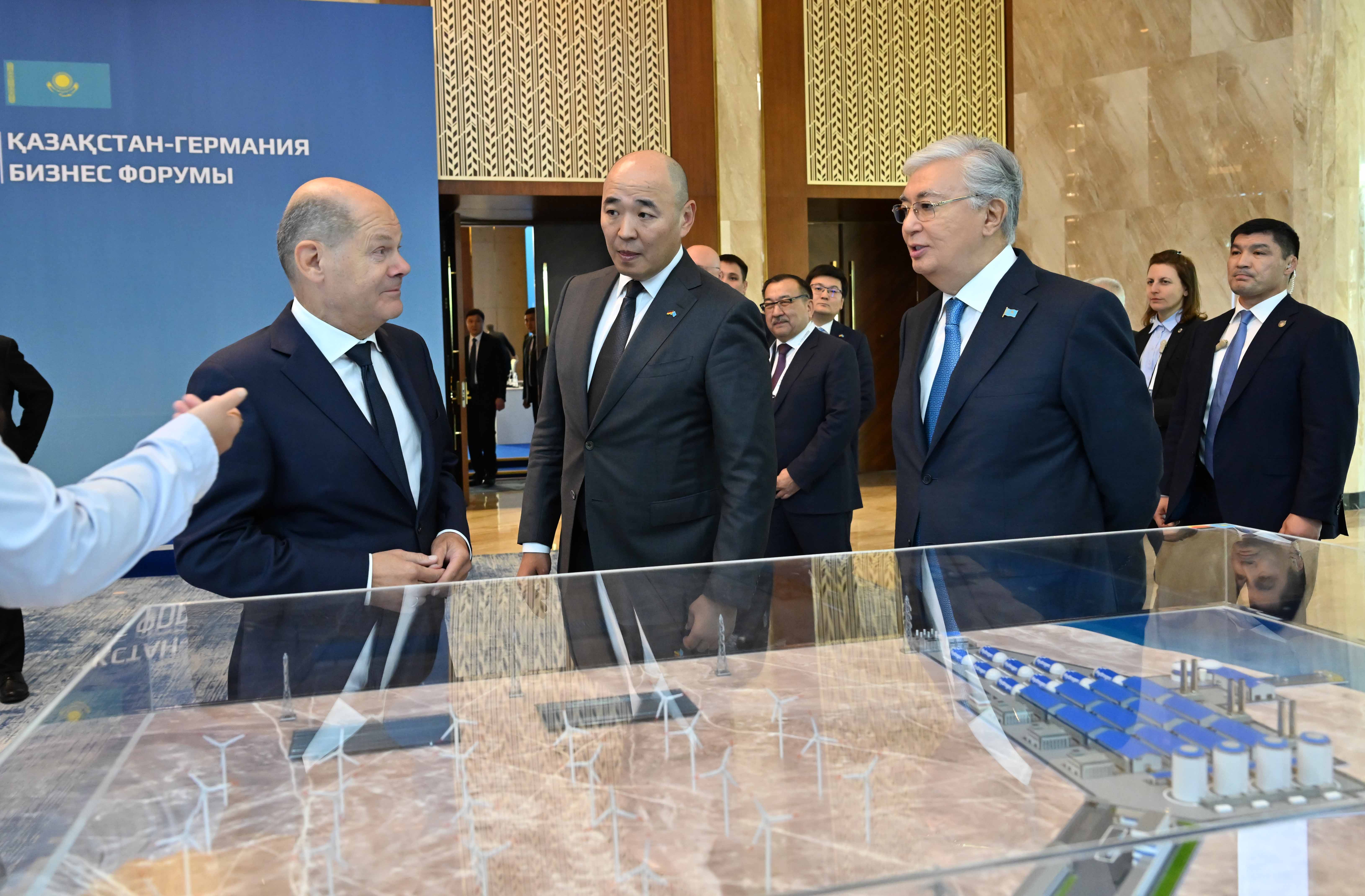 Перед началом форума Президент Казахстана и Федеральный канцлер Германии осмотрели выставку, посвященную казахско-германским совместным проектам в сферах энергетики, машиностроения, логистики, горно-металлургической отрасли и сельского хозяйства.
