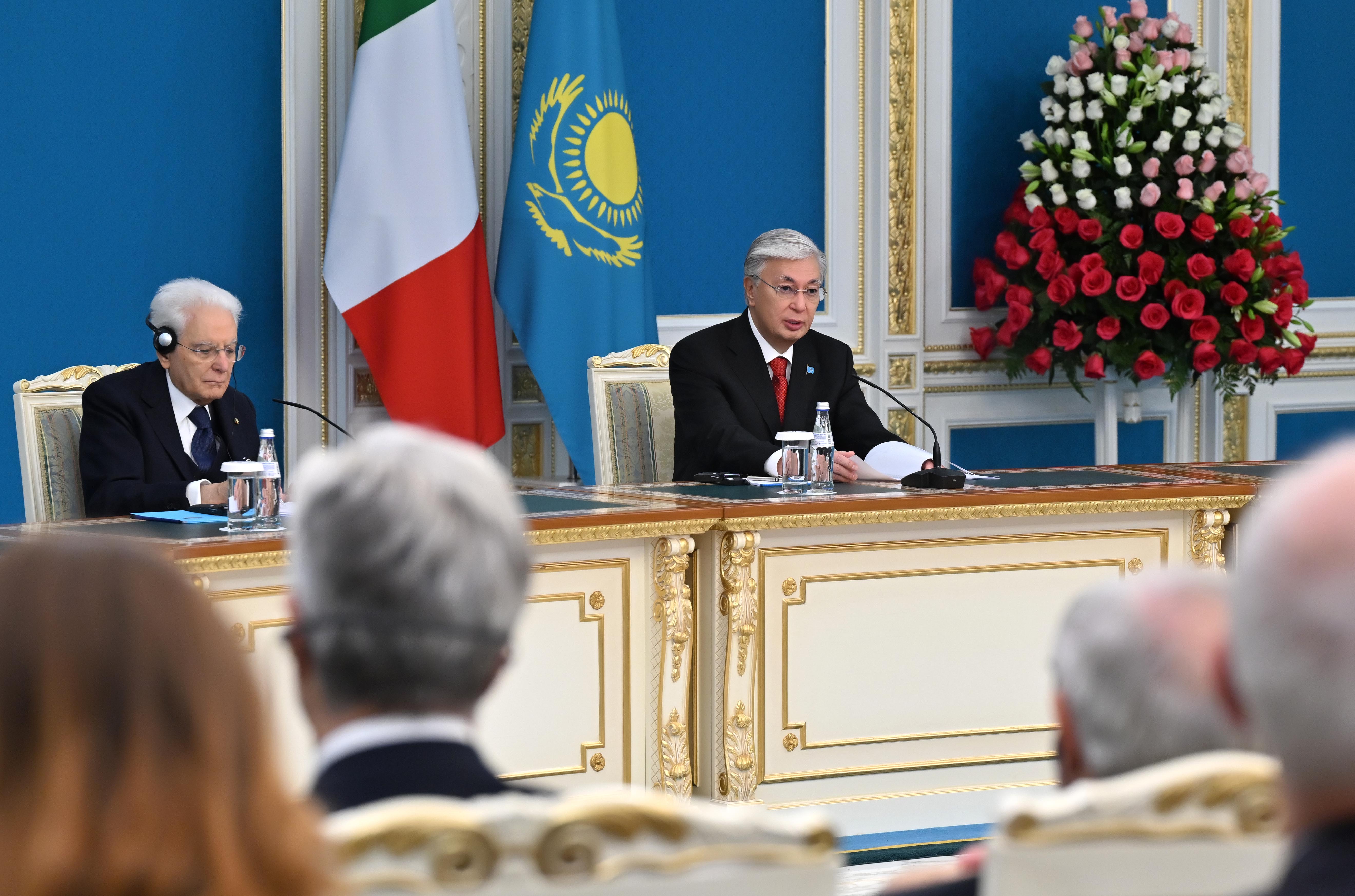 – Мы с Президентом Маттареллой выразили обеспокоенность эскалацией вооруженных конфликтов в нынешний сложный период. Наши страны считают, что все проблемы должны решаться только мирным политико-дипломатическим путем в соответствии с Уставом Организации Объединенных Наций. Казахстан и Италия заинтересованы в налаживании международного сотрудничества. Неизменно поддерживая взаимные инициативы, мы готовы активно участвовать в укреплении глобального мира и стабильности. Особое значение наши страны придают дальнейшему развитию многосторонней дипломатии. Поэтому хотел бы выразить уверенность в том, что диалоговая площадка «Центральная Азия – Италия» придаст дополнительный импульс укреплению регионального сотрудничества. Как Вы знаете, первое заседание саммита состоялось в этом году в Астане по инициативе итальянской стороны. Все это способствует координации наших усилий в рамках международных структур. Хотел бы выразить глубокую признательность Италии за поддержку инициативы открытия Регионального центра ООН по ЦУР для Центральной Азии и Афганистана в Алматы, – заявил Президент.