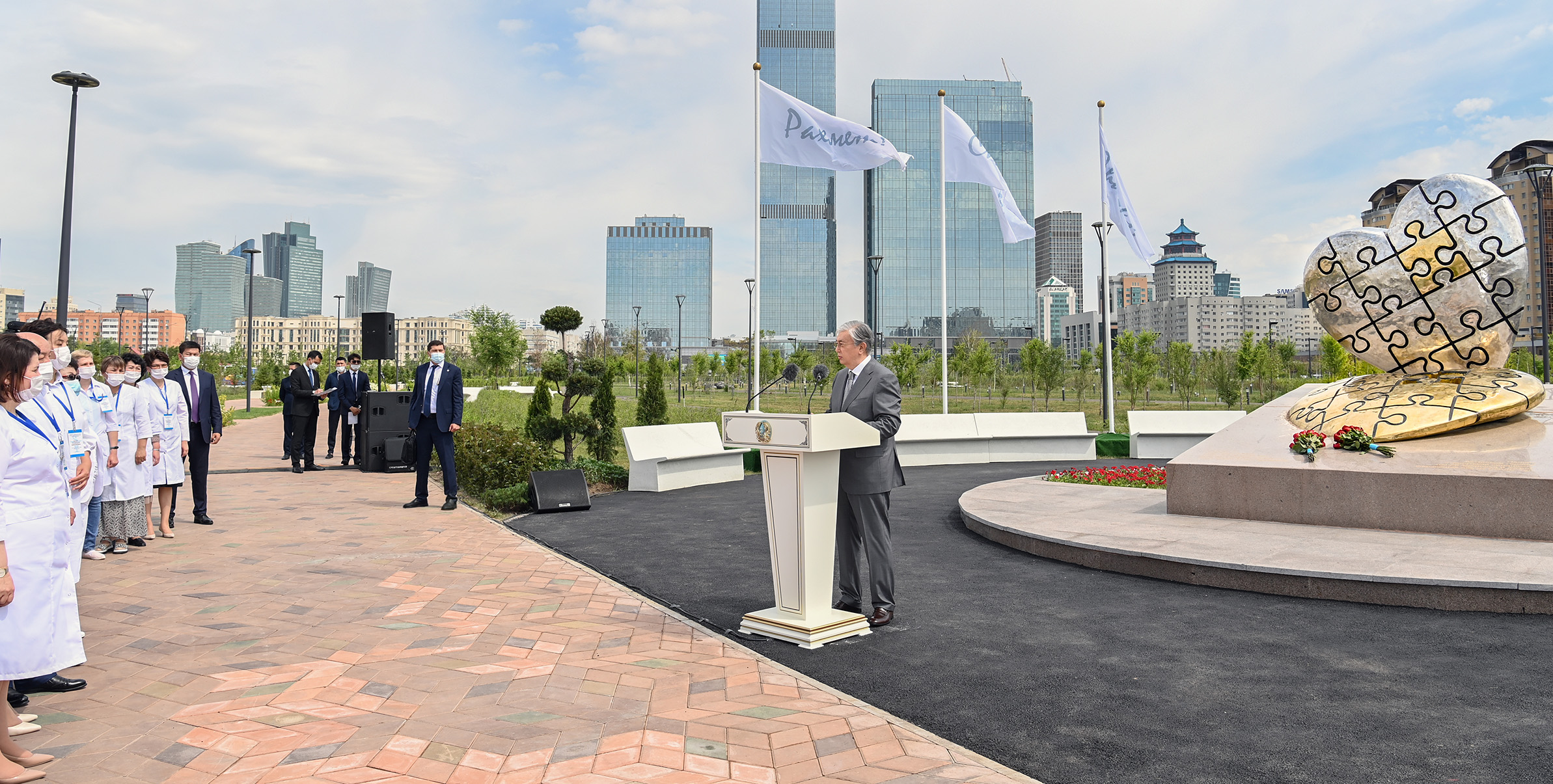 Президент принял участие в церемонии открытия мемориала «Алтын жүрек», возведенного в знак признательности медицинским работникам нашей страны, внесшим вклад в борьбу с коронавирусом. Мемориал расположен в новом Линейном парке столицы со стороны улиц Алматы и Ақмешіт.