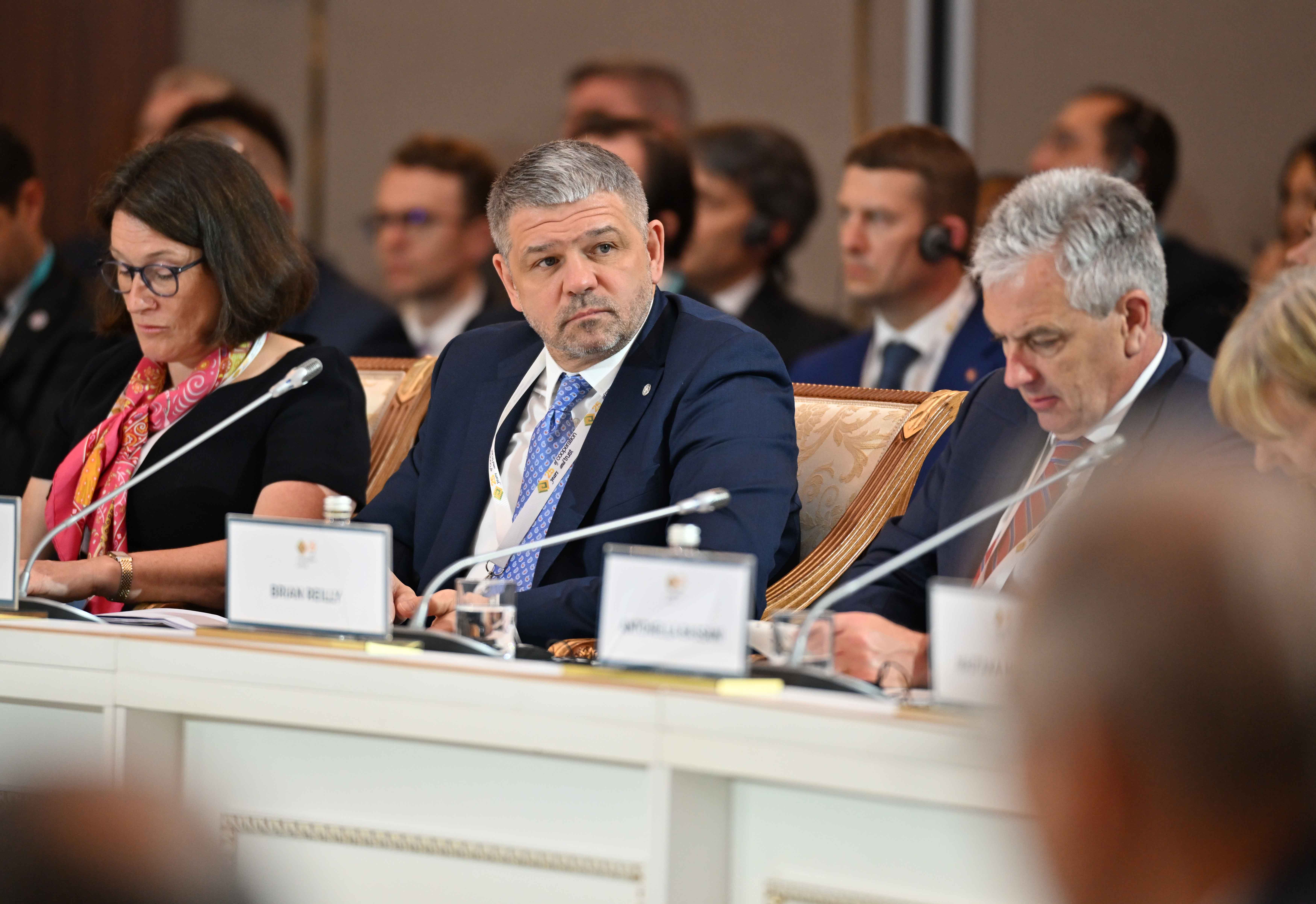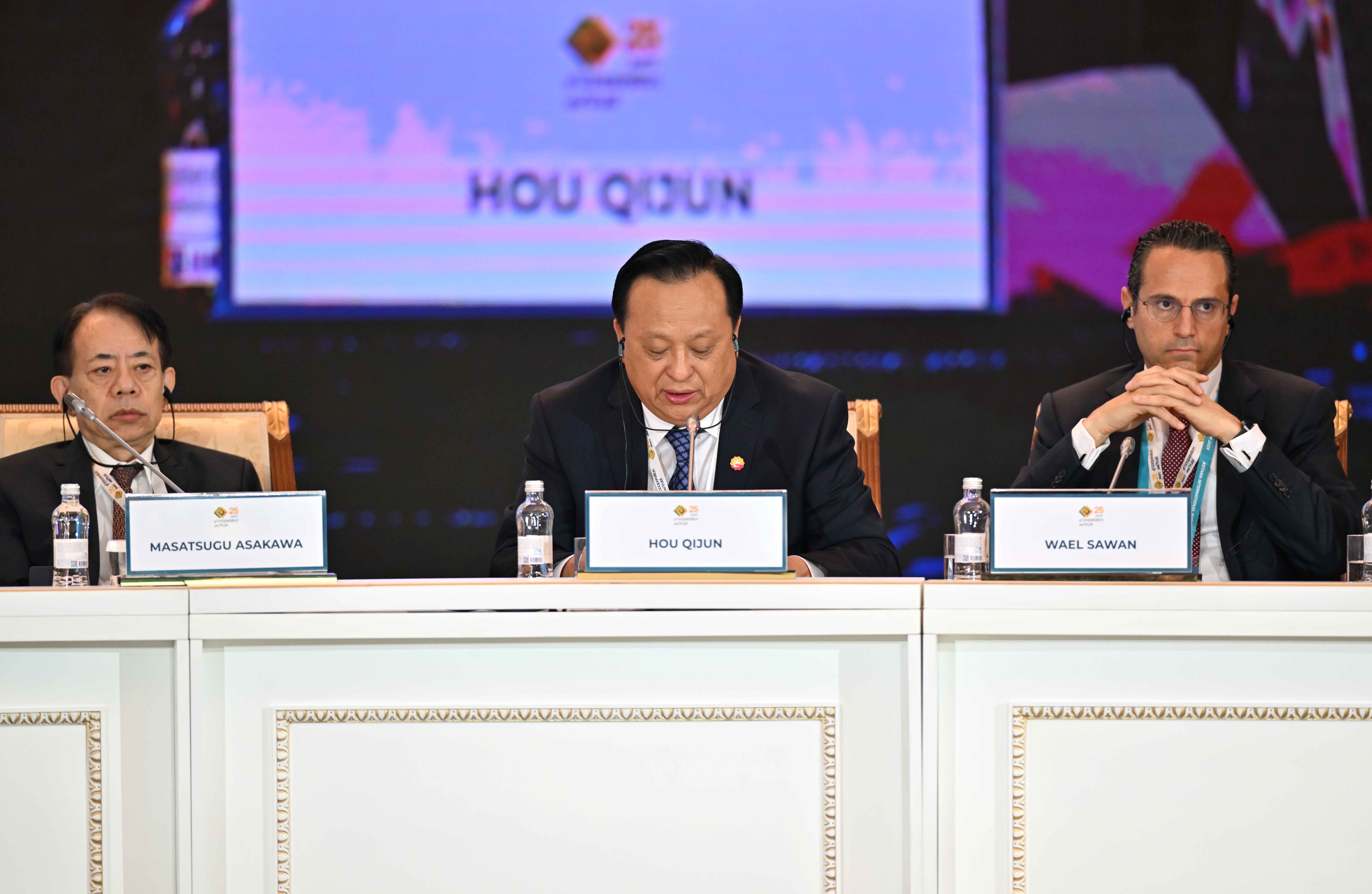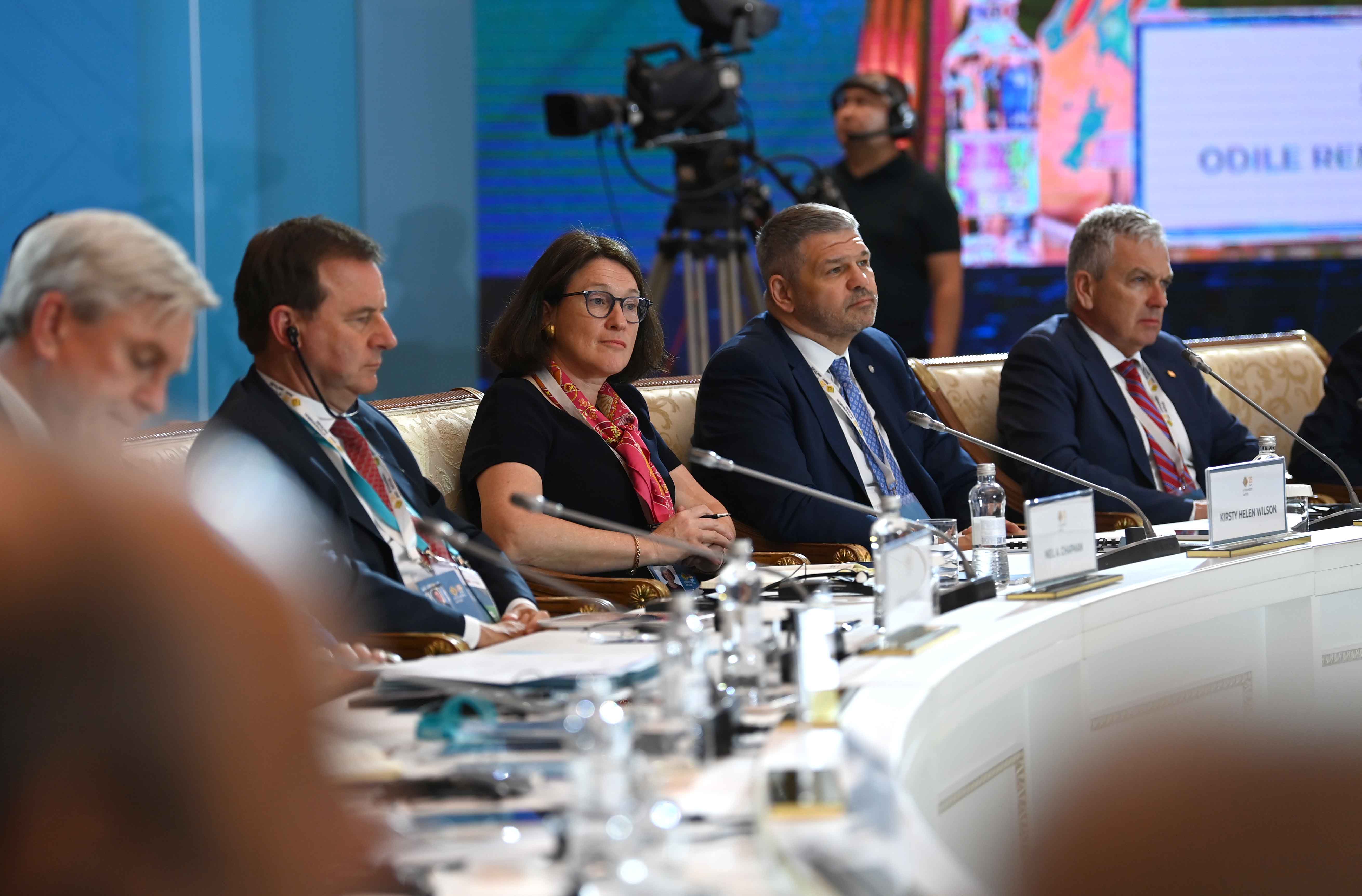 На заседании также выступили президент Европейского банка реконструкции и развития Одиль Рено-Бассо, заместитель Премьер-министра – министр иностранных дел Мурат Нуртлеу, министр цифрового развития, инноваций и аэрокосмической промышленности Багдат Мусин, председатель правления Ассоциации «Казахстанский совет иностранных инвесторов» Ерлан Досымбеков, президент Азиатского банка развития Масацугу Асакава, президент компании CNPC Хоу Цзицзюнь, главный исполнительный директор компании Shell plc Уаэл Сауан, исполнительный вице-президент корпорации Chevron Найджел Хирн, президент по СНГ и Центральной Азии Philip Morris International Марко Мариотти, главный исполнительный директор компании «ЛУКОЙЛ» Вадим Воробьев, управляющий партнер компании Ernst&Young по региону Европы, Ближнего Востока и Африки Джули Линн Тигланд, главный исполнительный директор Air Liquide Франсуа Жаков, председатель и главный исполнительный директор Baker Hughes Лоренцо Симонелли, генеральный директор подразделения Microsoft по Центральной и Восточной Европе Мишель Симмонс, президент и главный исполнительный директор Wabtec Corporation Рафаэль Сантана.