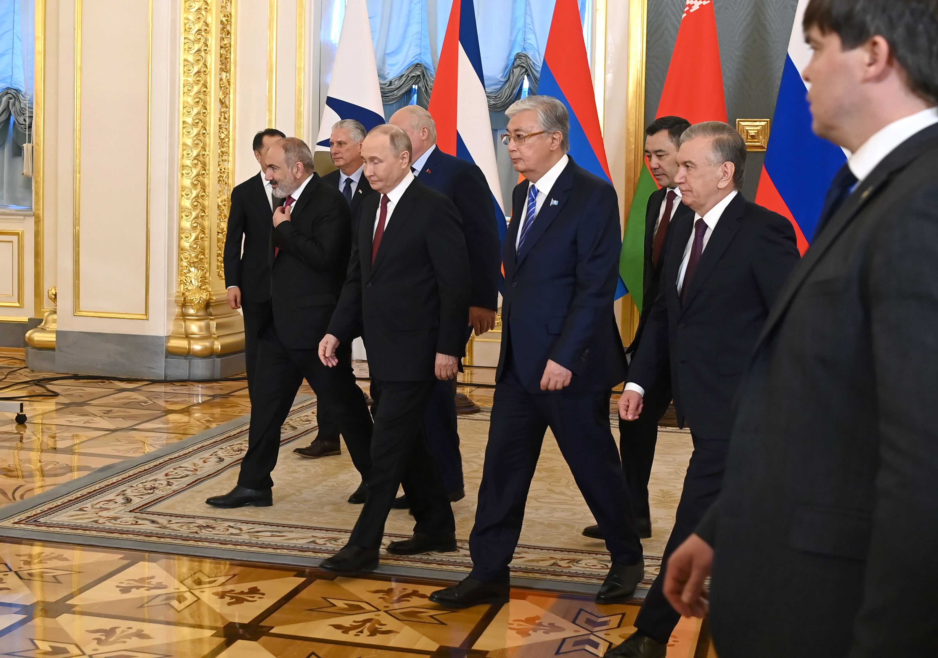 По его мнению, высокий уровень интеграционного взаимодействия подкрепляется совместной реализацией крупных инфраструктурных проектов, развитием промышленной кооперации и формированием общего рынка услуг. Касым-Жомарт Токаев считает, что для дальнейшего устойчивого развития в условиях геополитической неопределенности объединение должно стать более гибким и эффективным. Он привел оценки Всемирного банка, по которым темпы роста мирового ВВП в первой половине текущего десятилетия могут оказаться самыми низкими за последние 30 лет.