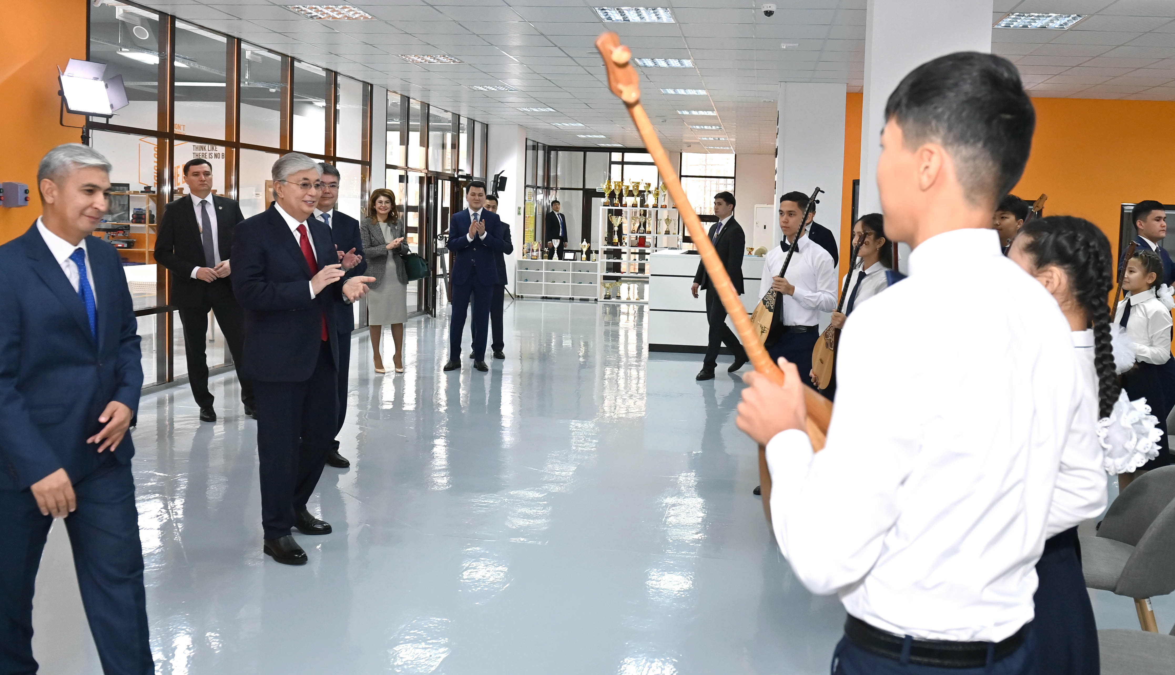 Президент осмотрел проекты, созданные в STEM-лаборатории JasSpace, а также послушал кюй Курмангазы «Балбырауын» в исполнении молодых домбристов.