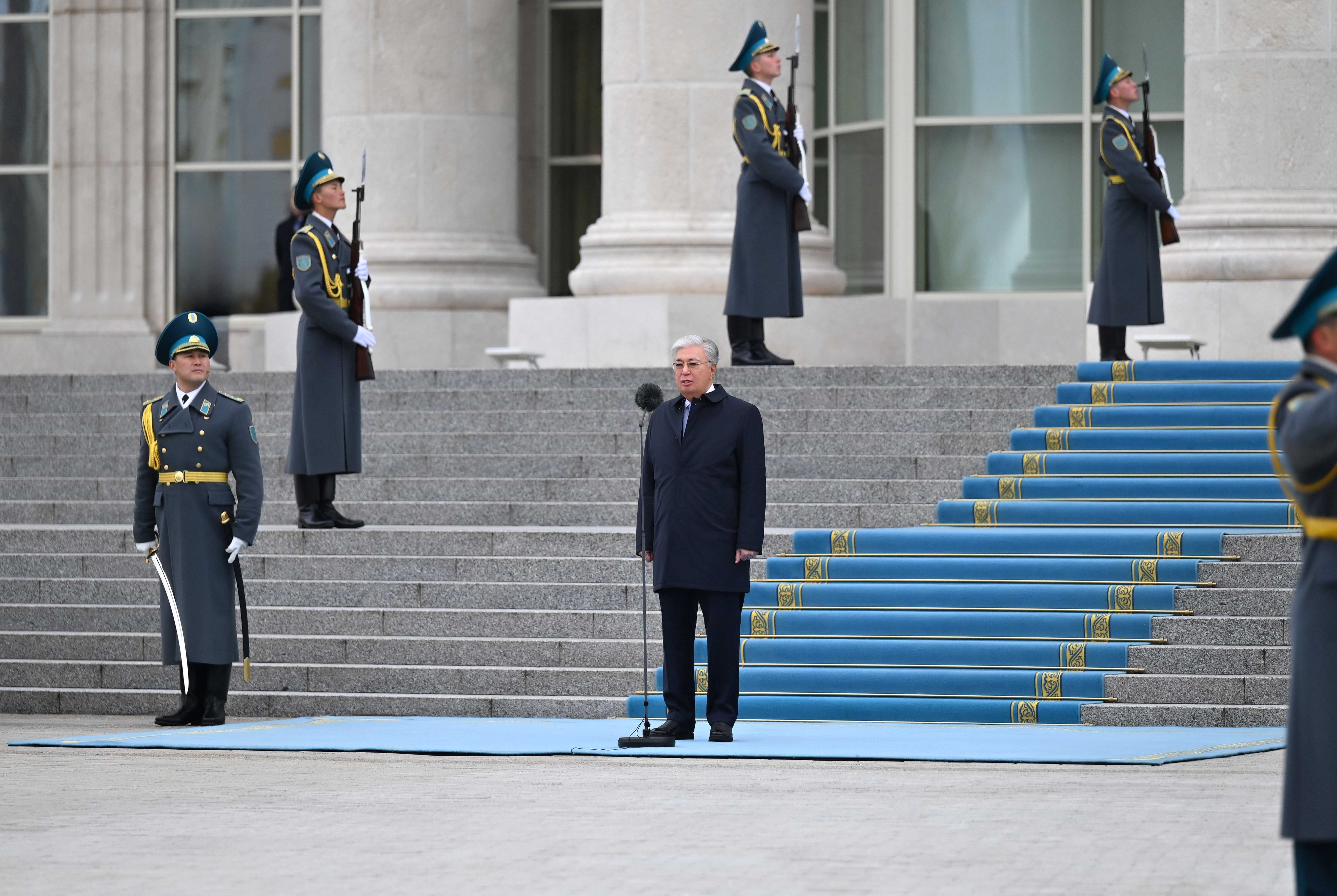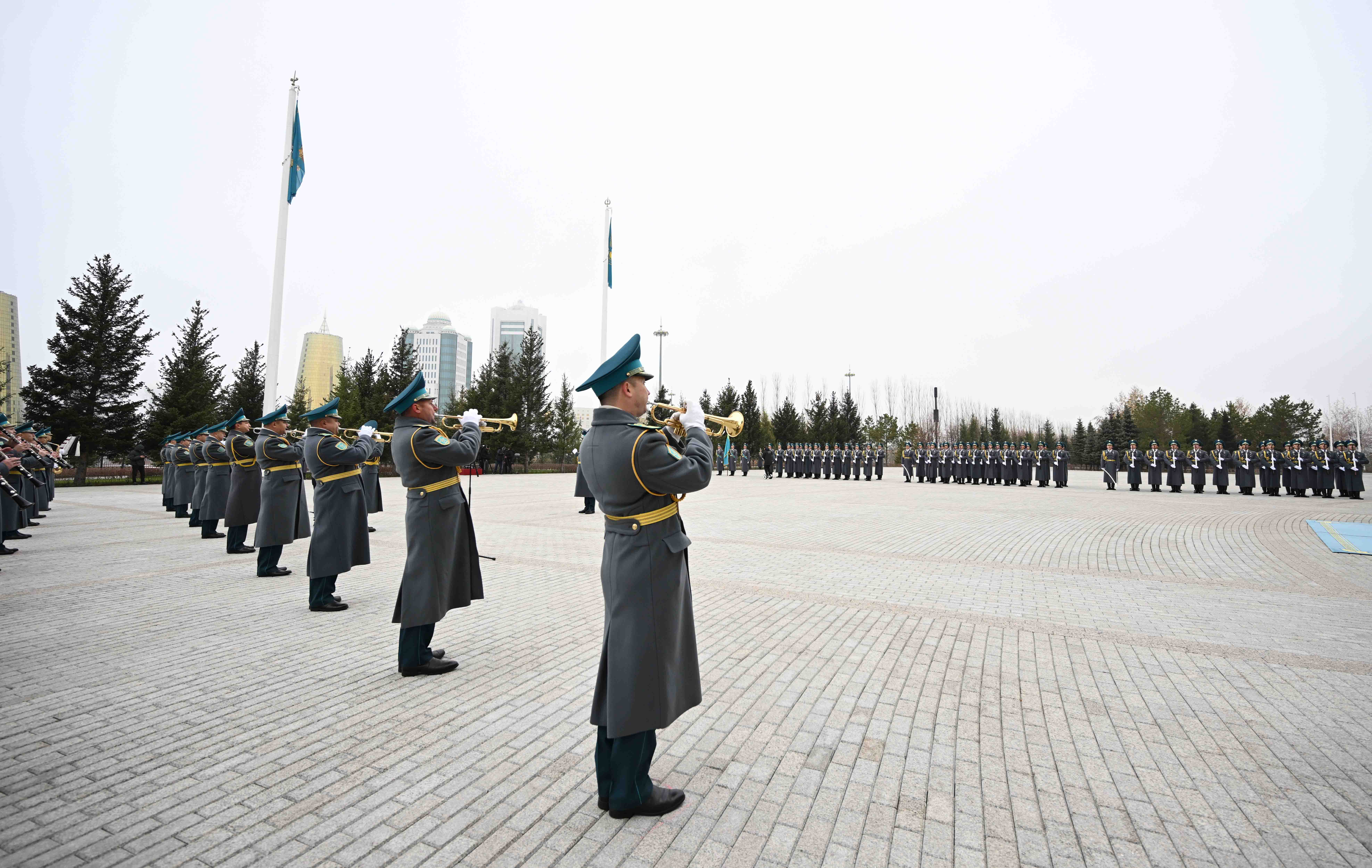 Начальник роты Почетного караула отдал Президенту рапорт. Затем был поднят Государственный флаг и прозвучал Государственный гимн.