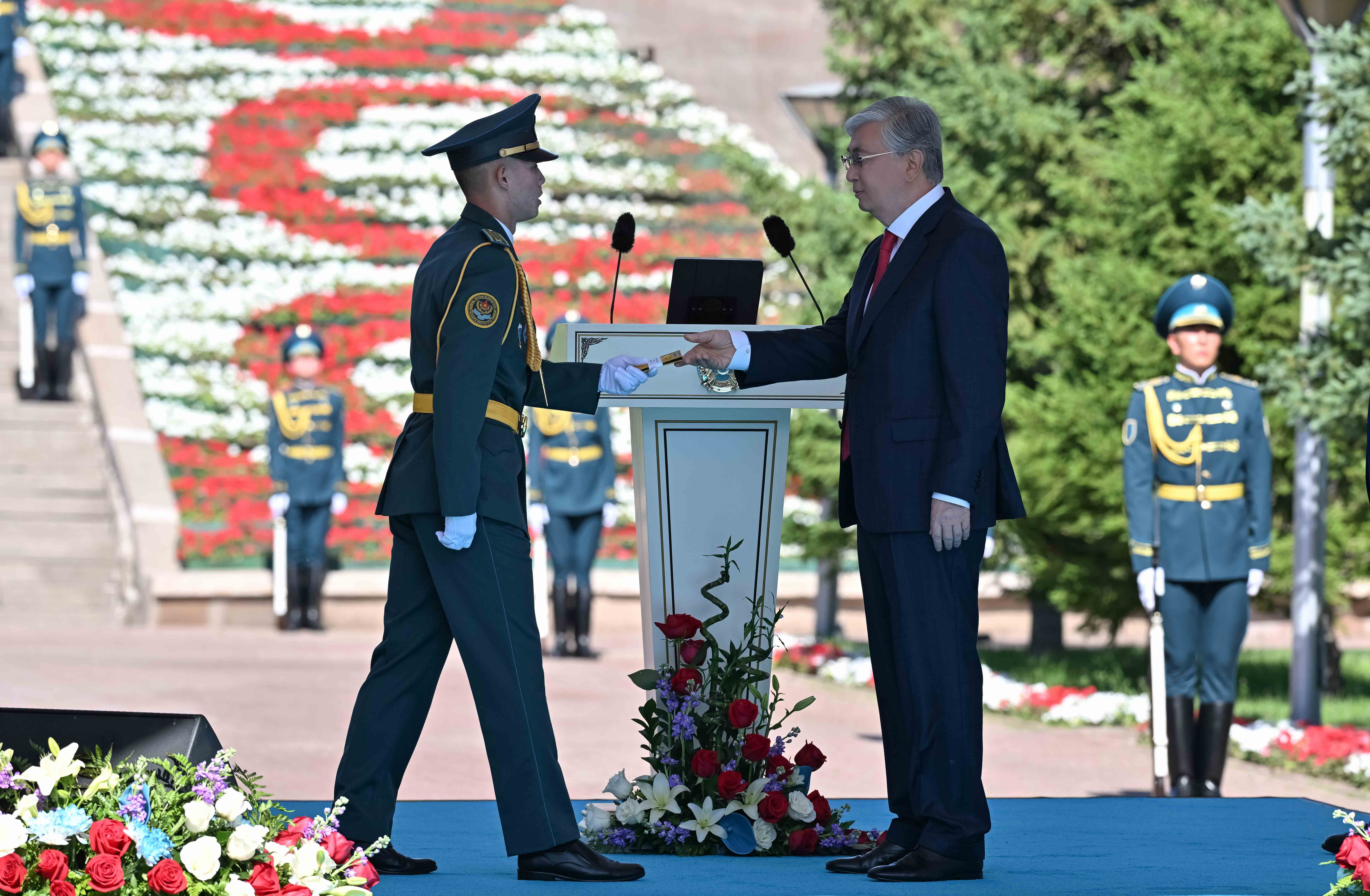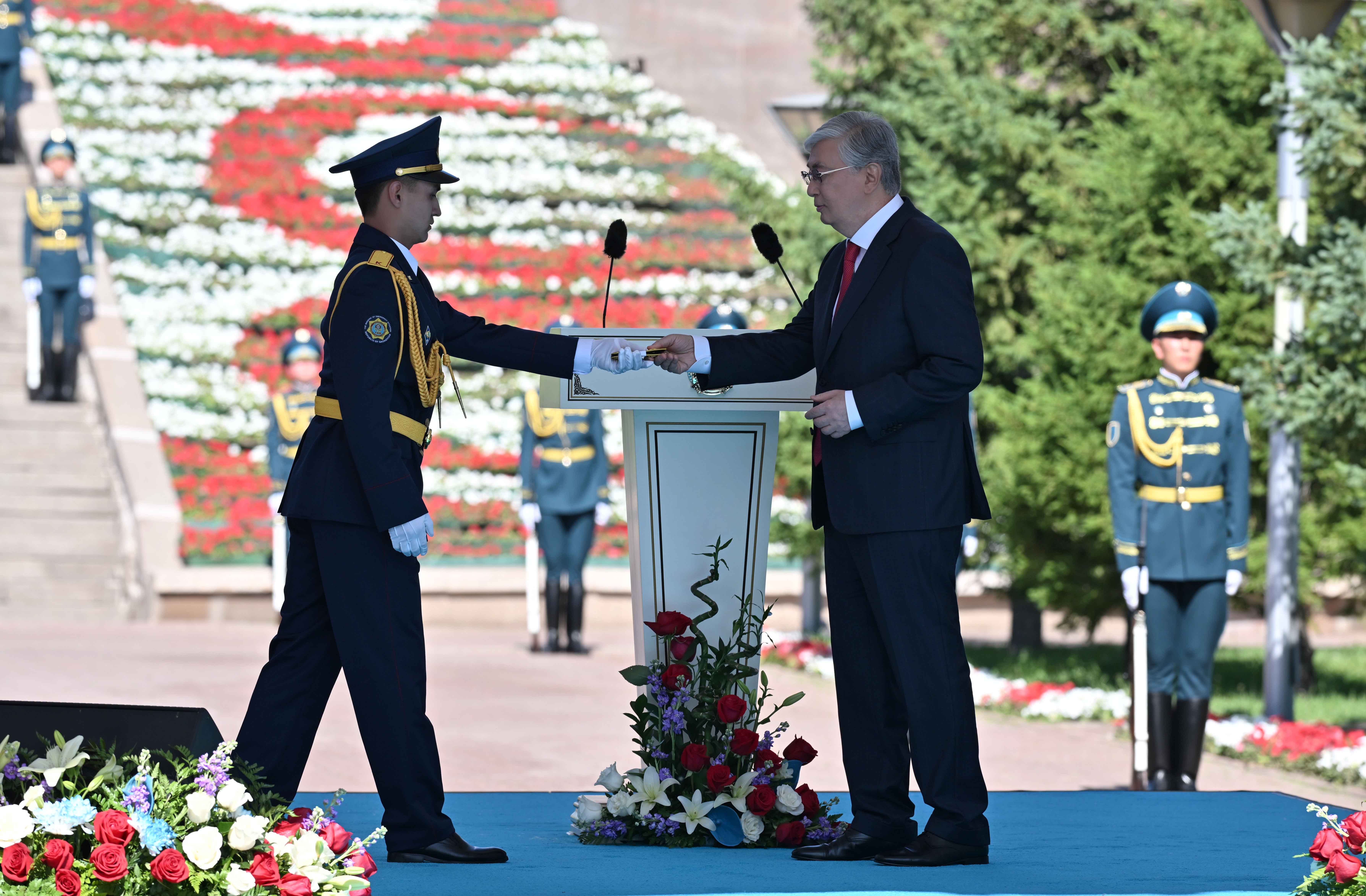 В ходе церемонии 12 лучших выпускников военных вузов получили офицерские погоны из рук Президента – Верховного главнокомандующего Вооруженными силами Республики Казахстан.