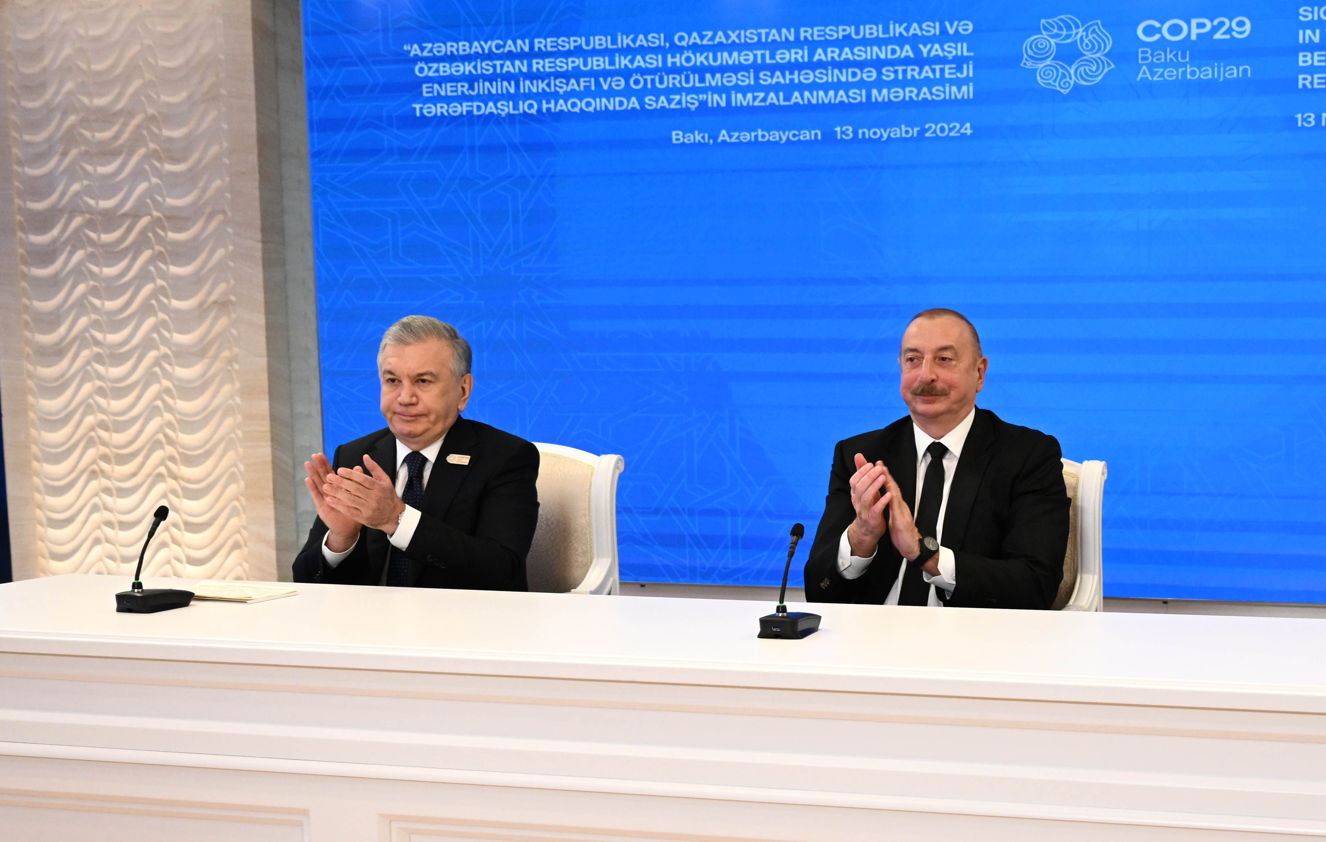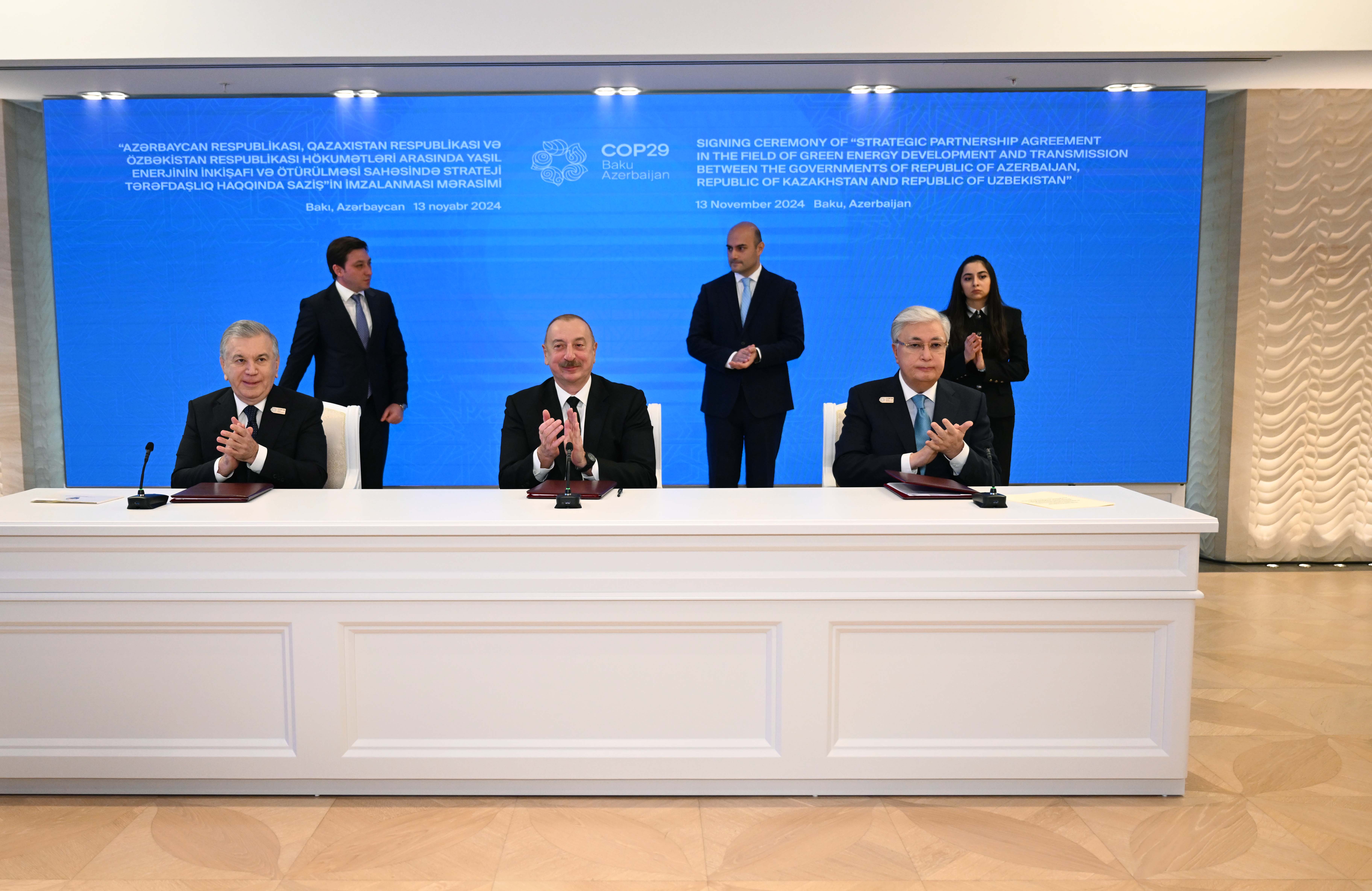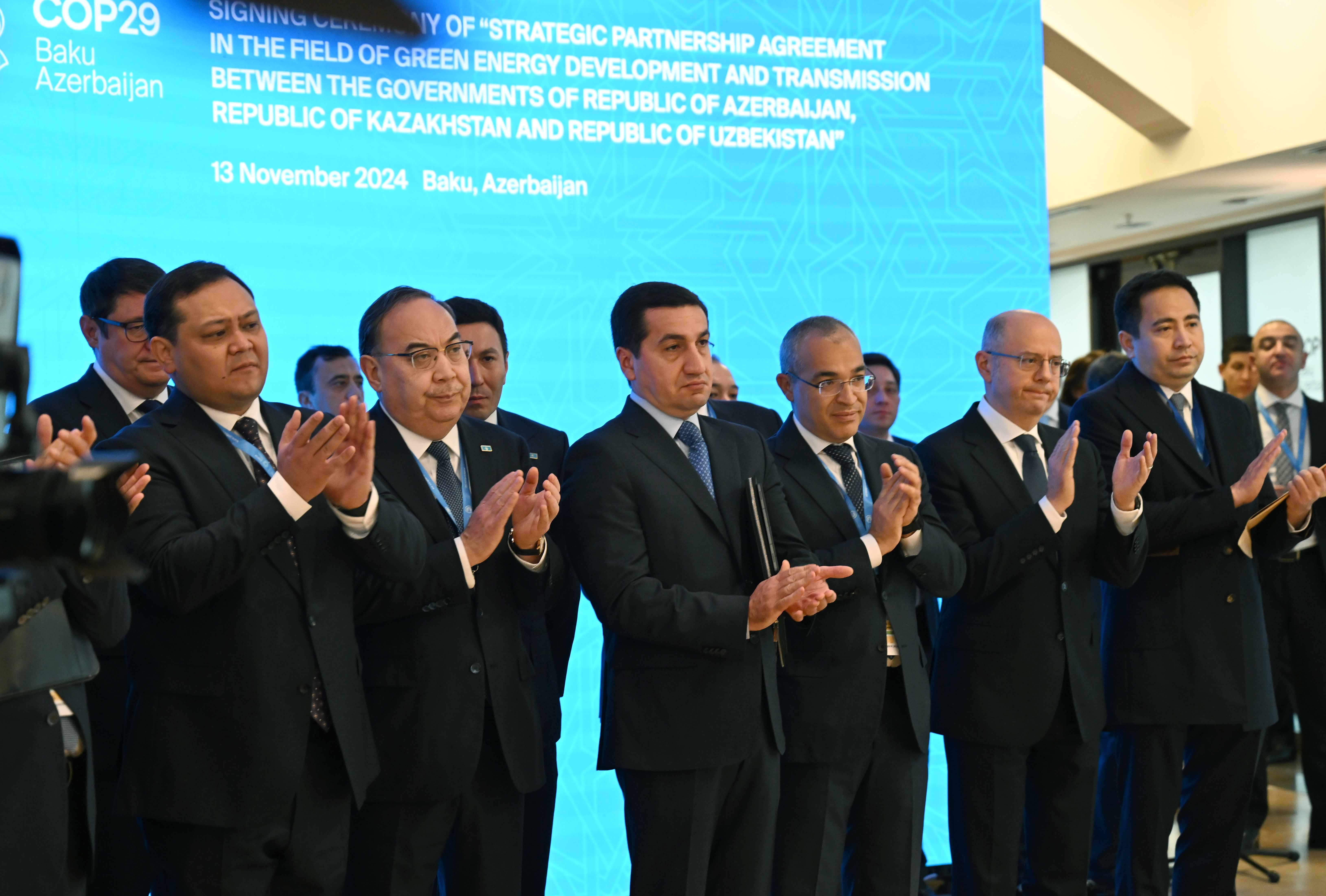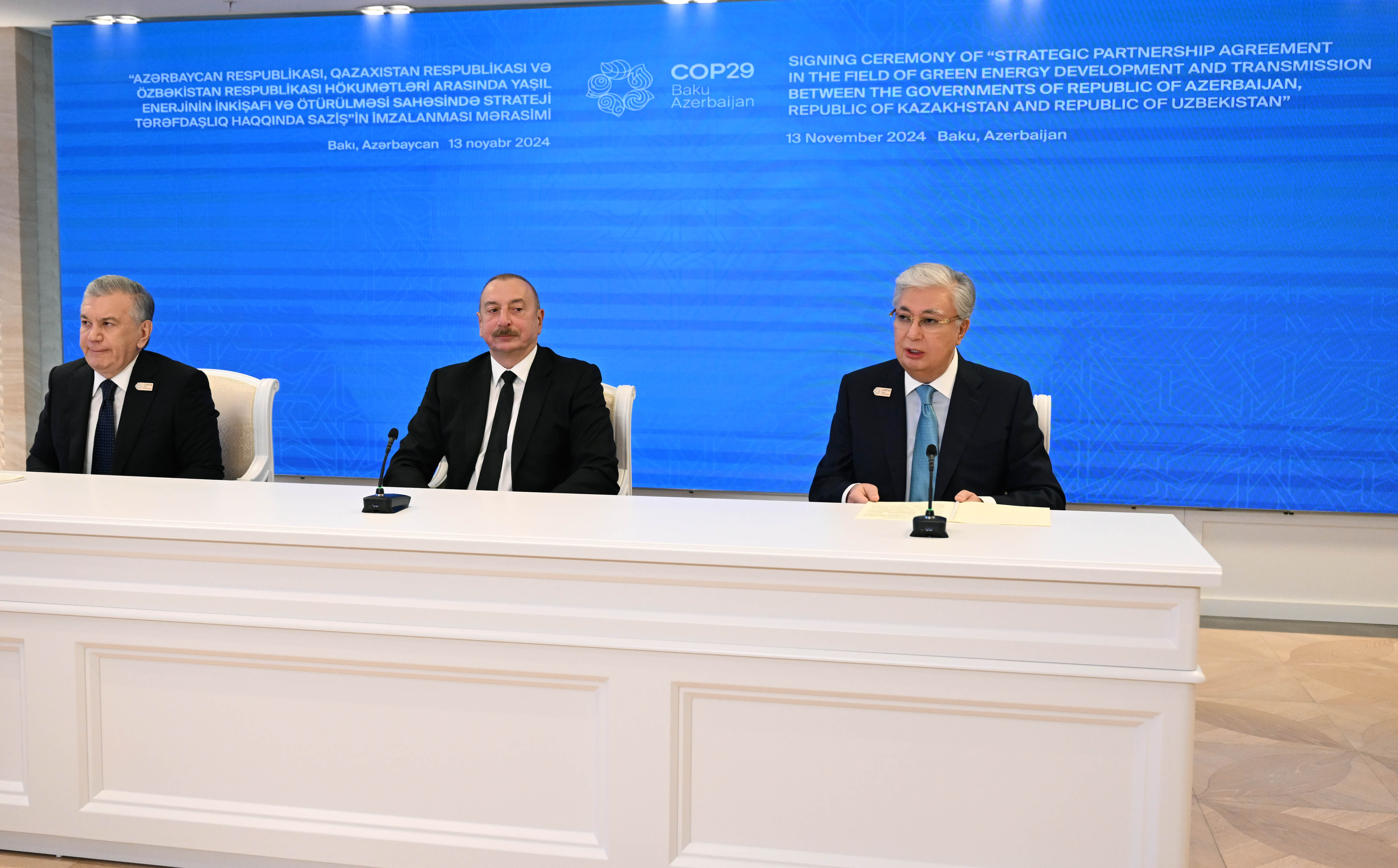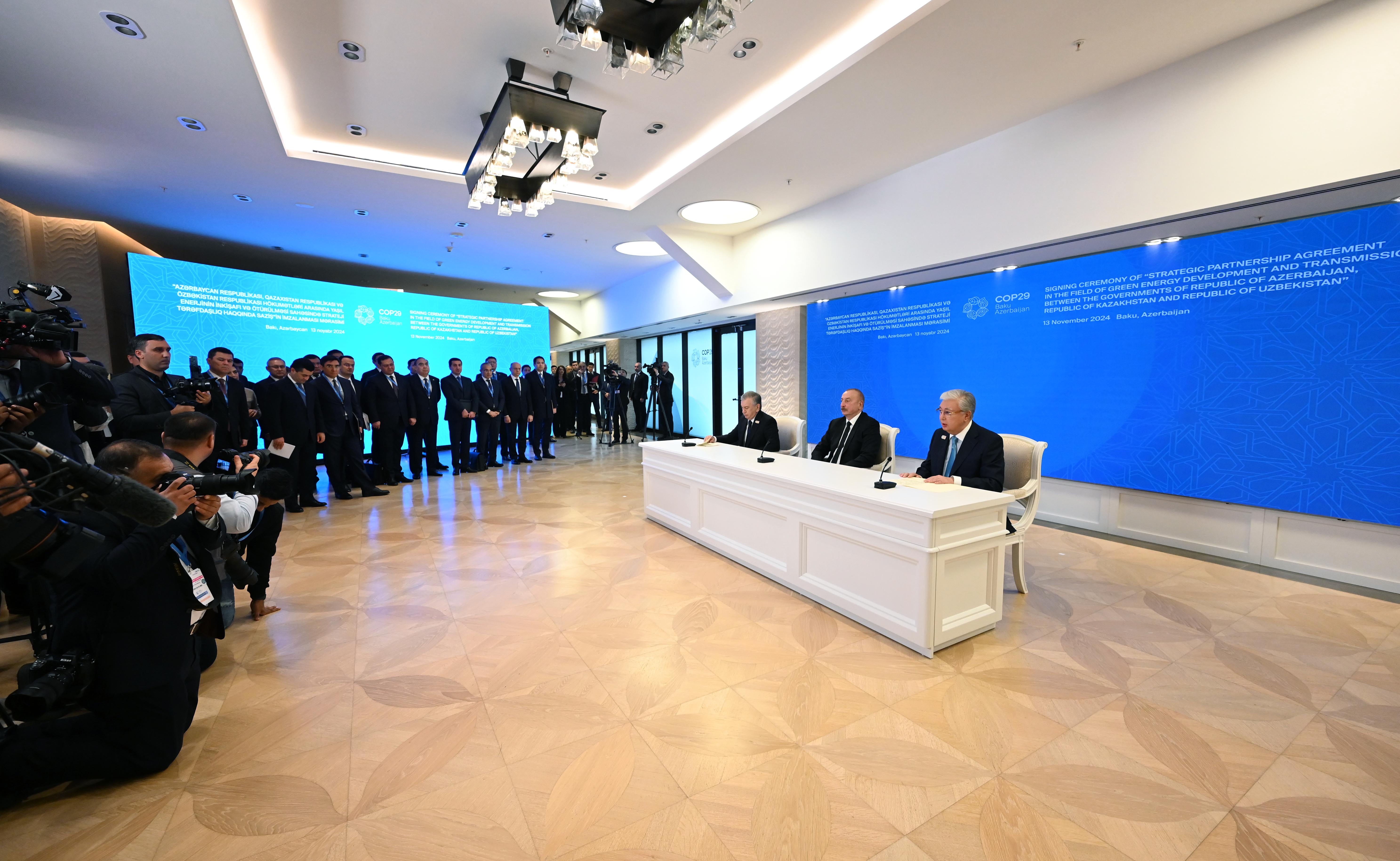 На полях Всемирного климатического саммита СOP 29 главы государств Касым-Жомарт Токаев, Ильхам Алиев и Шавкат Мирзиёев подписали Соглашение о стратегическом партнерстве в области производства и передачи зеленой энергии между Республикой Казахстан, Азербайджанской Республикой и Республикой Узбекистан.