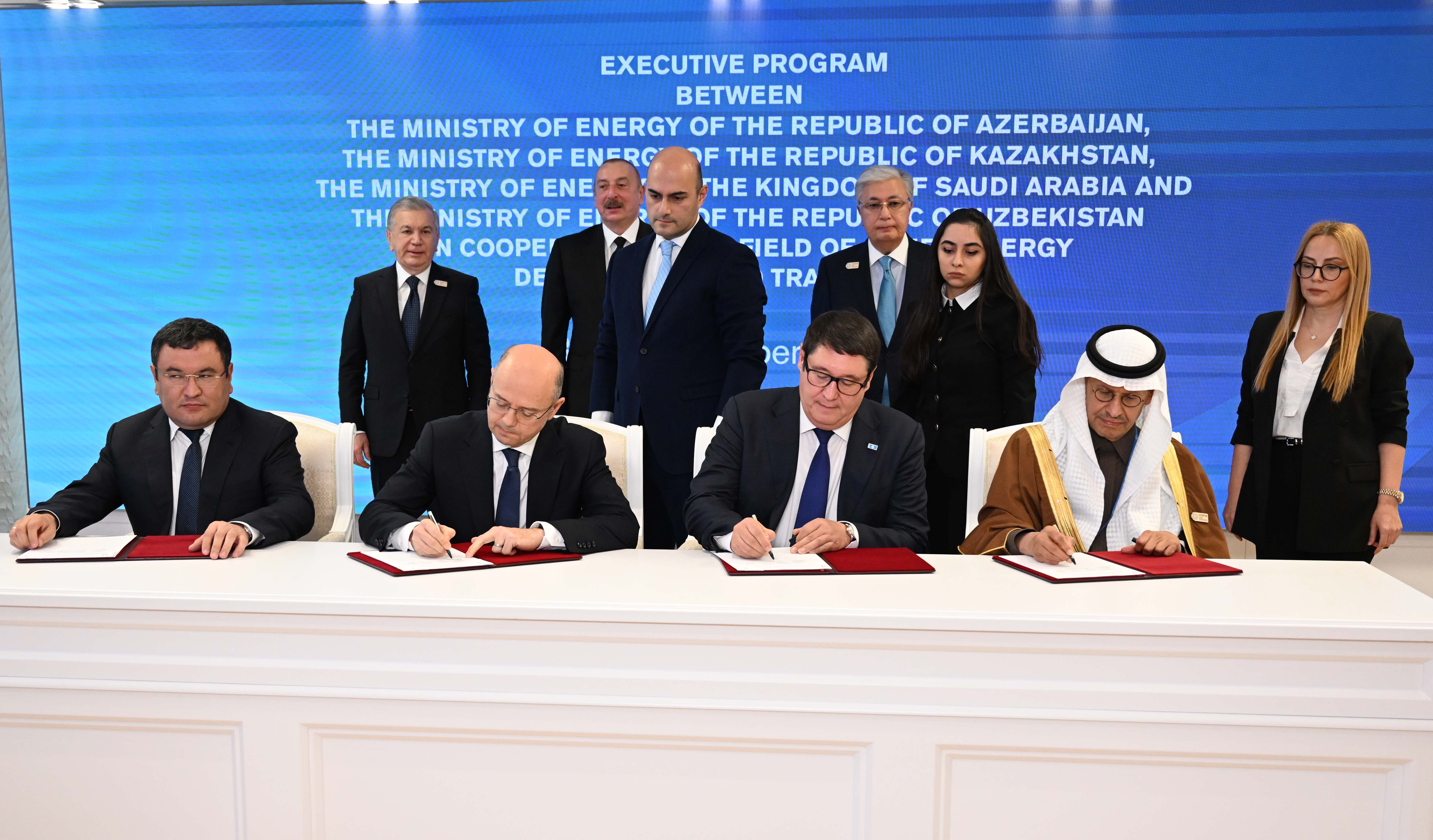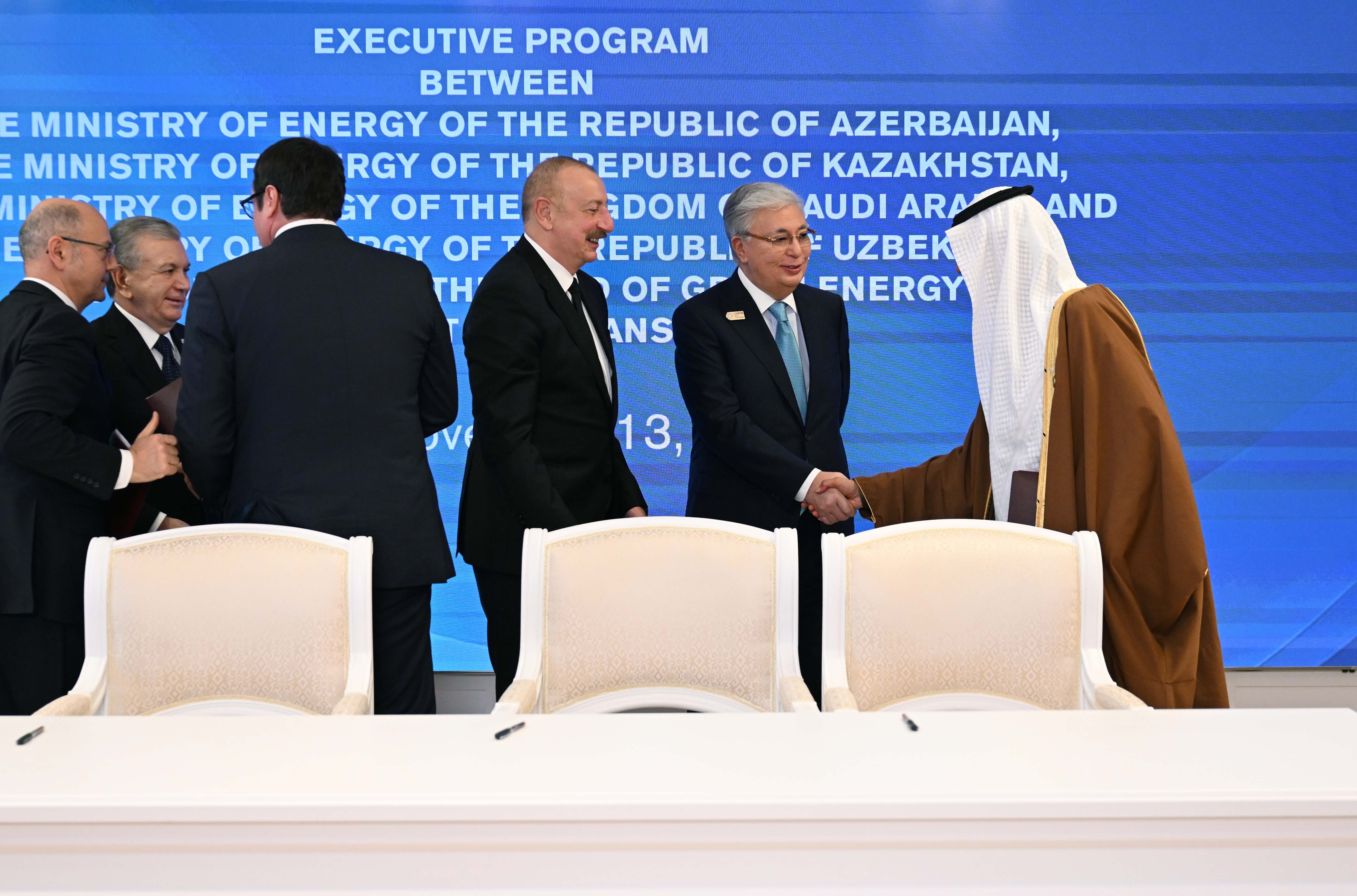 Кроме того, в присутствии глав государств министр энергетики Казахстана Алмасадам Саткалиев, министр энергетики Азербайджана Парвиз Шахбазов, министр энергетики Узбекстана Журабек Мирзамахмудов и министр энергетики Саудовской Аравии Абдель Азиз бен Салман Аль Сауд подписали Исполнительную программу о сотрудничестве в области развития и передачи зеленой энергии.