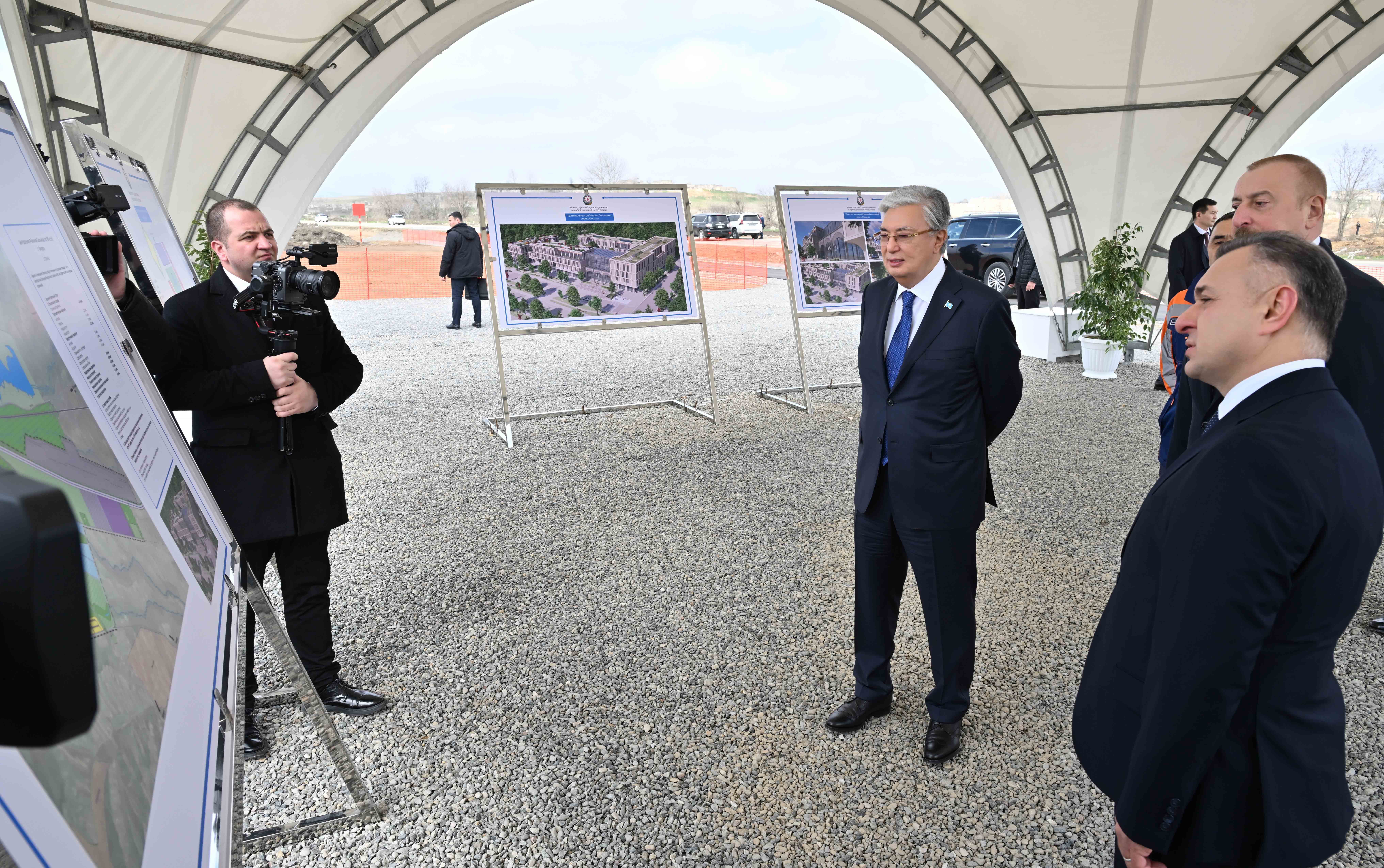 Касым-Жомарт Токаев и Ильхам Алиев в ходе посещения Физули ознакомились с планом строительства центральной городской больницы.