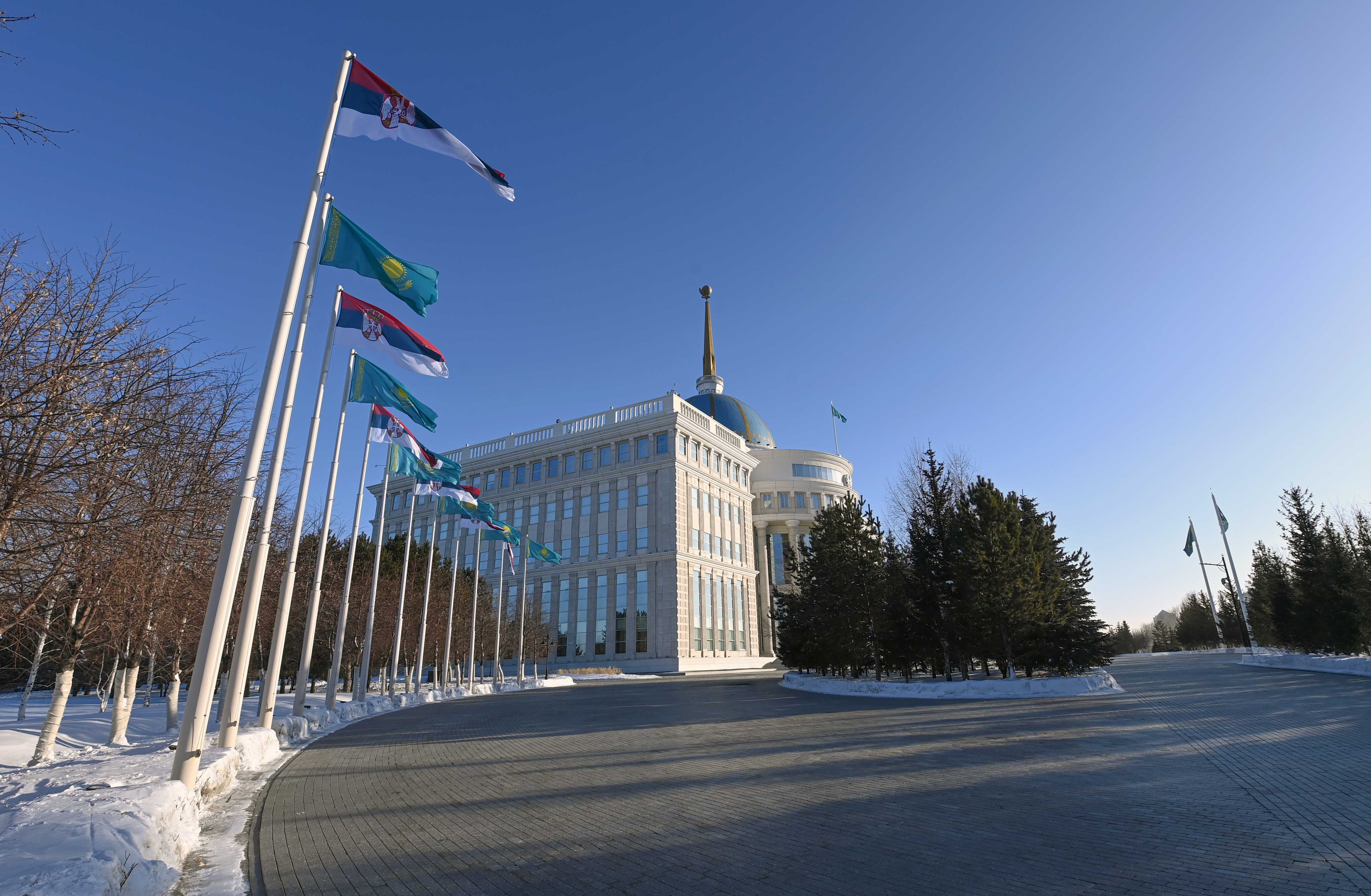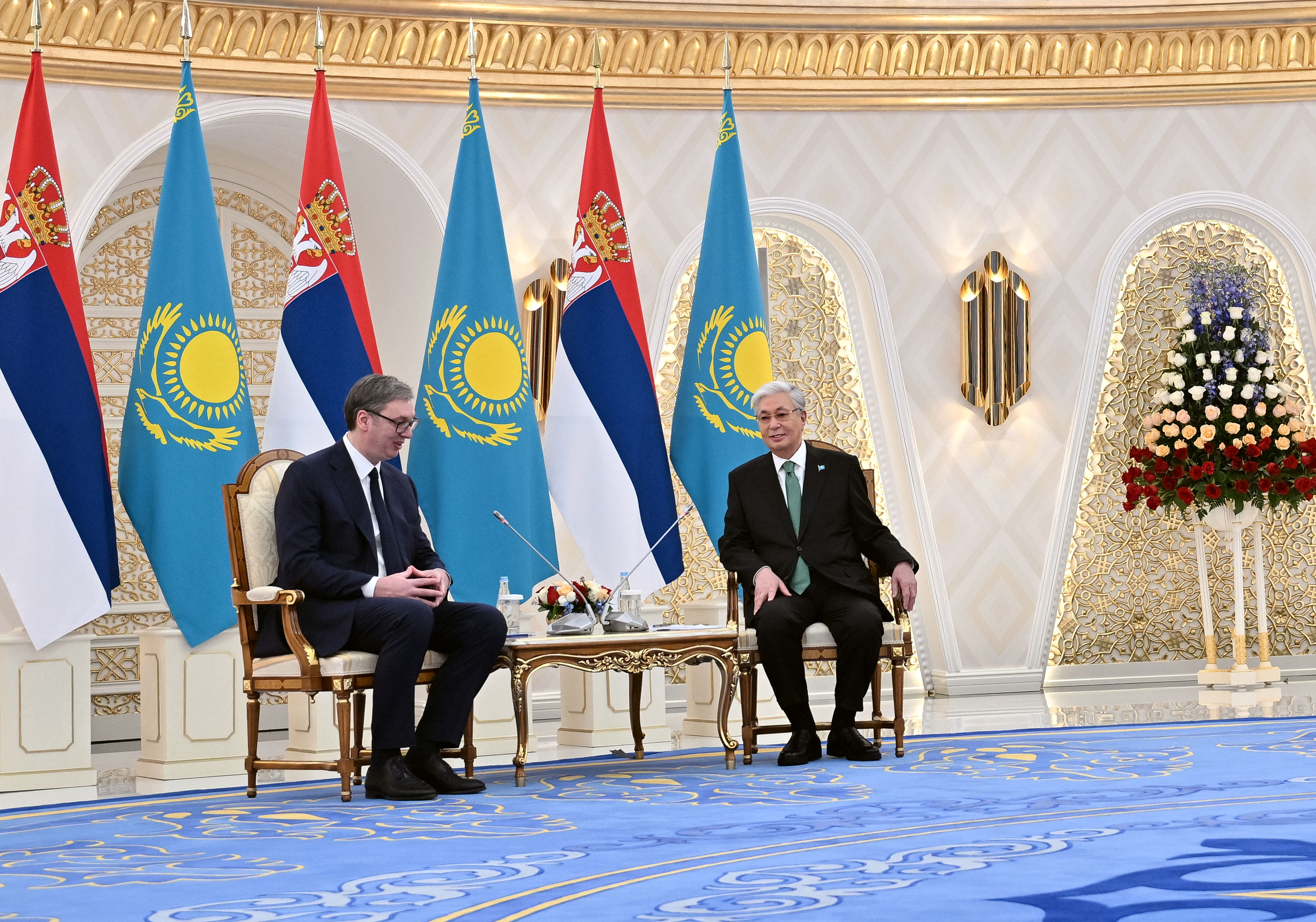 Затем президенты Казахстана и Сербии прошли в зал переговоров, где провели беседу в узком составе.