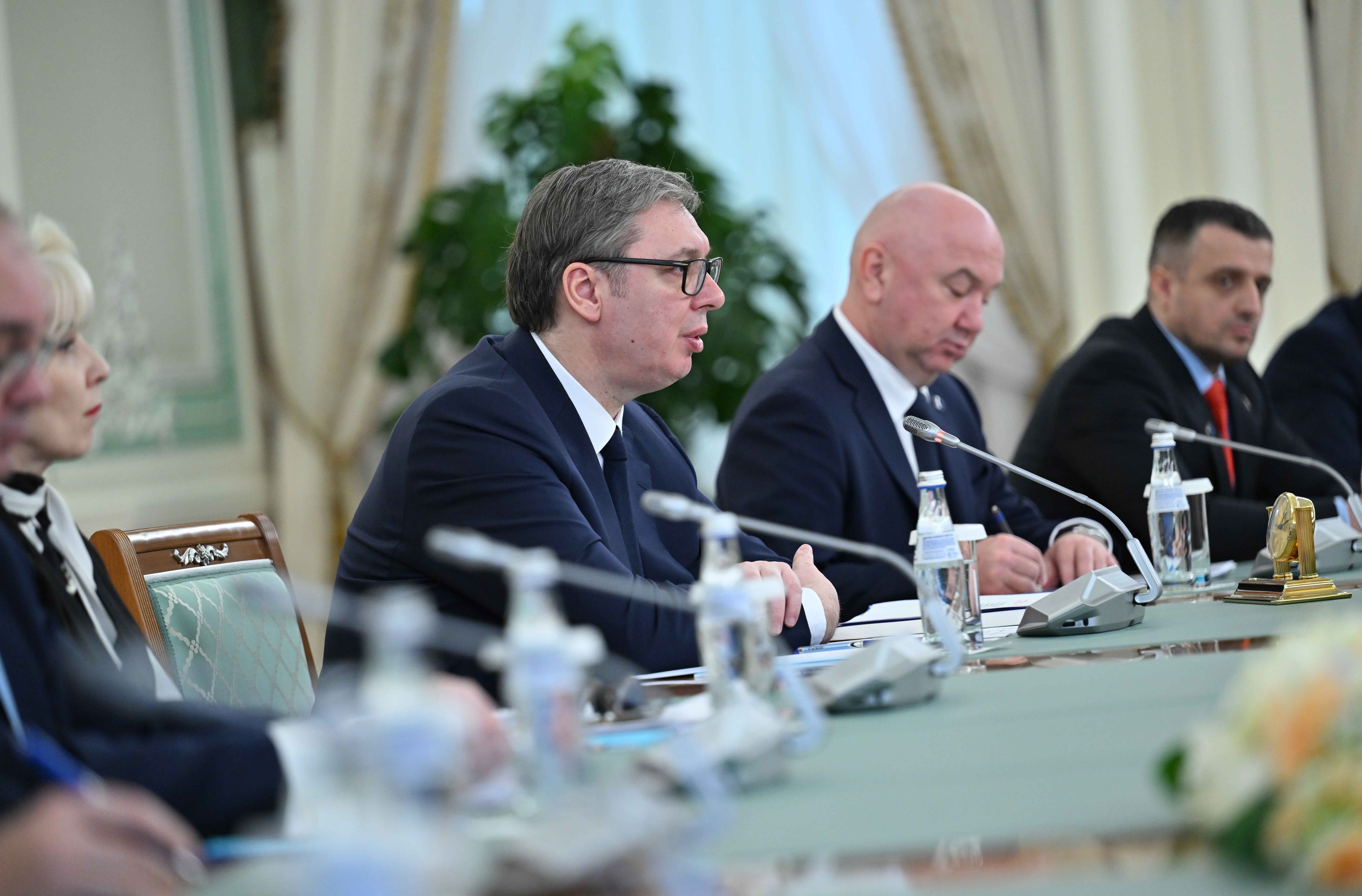 – Я благодарен за Ваше гостеприимство. Полностью разделяю Ваше мнение, что наши страны связывают по-настоящему стратегические отношения. Глубоко убежден, что Ваши слова и преданный подход к делу вносят значительный вклад в развитие наших торгово-экономических связей. Убежден, что наша дружба выйдет на новый уровень благодаря укреплению взаимодействия в сферах искусственного интеллекта, информационных технологий и энергетики. Буду рад принять Вас с визитом в Сербии в ближайшее время, – отметил он.