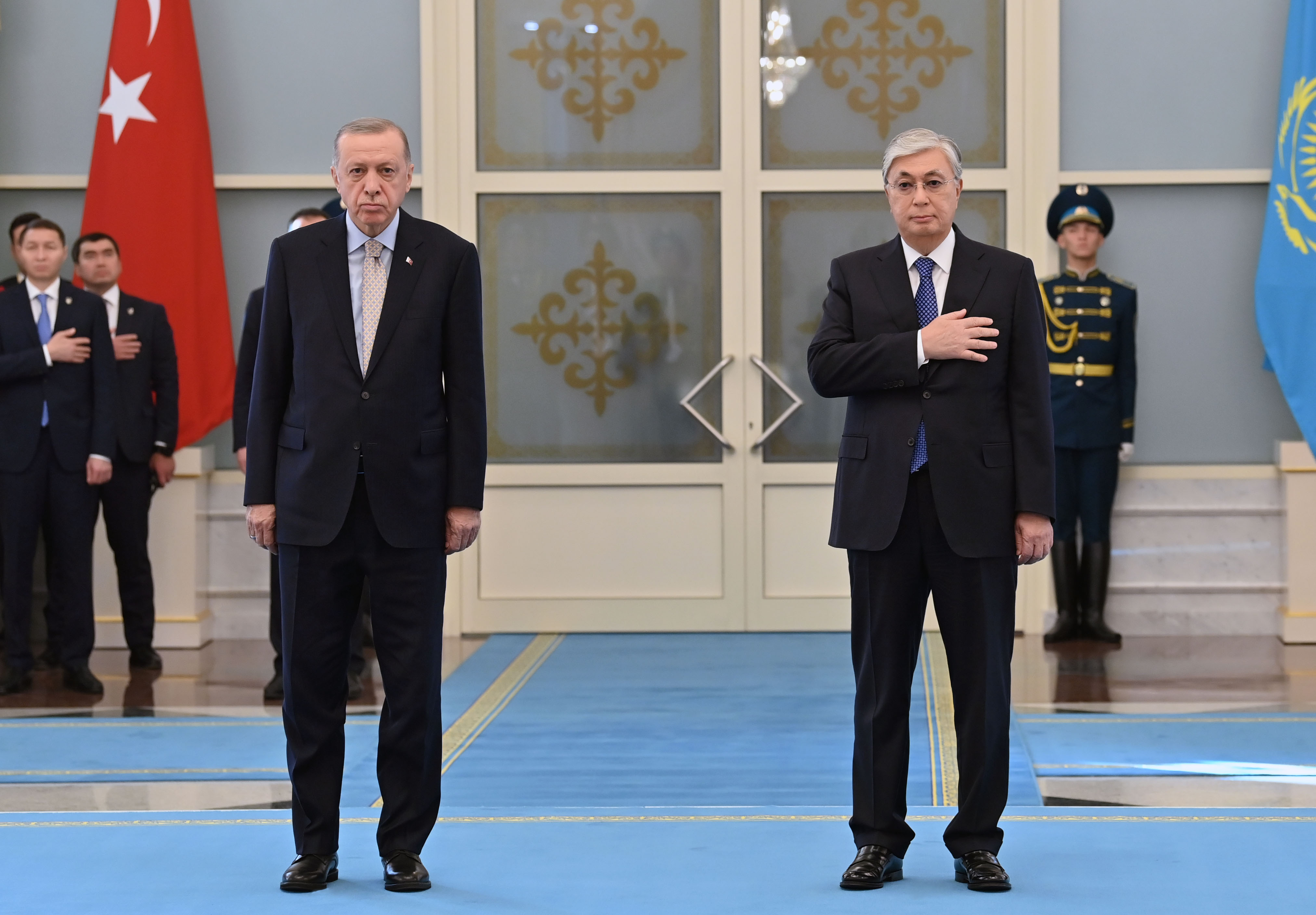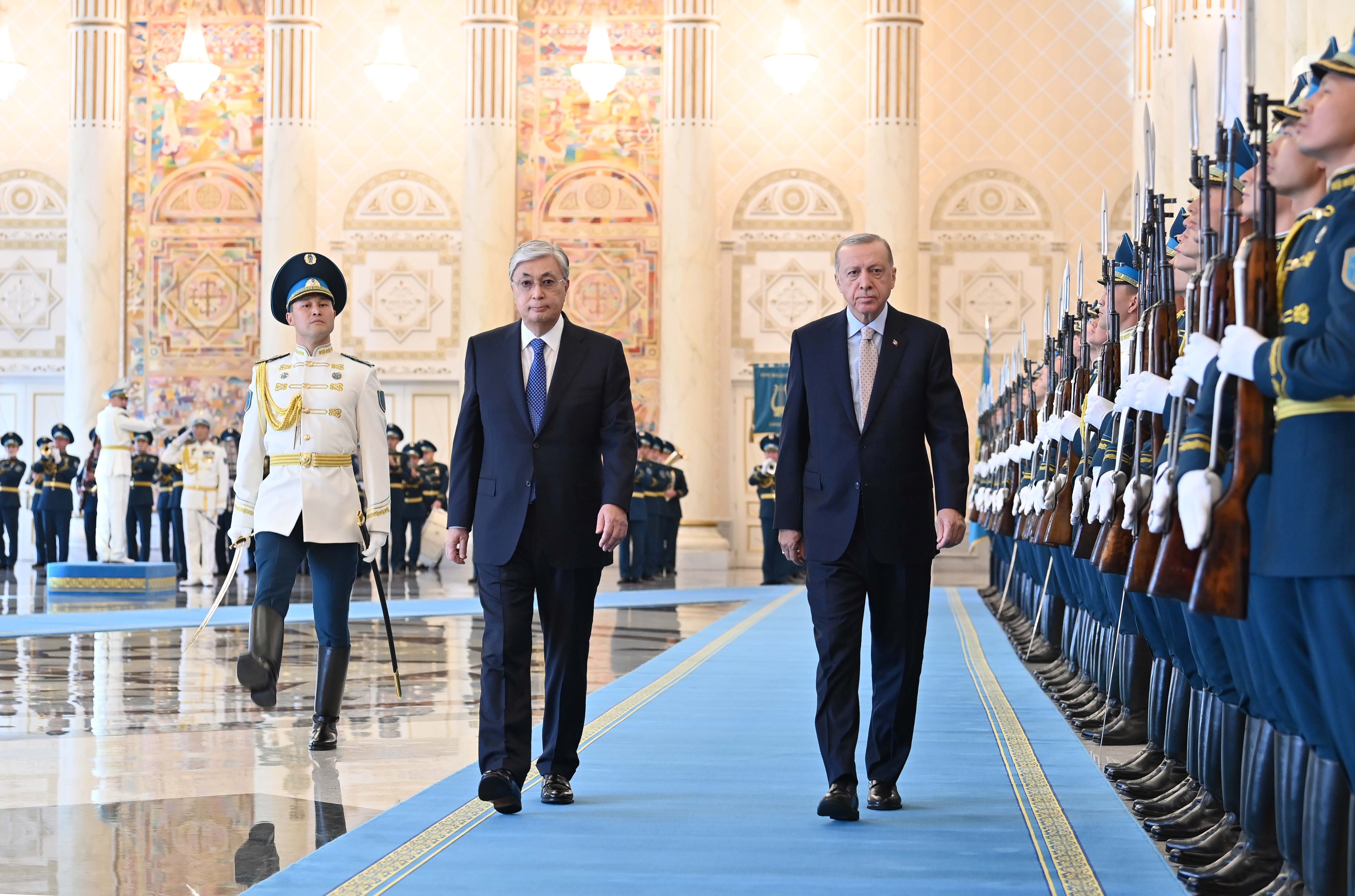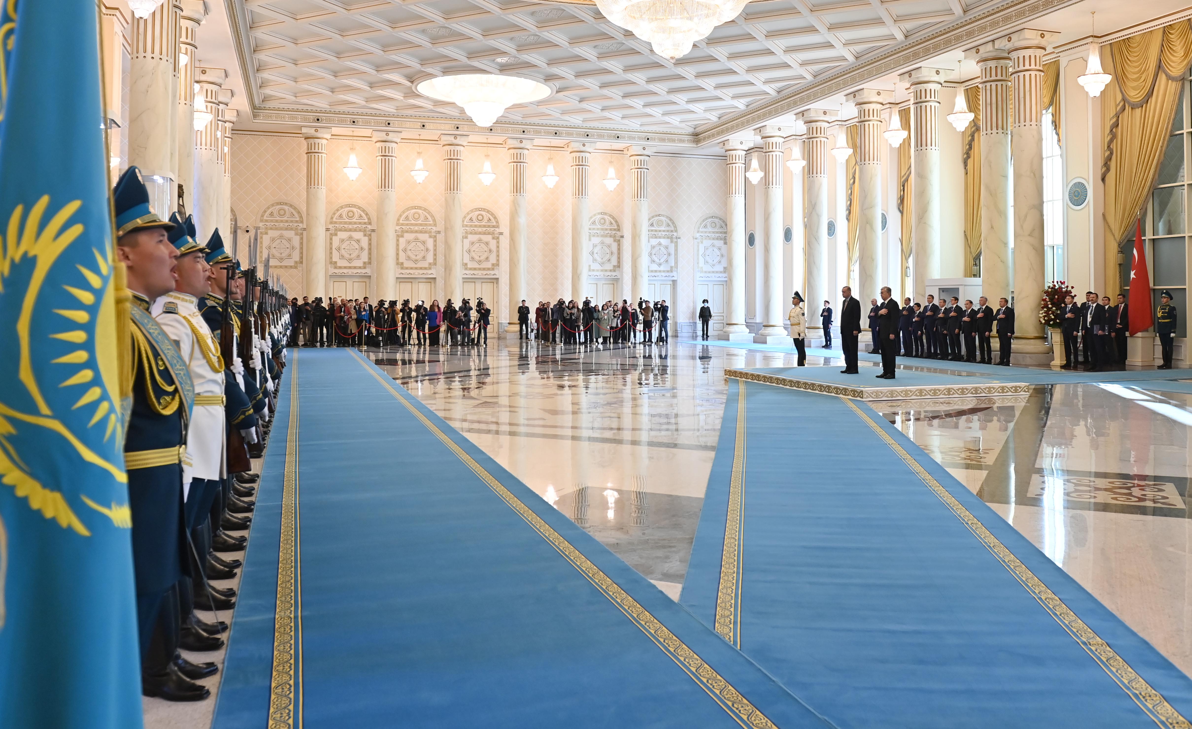 Переговорам предшествовала официальная церемония встречи Президента Турции в резиденции «Акорда». Касым-Жомарт Токаев и Реджеп Тайип Эрдоган представили друг другу членов официальных делегаций. Начальник роты Почетного караула отдал приветственный рапорт лидерам двух стран, затем прозвучали государственные гимны Казахстана и Турции. После церемонии состоялась встреча глав государств.